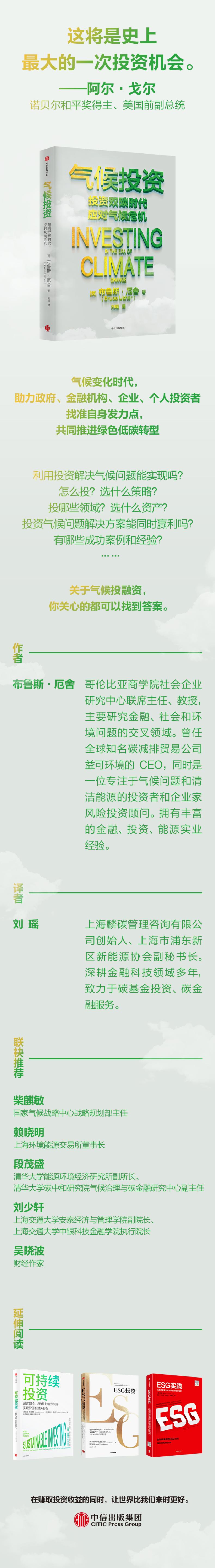 气候变化时代个人与机构的投资实践指南。当前,全球范围内已经意识到气候问题带来的“毁灭性”危机,也陆续提出了很多解决方案。但是,解决方案实施的规模、速度、效果,需要巨大的资本投入,据估计,至2050年需要125万亿美元,且70%依赖于私营部门的资金。关注气候问题及其解决方案,将赋予投资者全新看待财富与未来的视角,这是气候危机给全球投资者带来的时代红利。