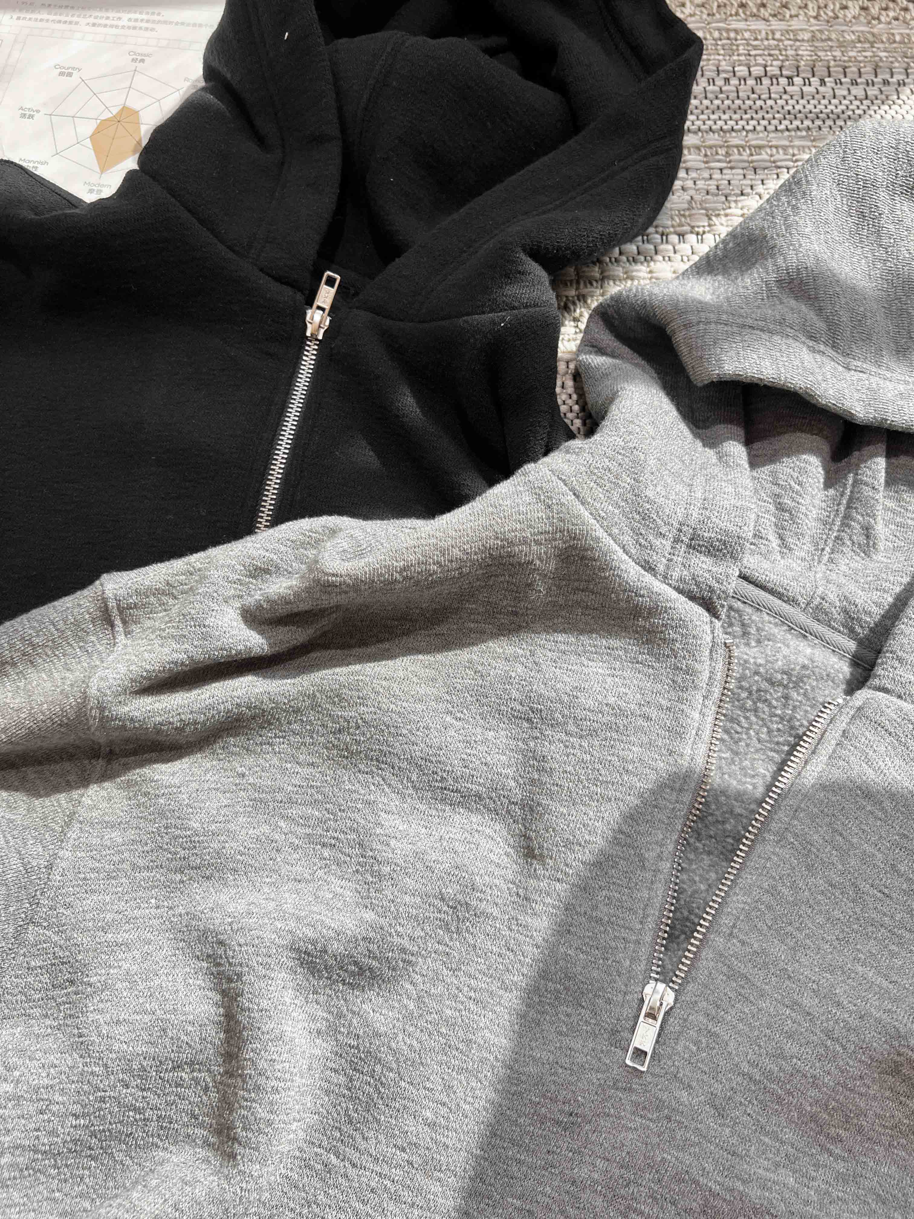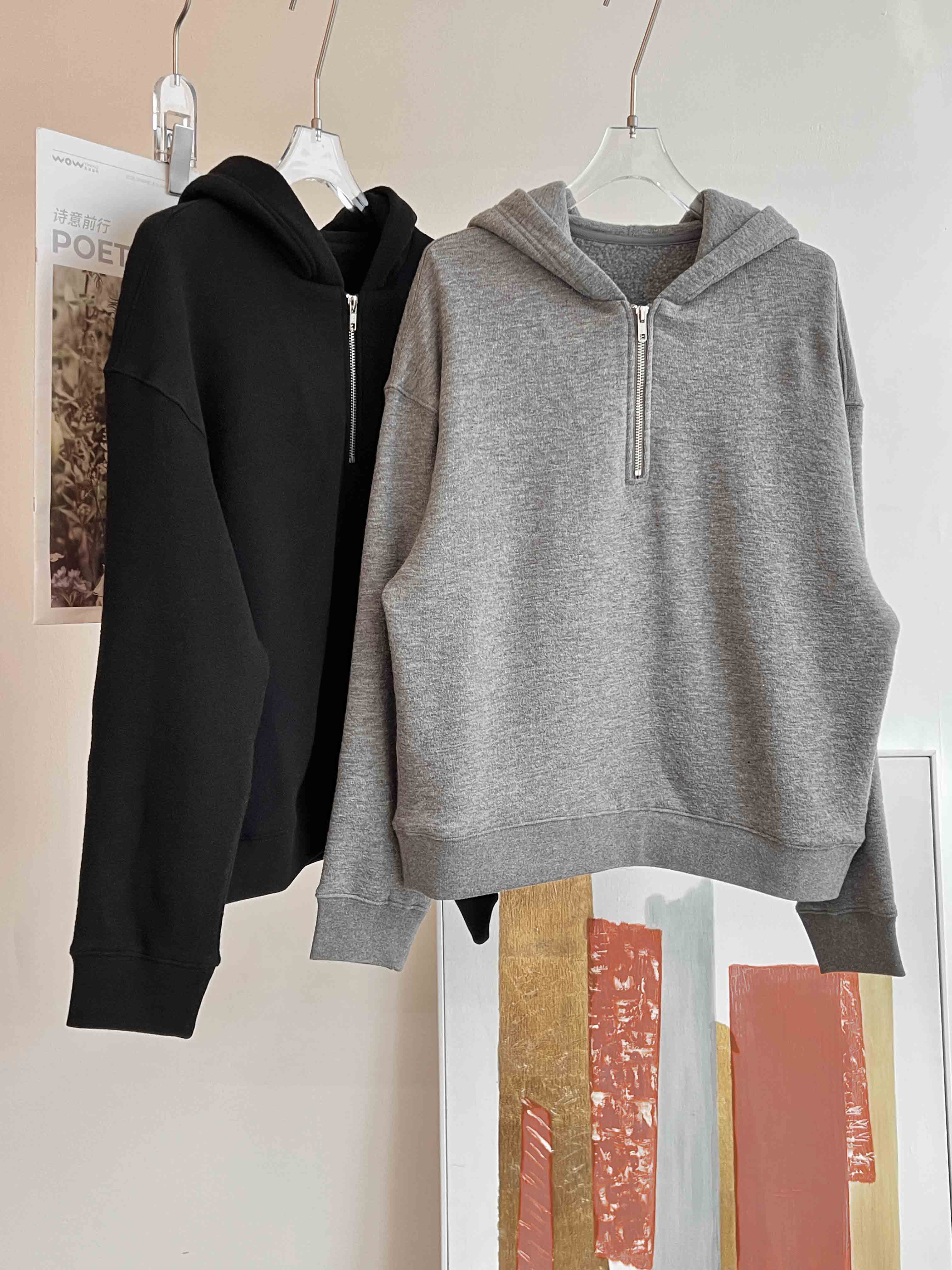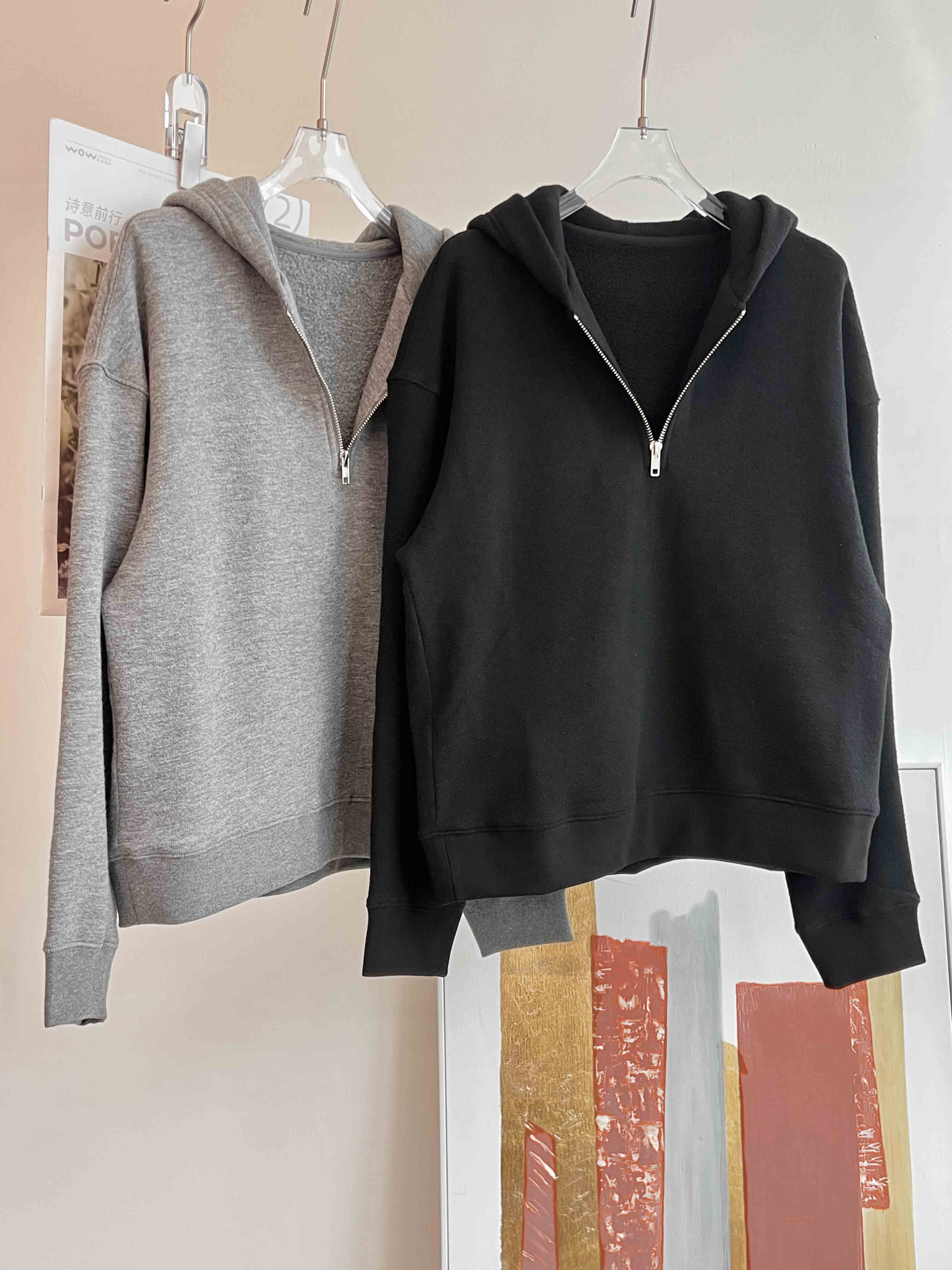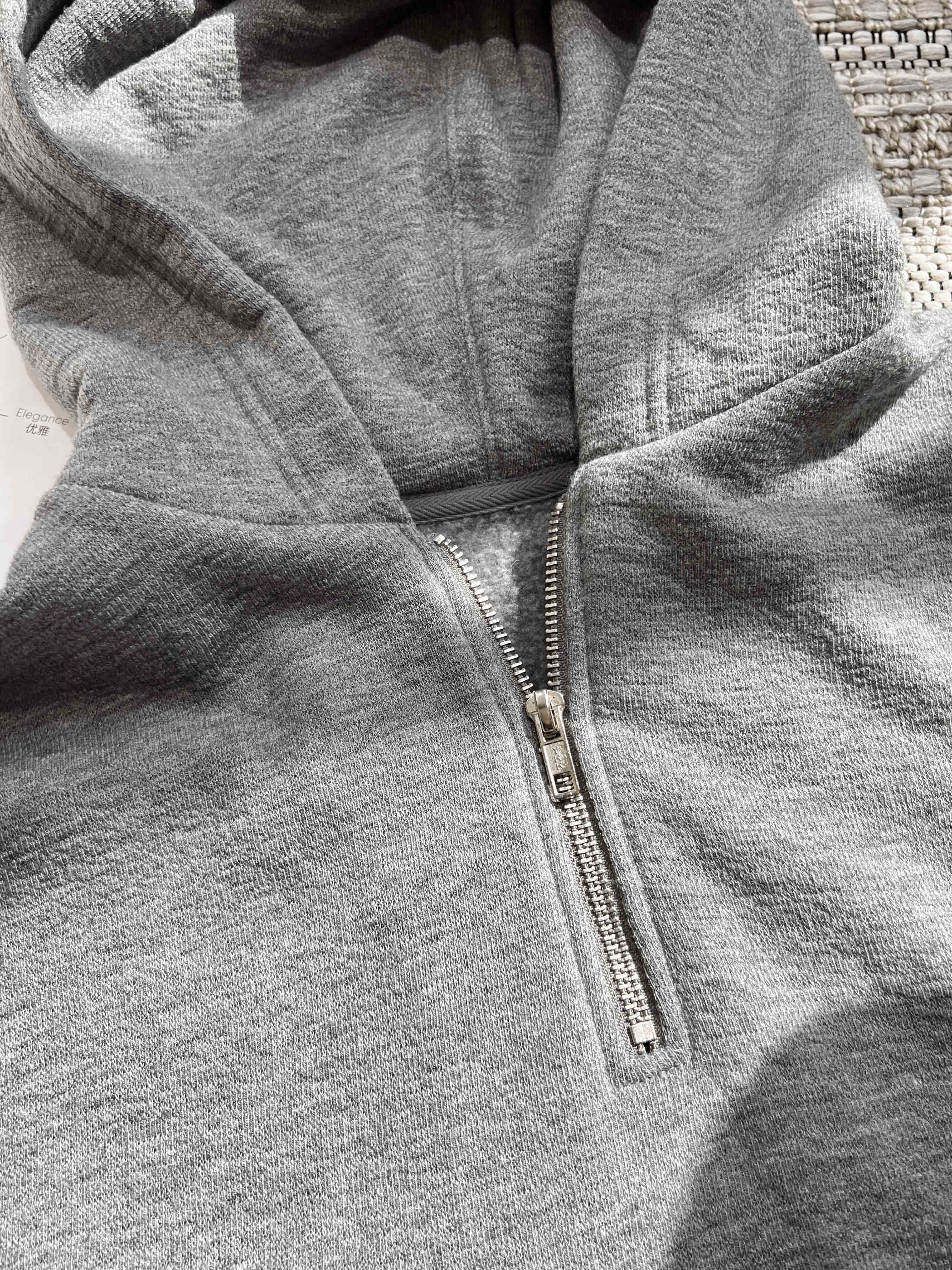羊毛天丝半开拉链连帽套头卫衣·灰色/黑色,自带运动感