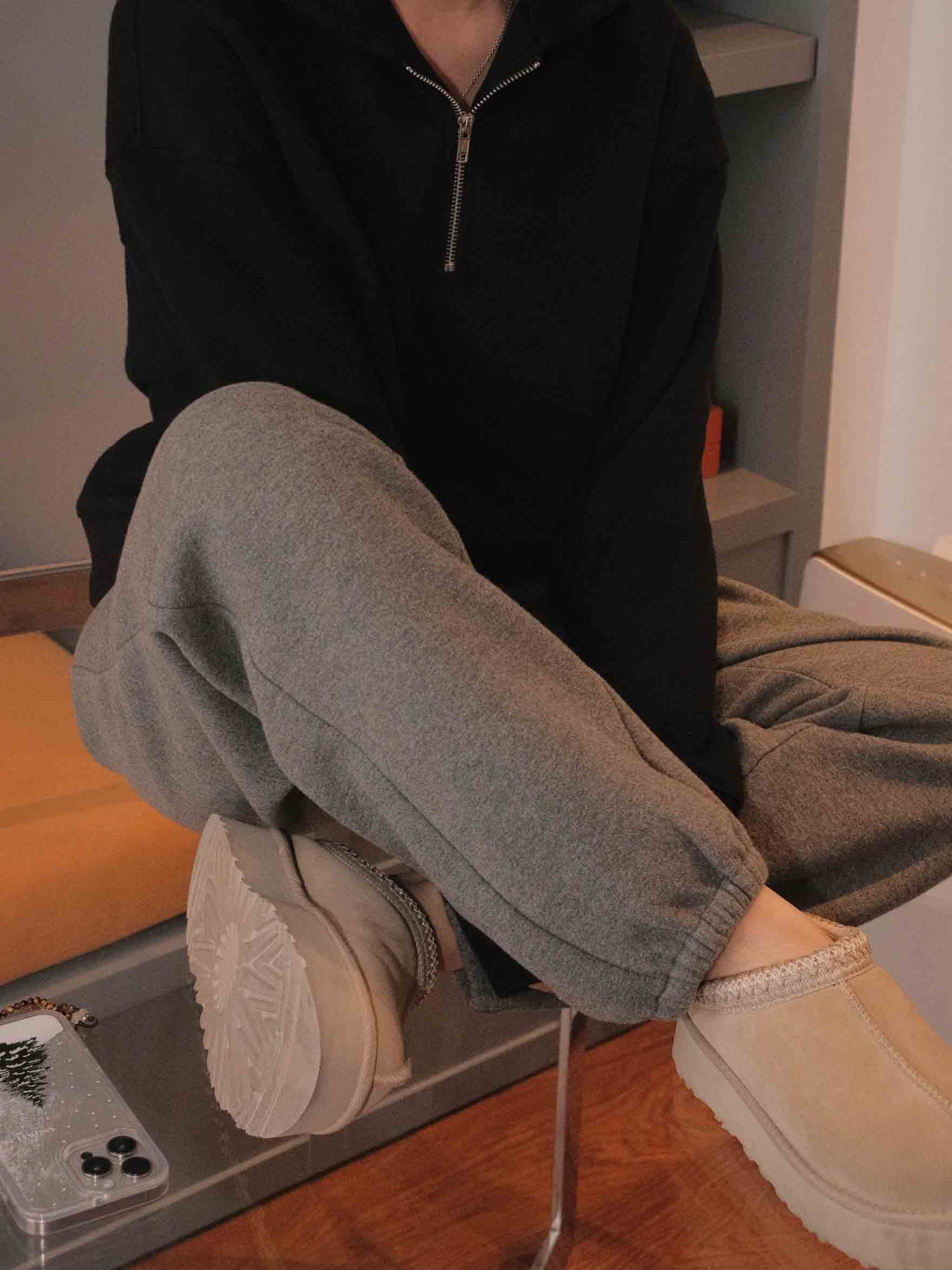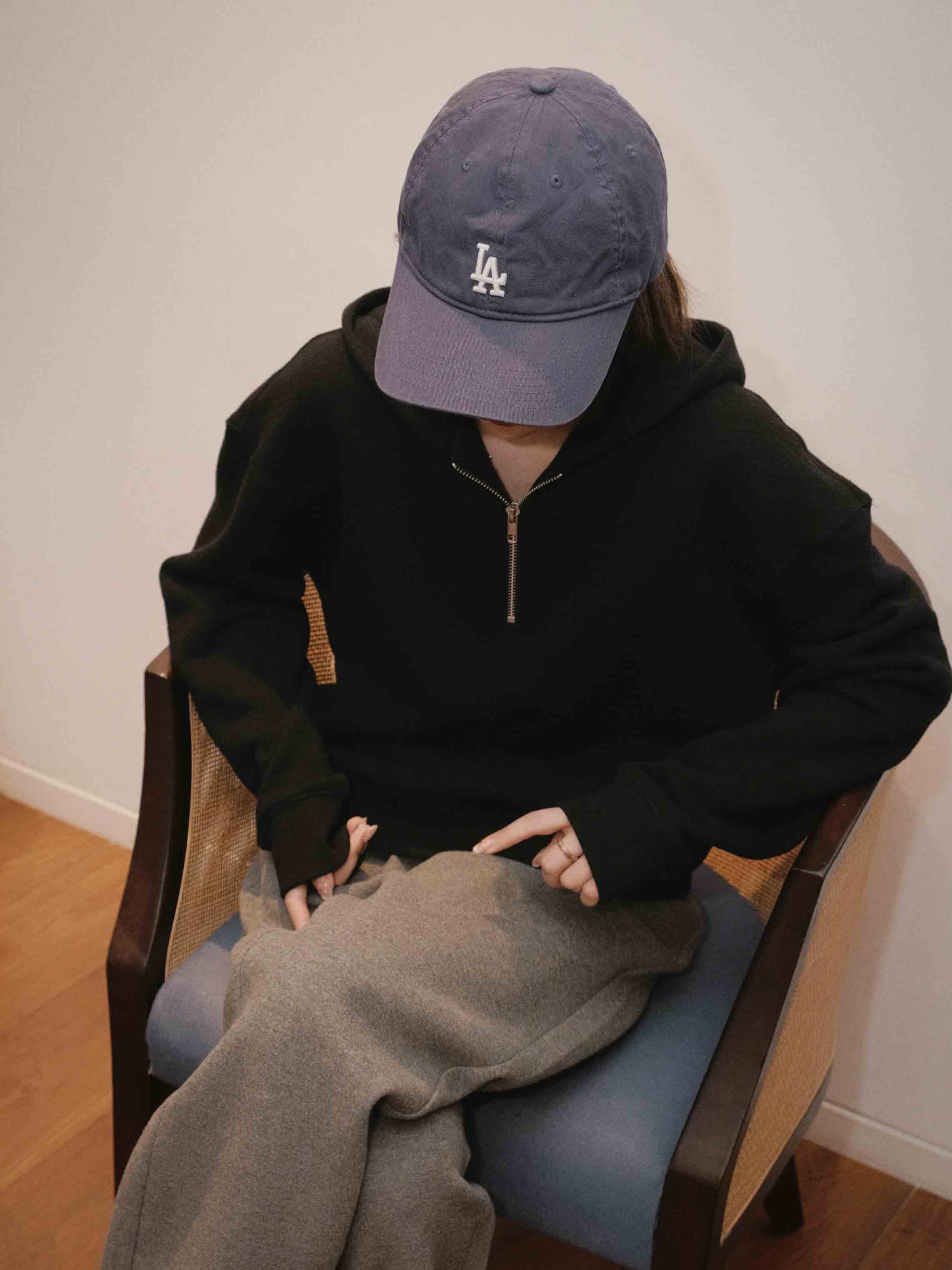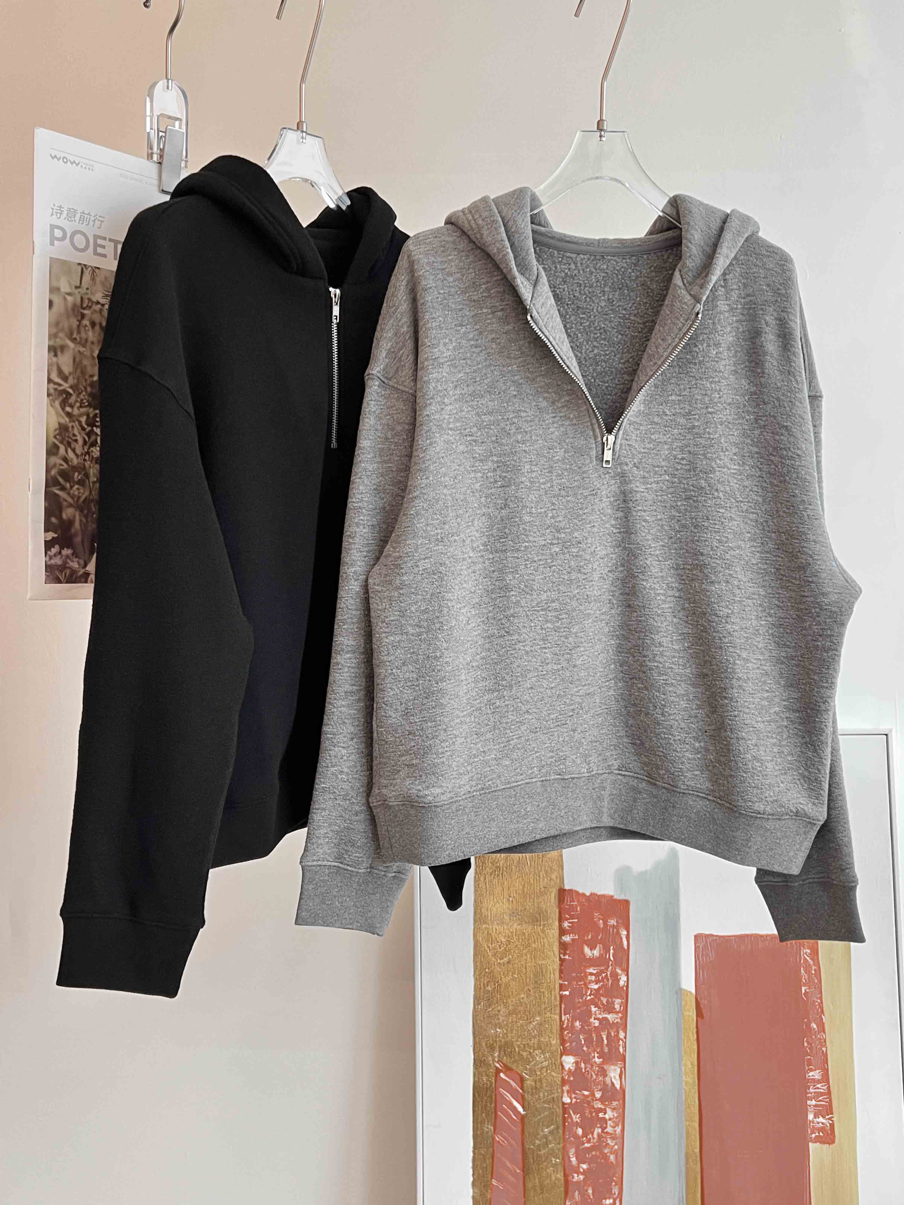 羊毛天丝半开拉链连帽套头卫衣·灰色/黑色,自带运动感
