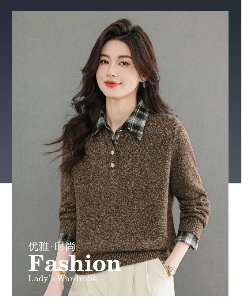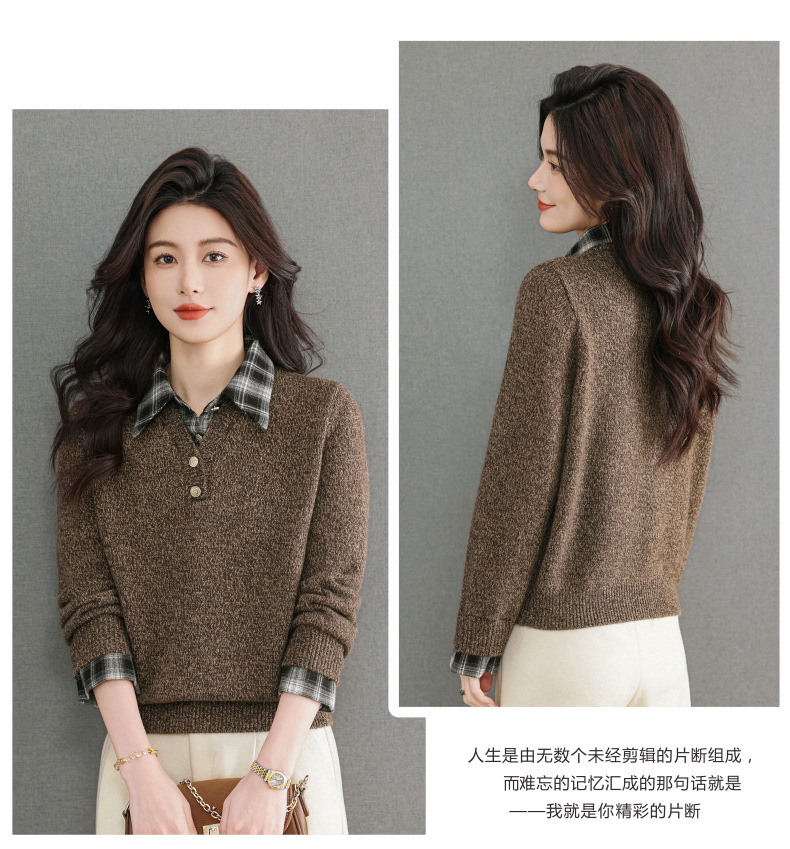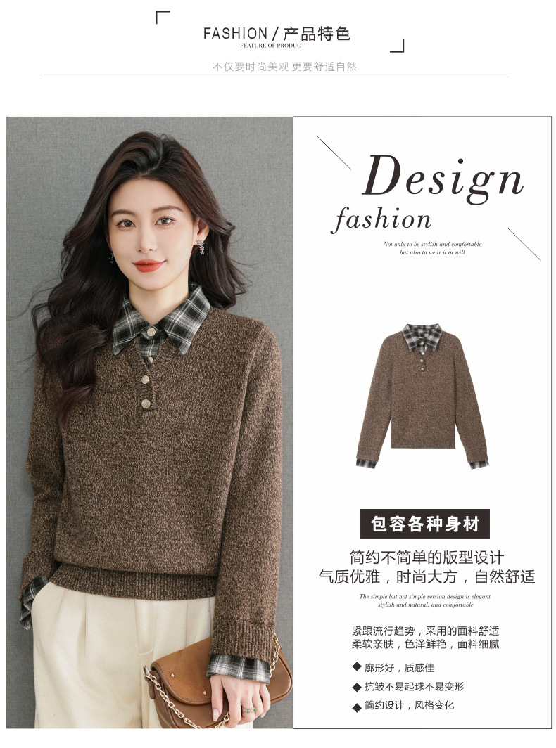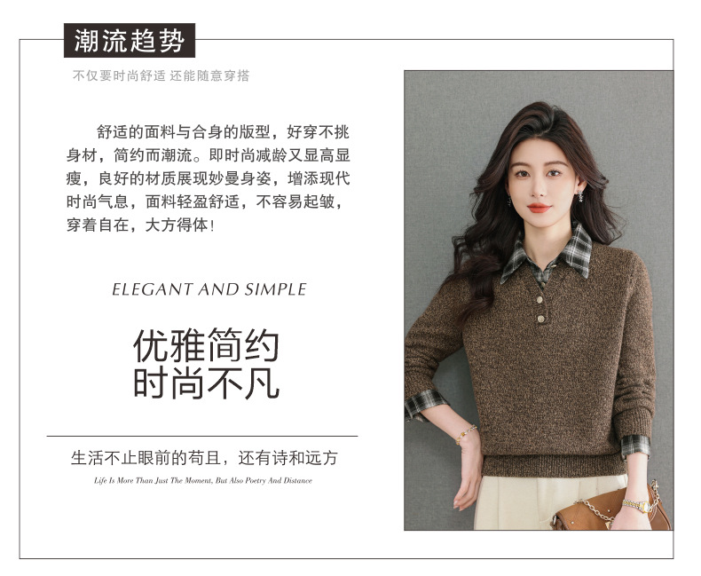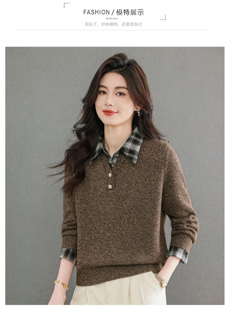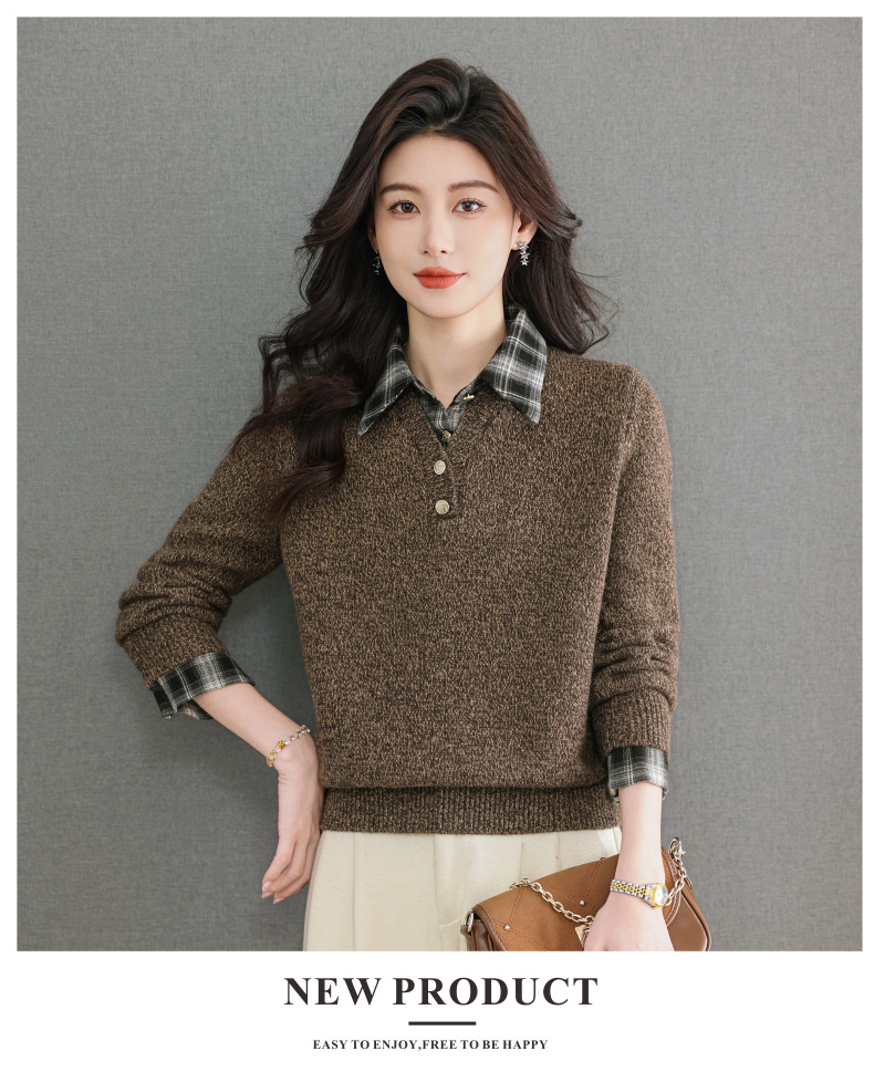 CC优雅通勤棕色格纹领拼接Polo毛衣女秋冬毛绒质感宽松显瘦针织上衣
