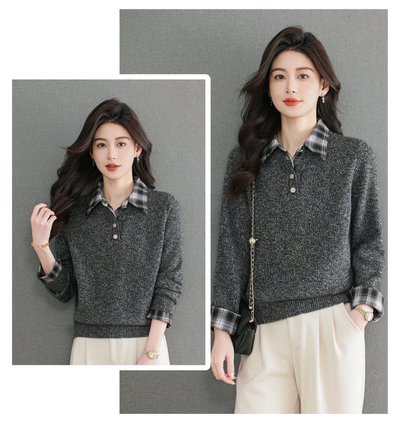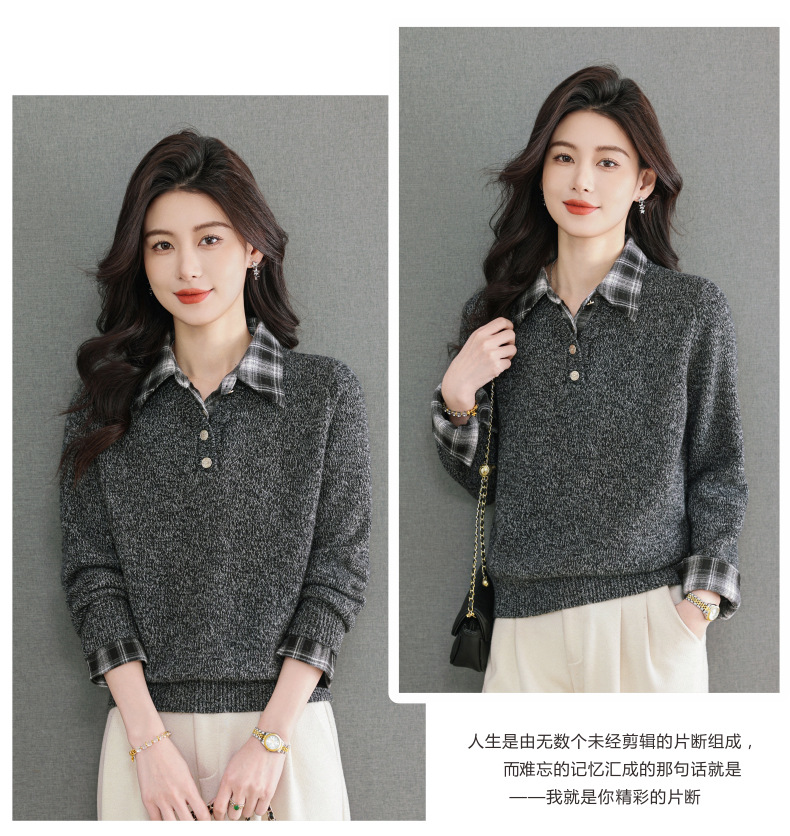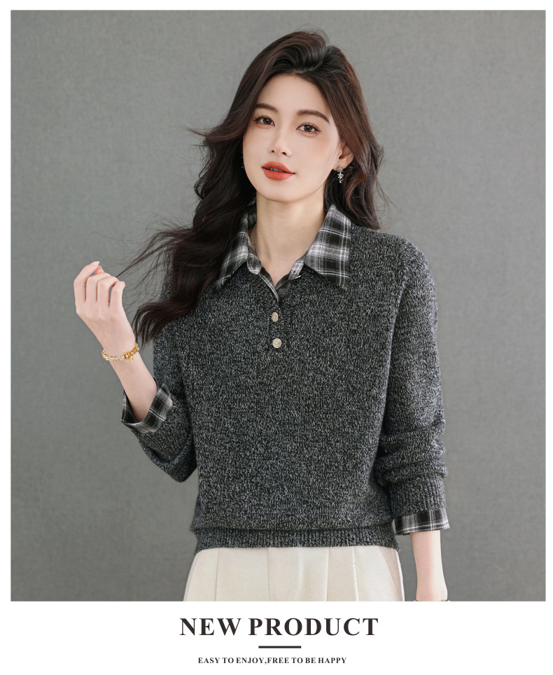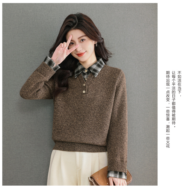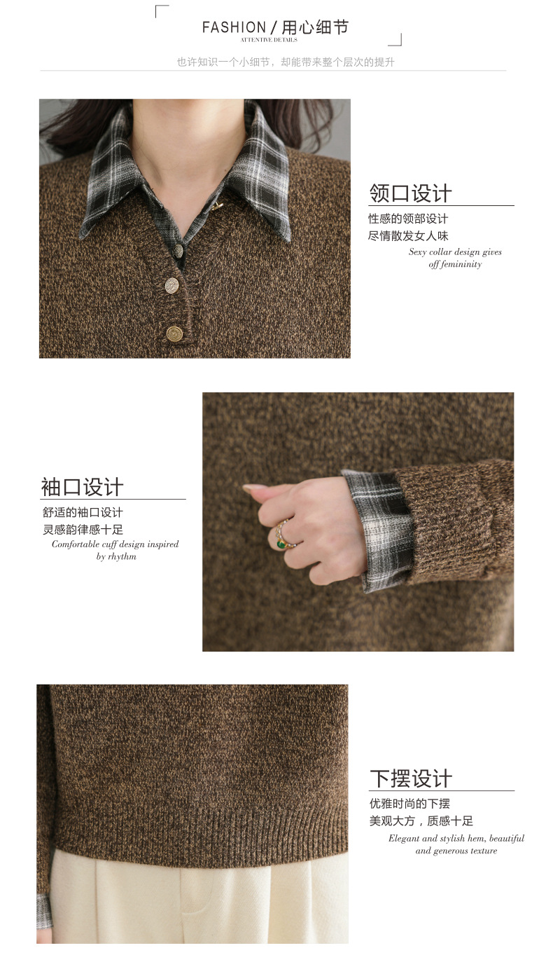 CC优雅通勤棕色格纹领拼接Polo毛衣女秋冬毛绒质感宽松显瘦针织上衣
