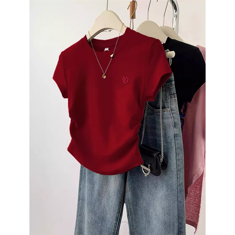 丁摩 红色爱心刺绣短款正肩短袖t恤女夏季新款设计感修身显瘦上衣5ZF-D44