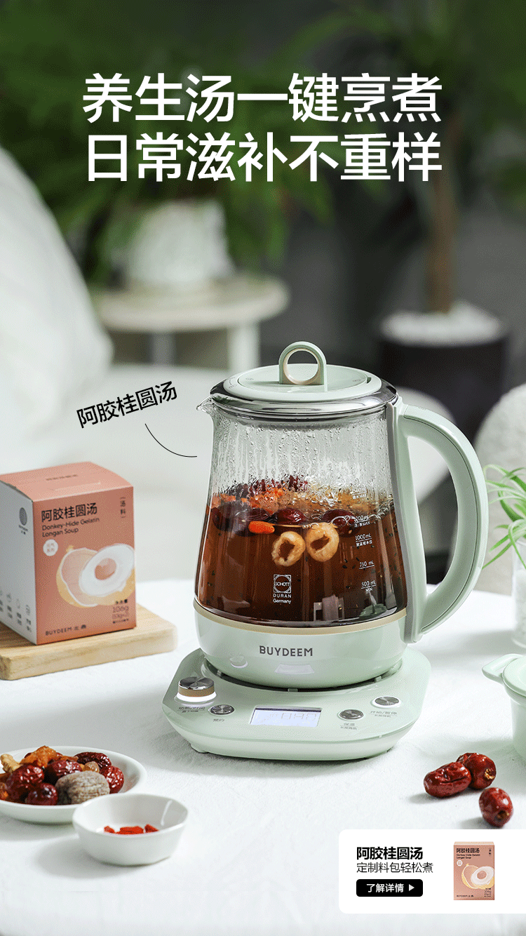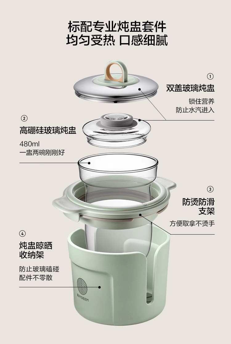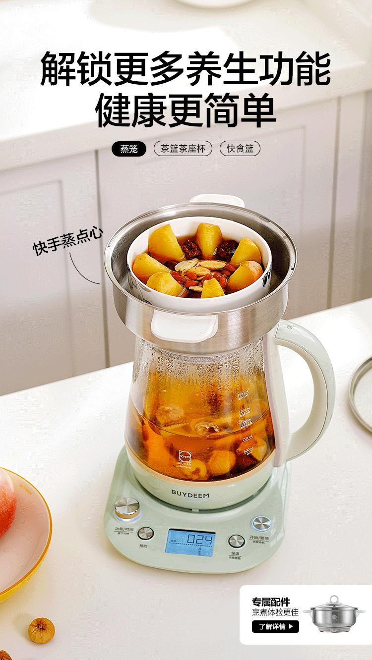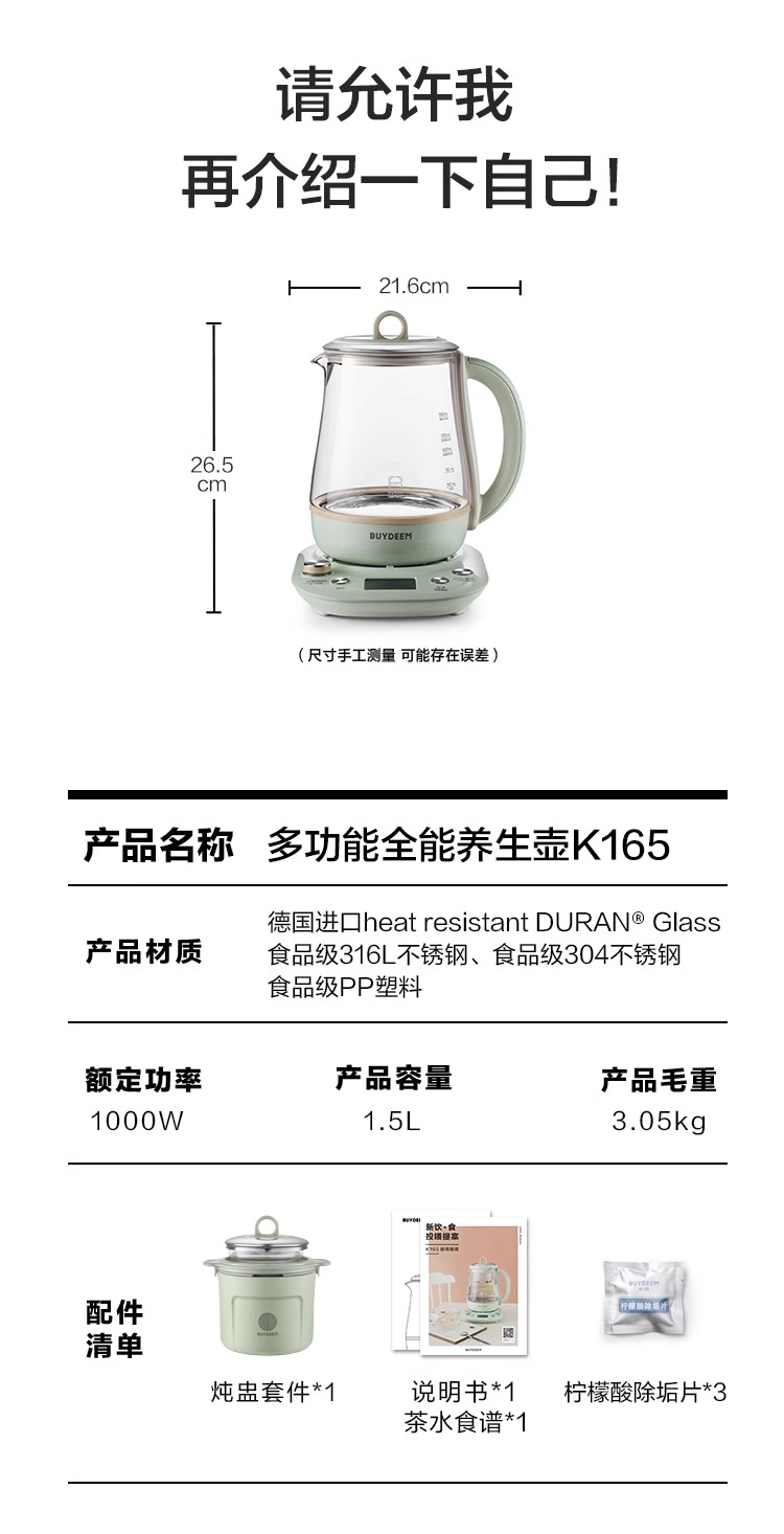 北鼎全自动多功能养生壶K165浅杉绿配炖盅