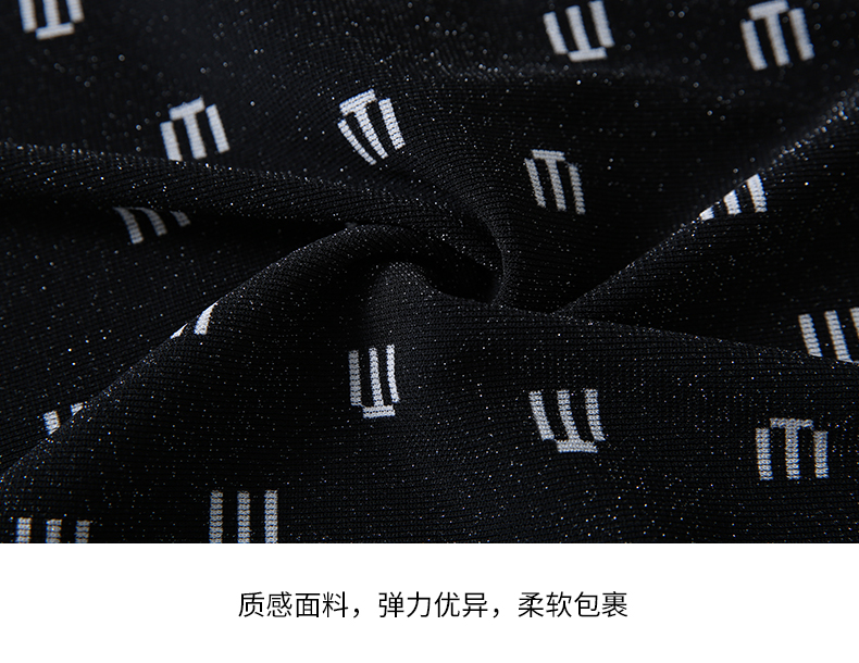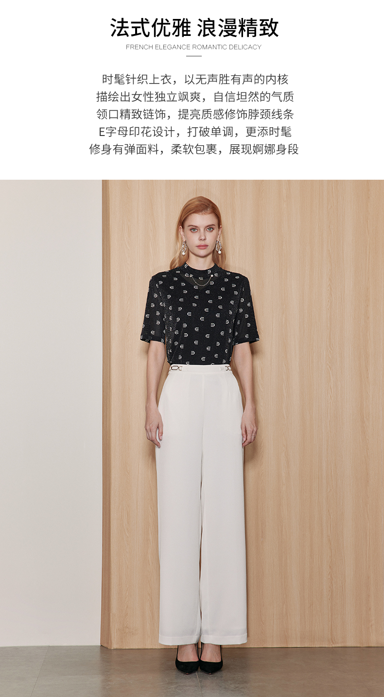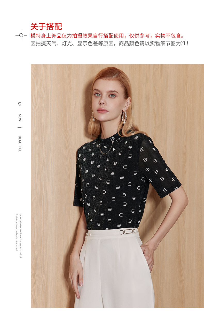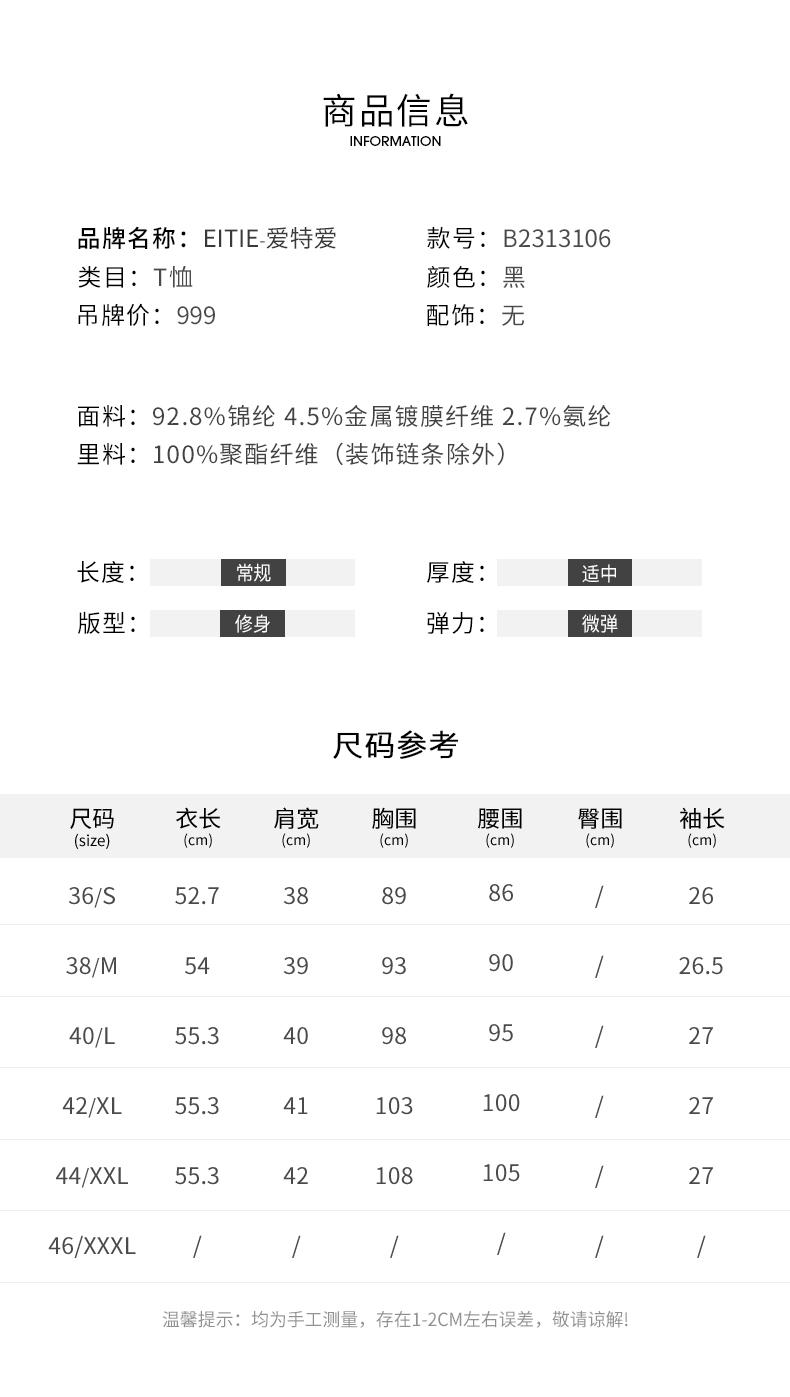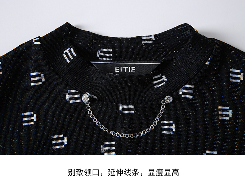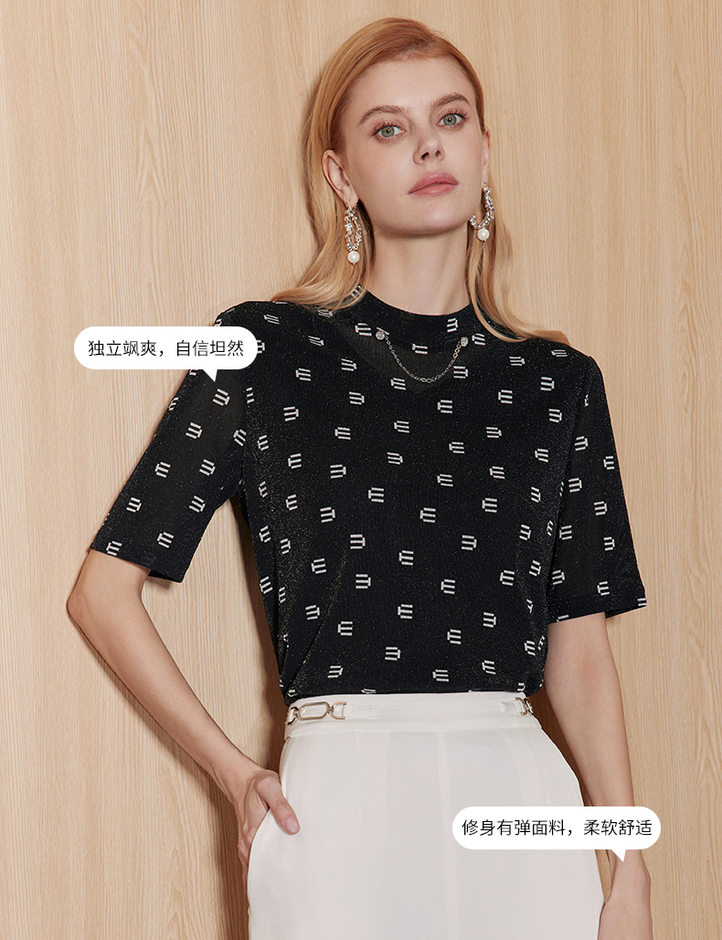 EITIE爱特爱夏新款气质半高领字母印花金丝短袖针织显瘦T恤上衣A2313107