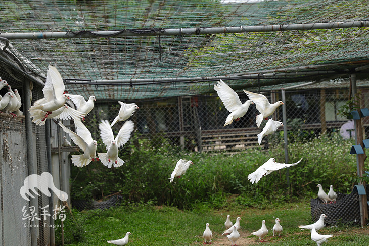 鸽子不像一般肉鸽完全笼养,我们为他们围起了一片区域让他们可以飞翔活动,捡食草籽砂石等。