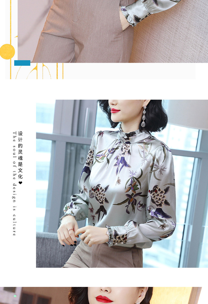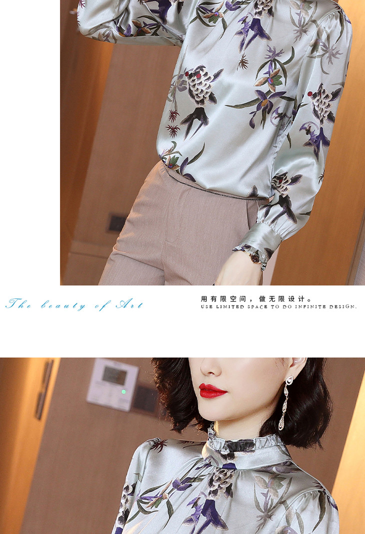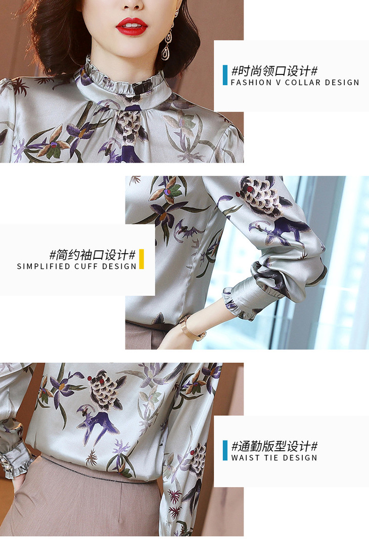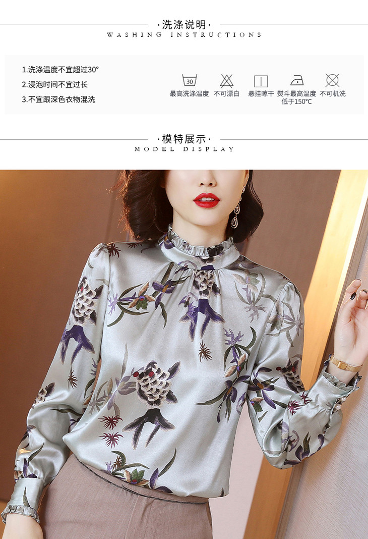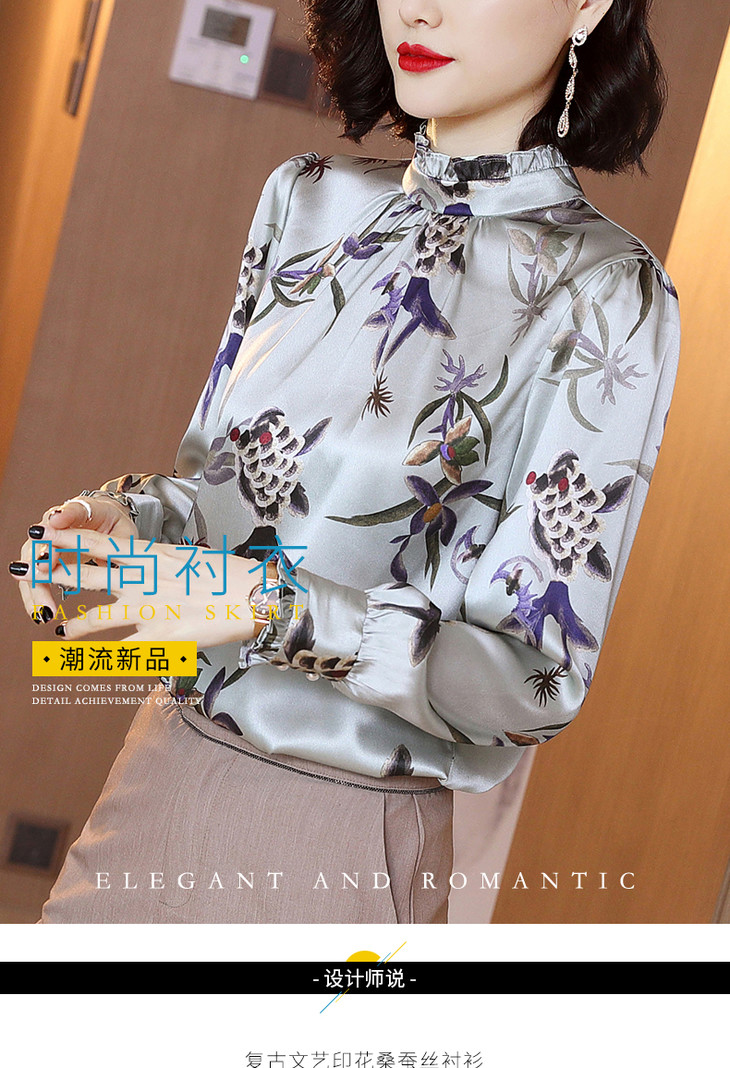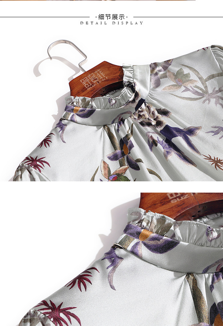 HT 6952 新款木耳边立领修身印花衬衣2019