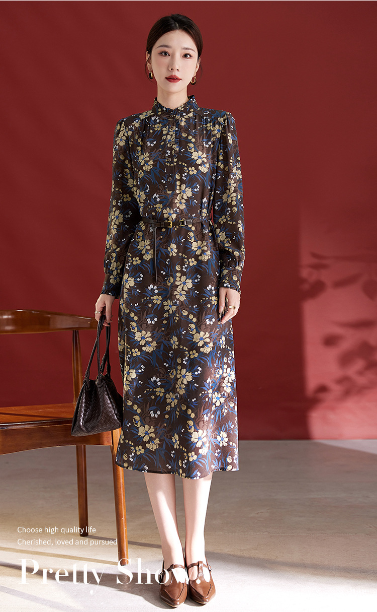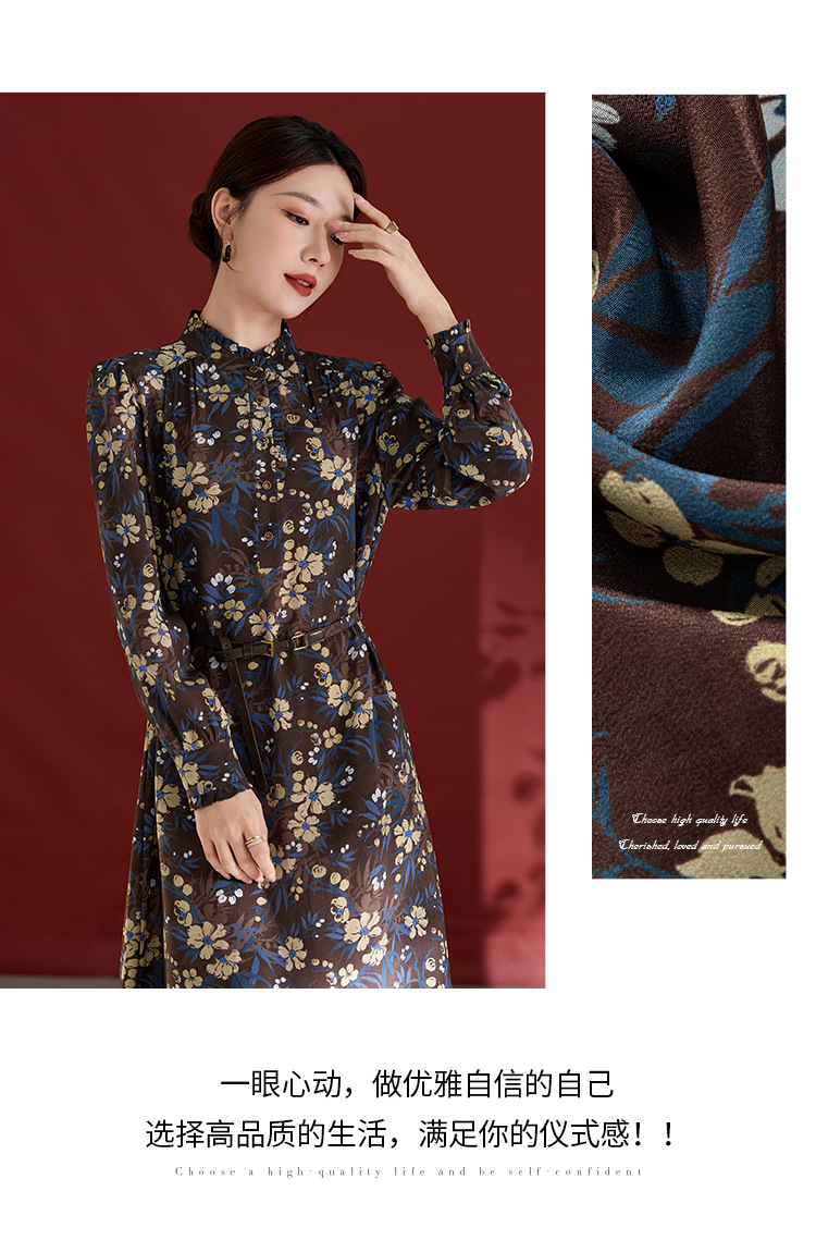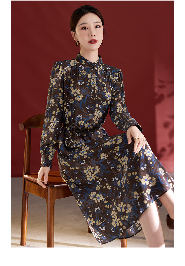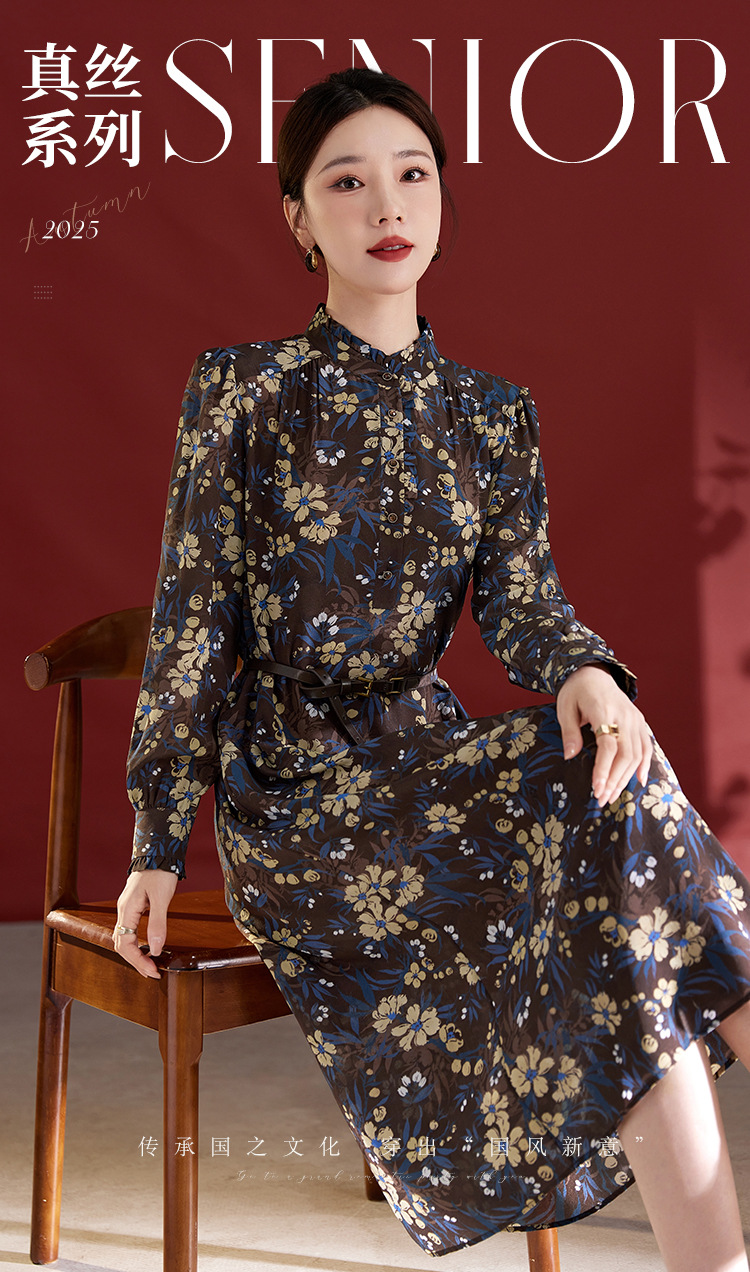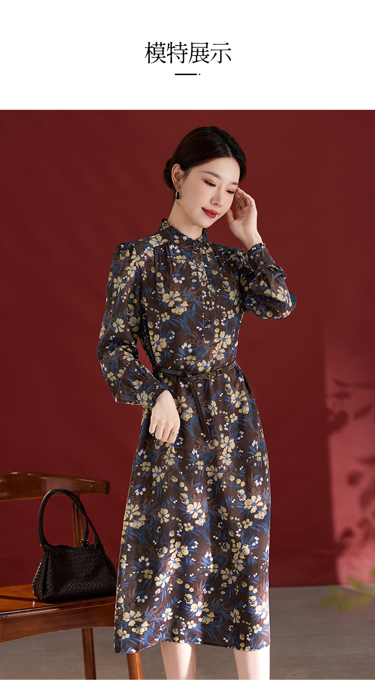 QS真丝连衣裙女100蚕丝长袖气质褶皱显瘦款印花中长款82501815
