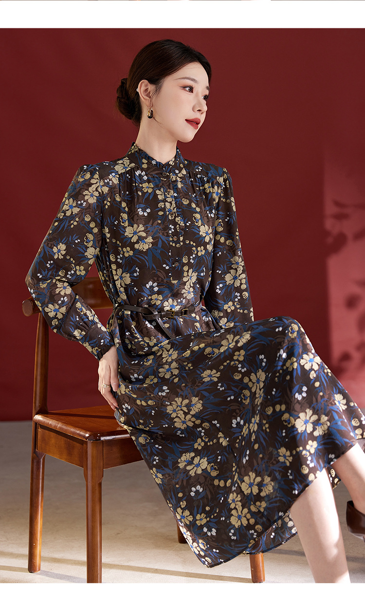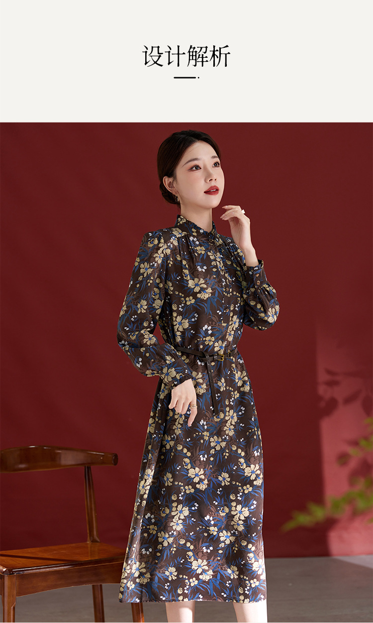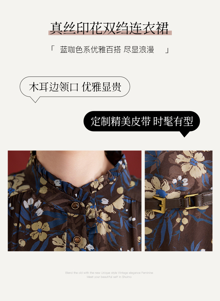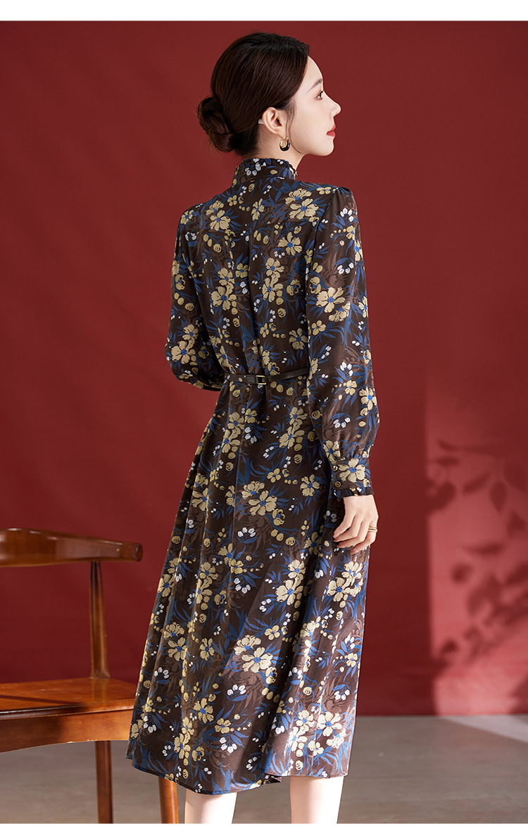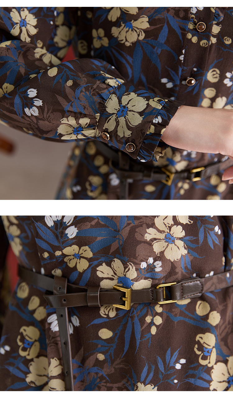 QS真丝连衣裙女100蚕丝长袖气质褶皱显瘦款印花中长款82501815