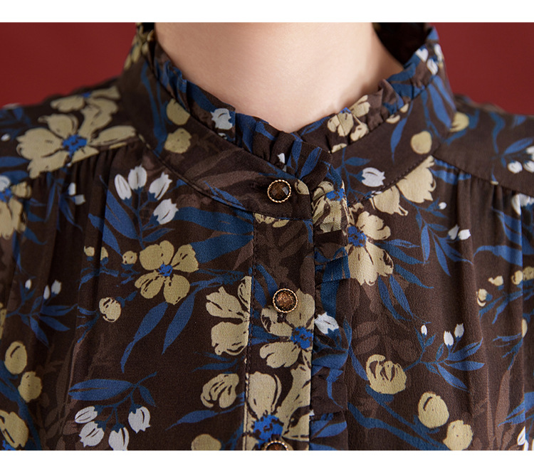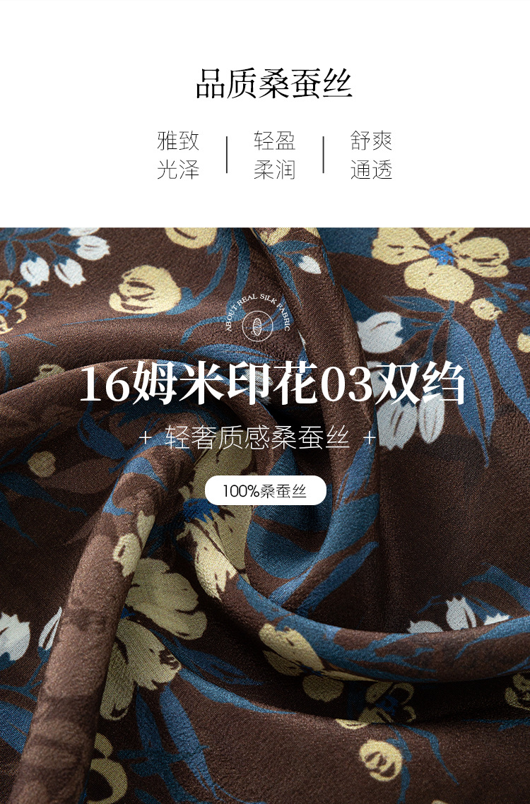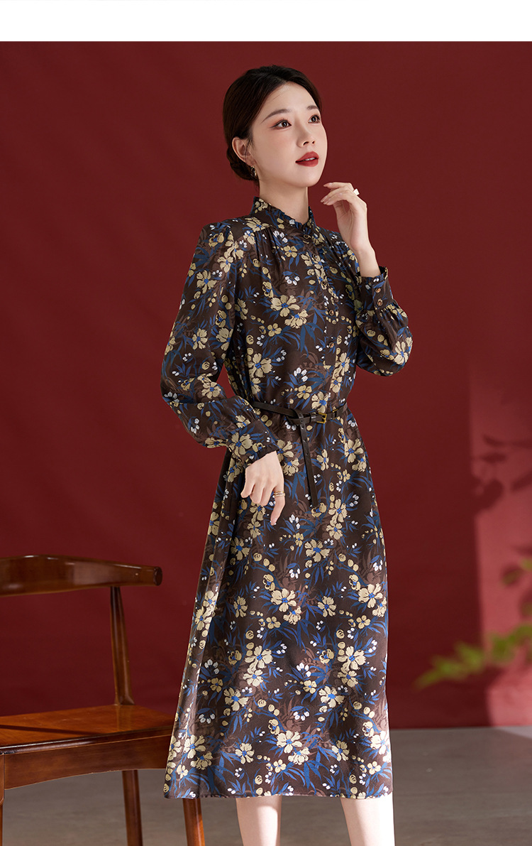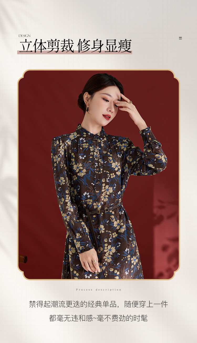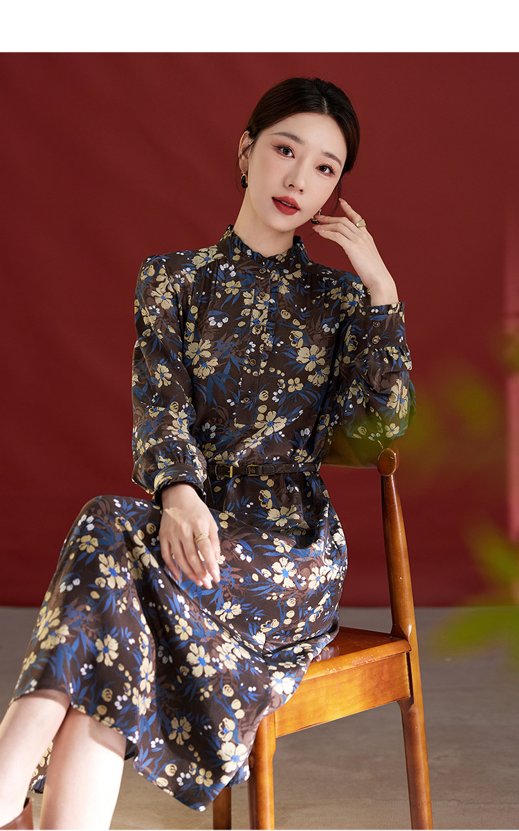 QS真丝连衣裙女100蚕丝长袖气质褶皱显瘦款印花中长款82501815