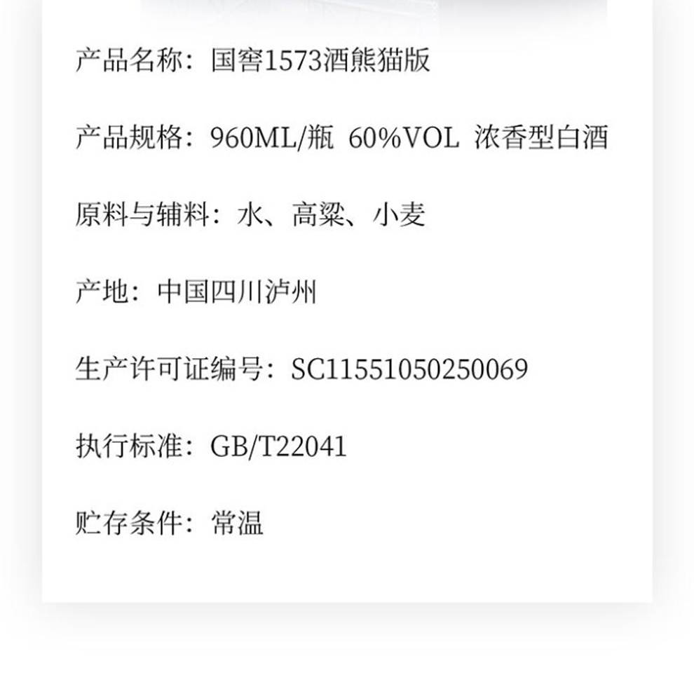 泸州老窖 国窖1573 官方熊猫版白酒 60度度960ml单瓶