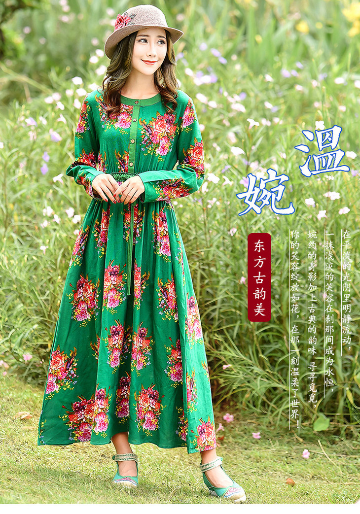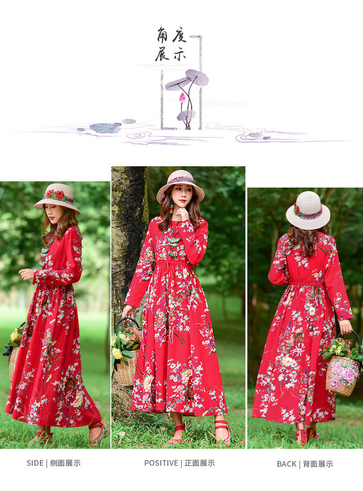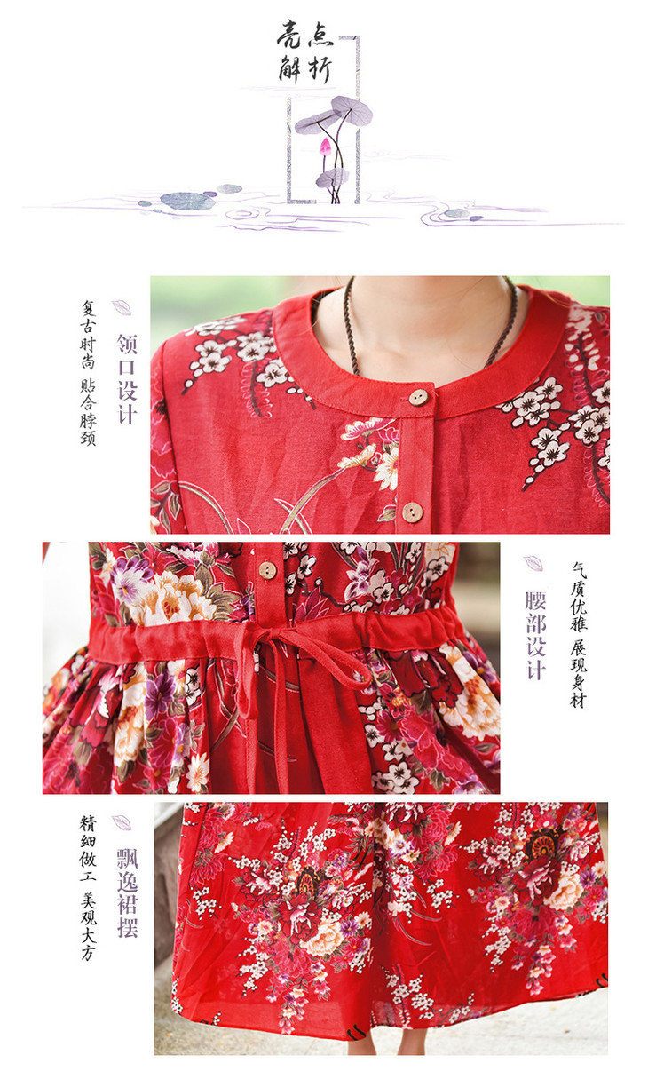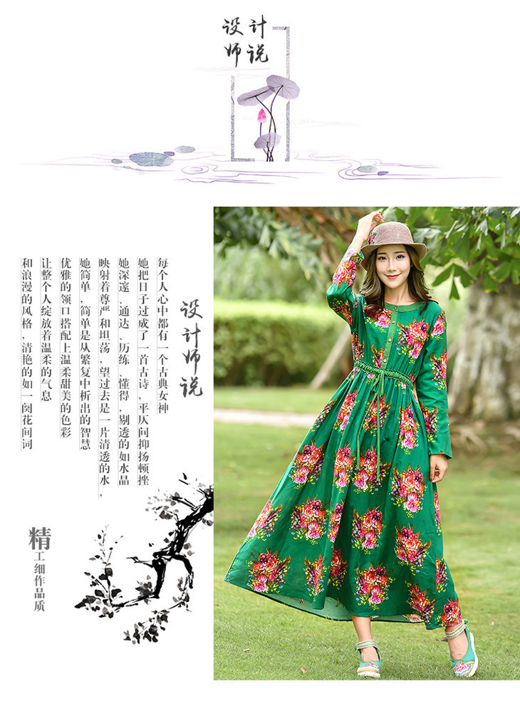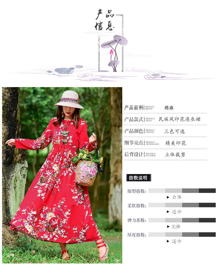 YFP 民族风印花棉麻收腰修身气质休闲复古连衣裙