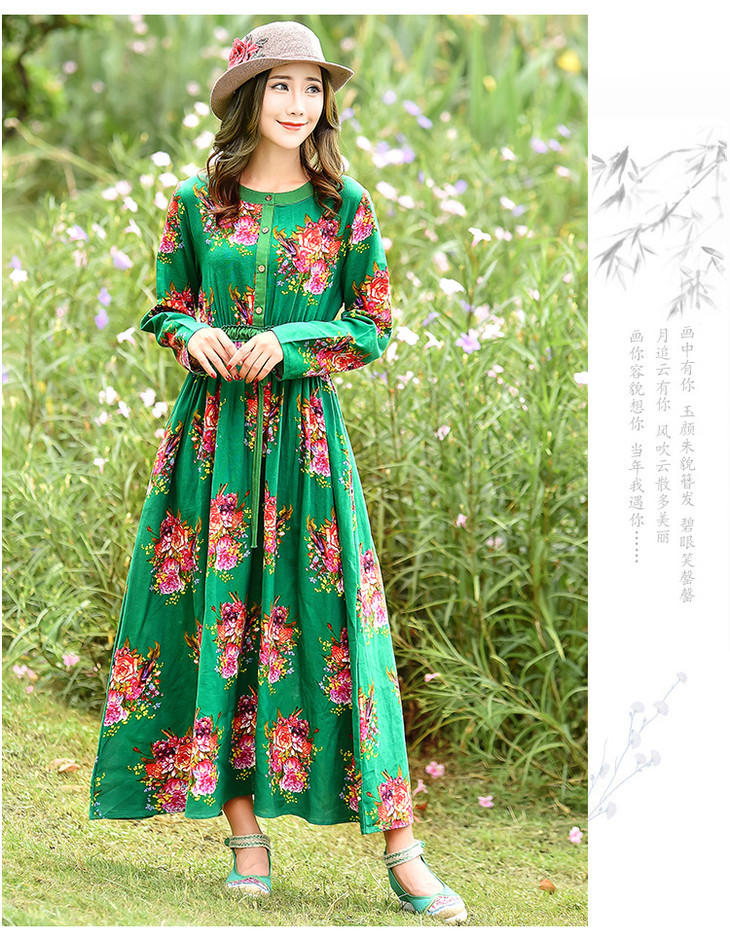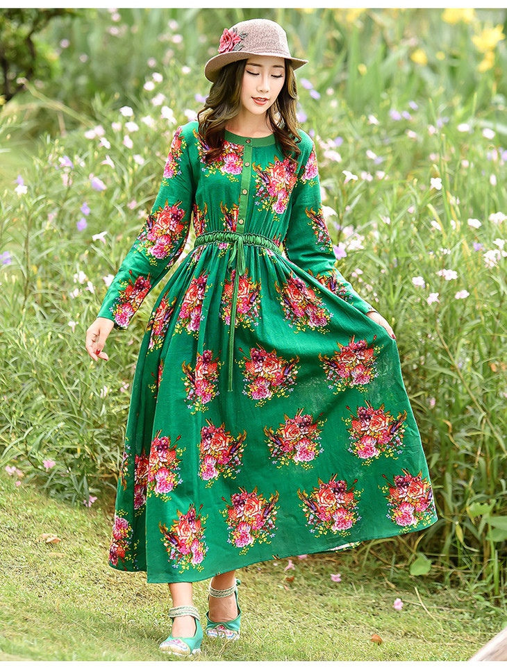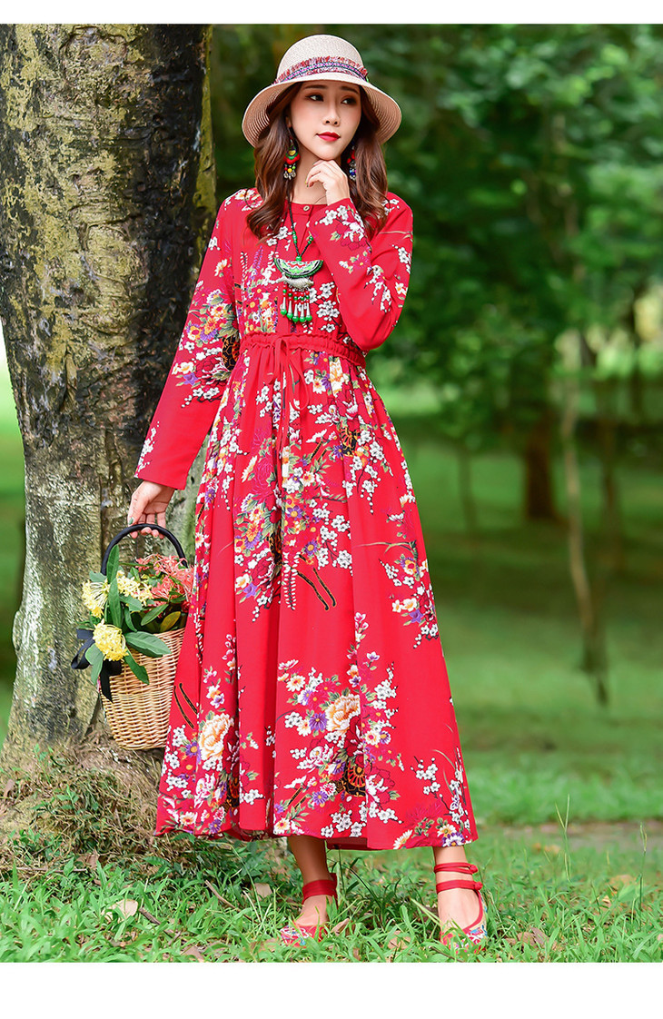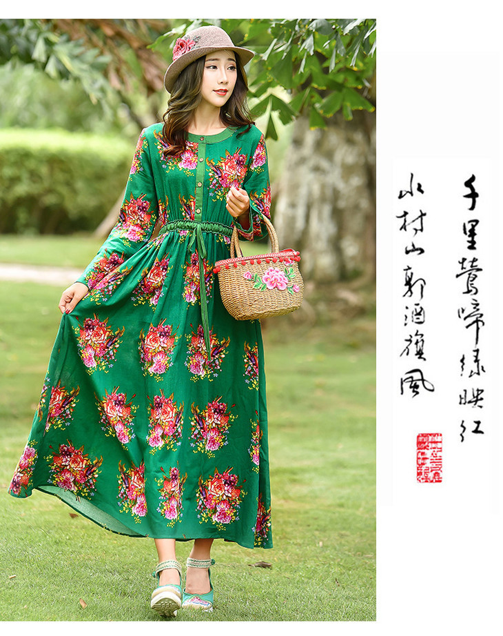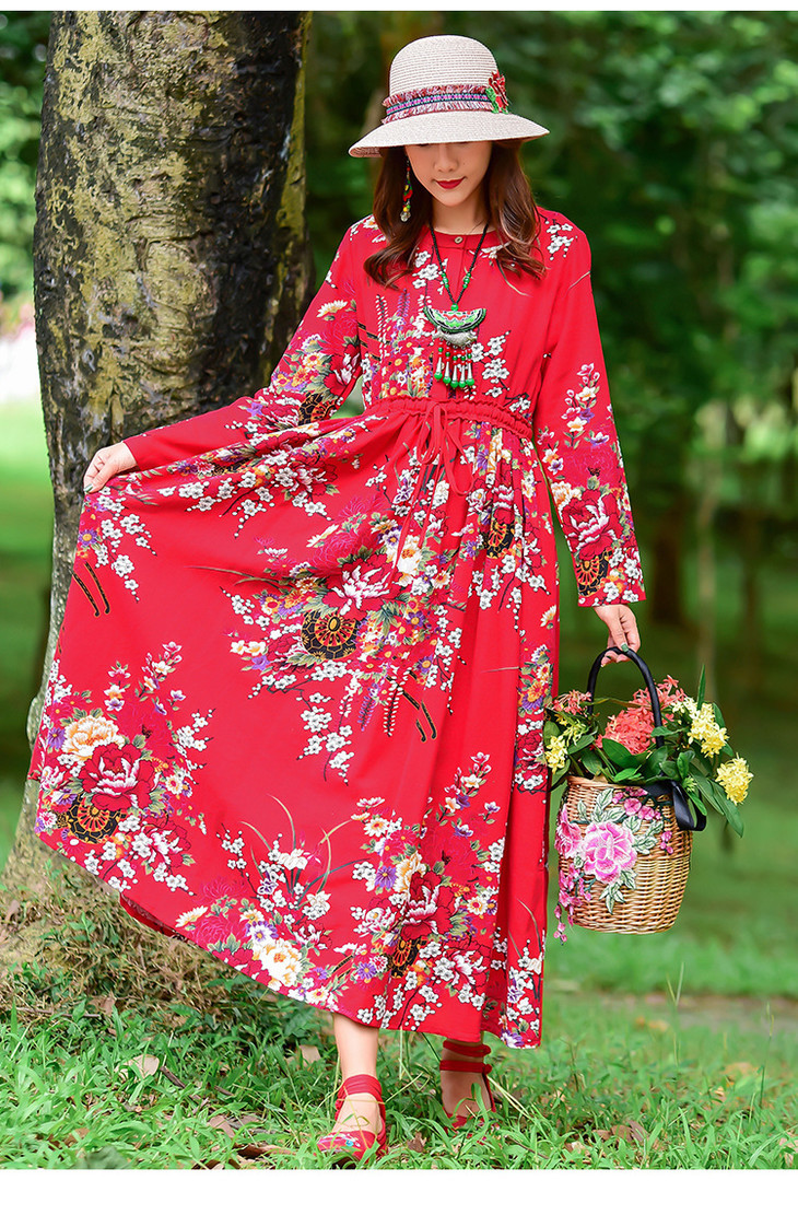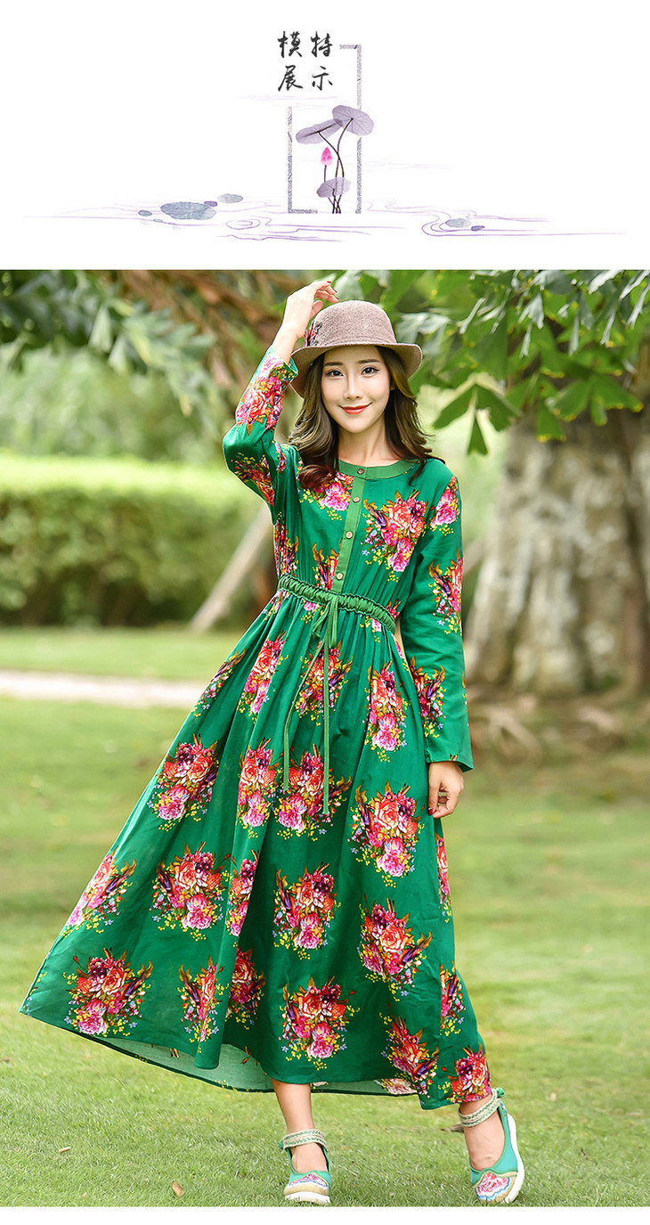YFP 民族风印花棉麻收腰修身气质休闲复古连衣裙