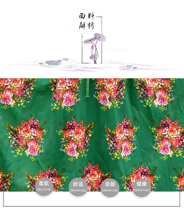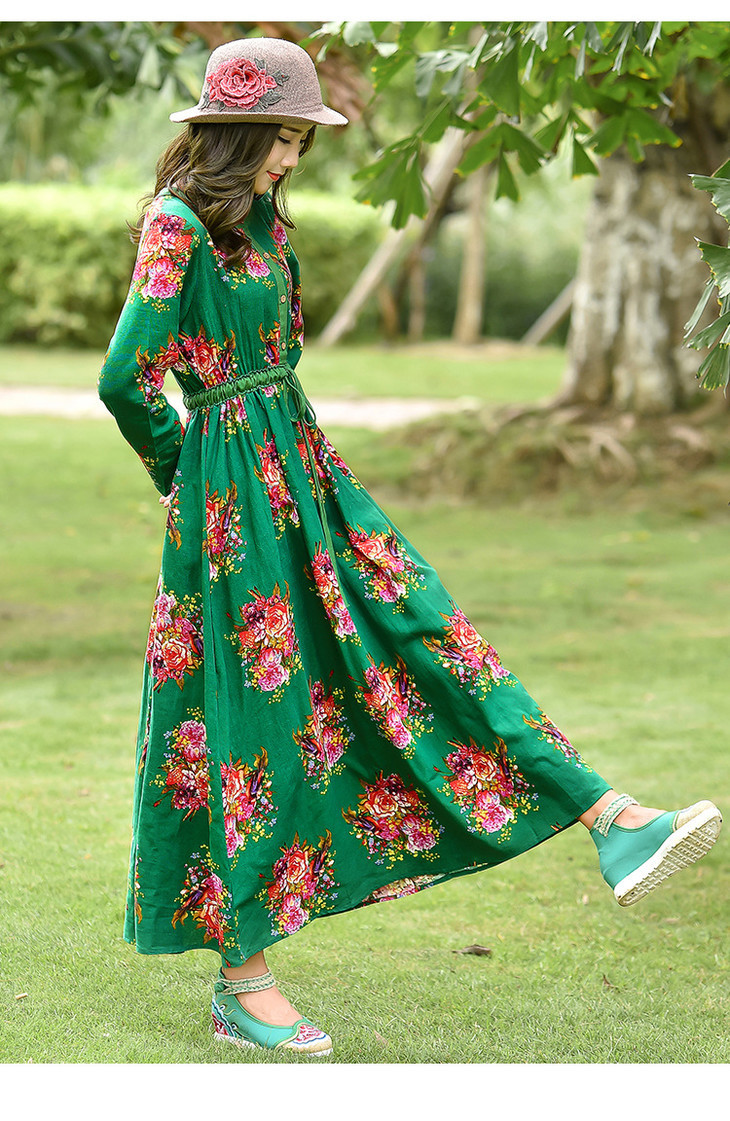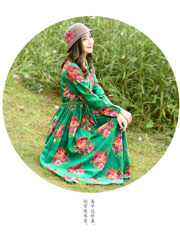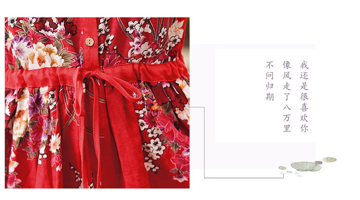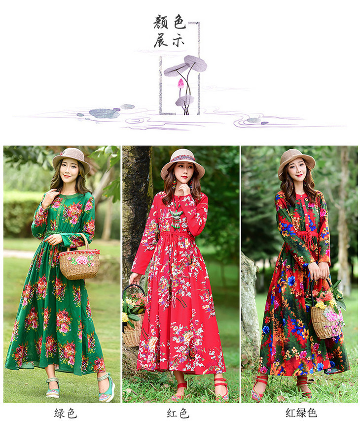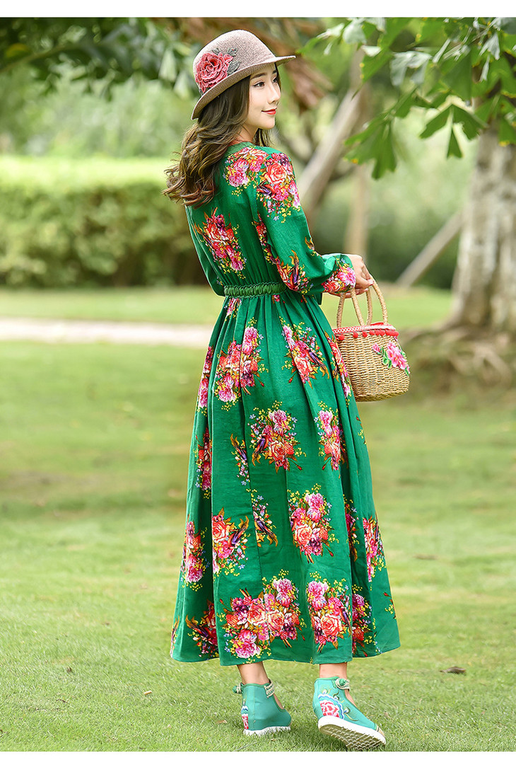 YFP 民族风印花棉麻收腰修身气质休闲复古连衣裙