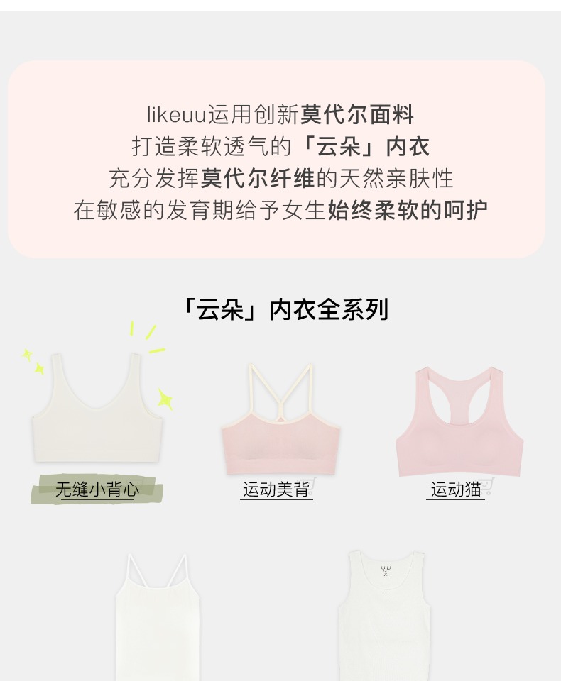 - likeuu是专注于为6~15岁的青少年创造柔软、无束缚的成长体验,以好奇心为灵感的成长发育期贴身衣物品牌。likeuu的产品覆盖内衣、内裤、保暖衣、家居服、运动等品类。