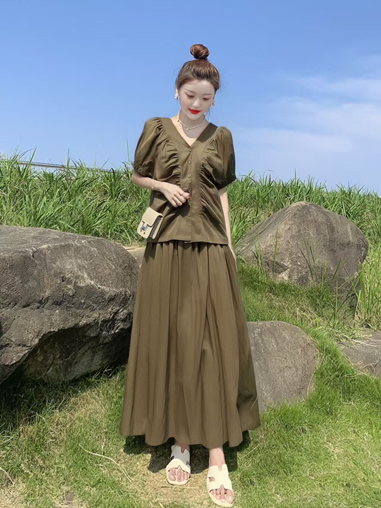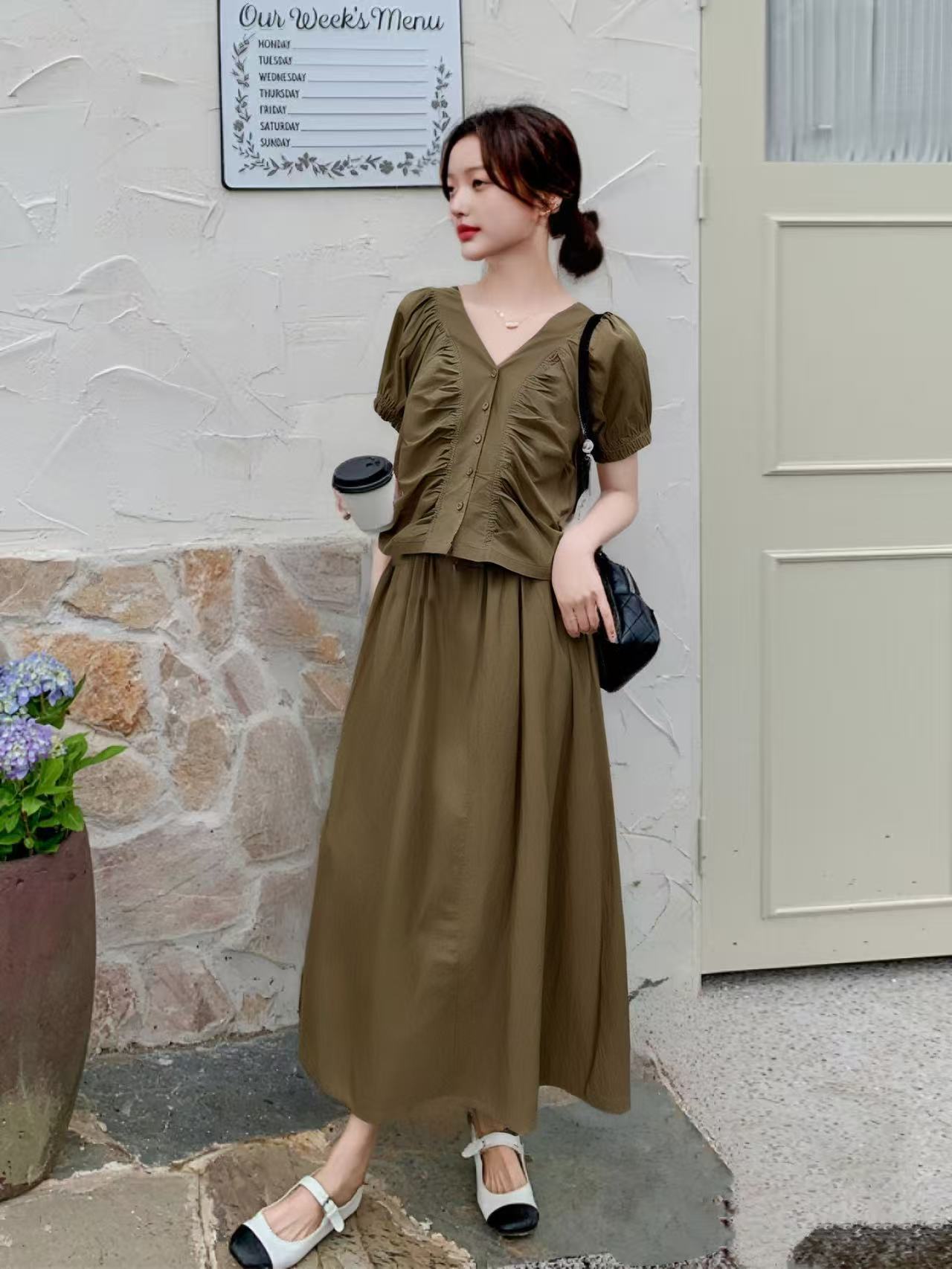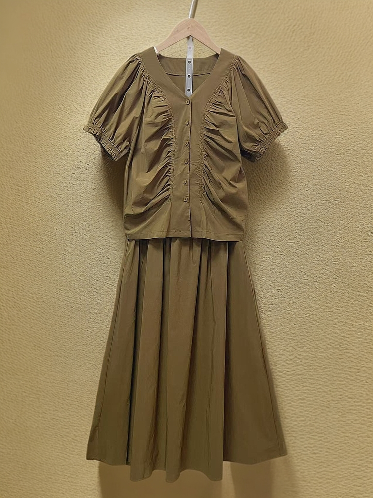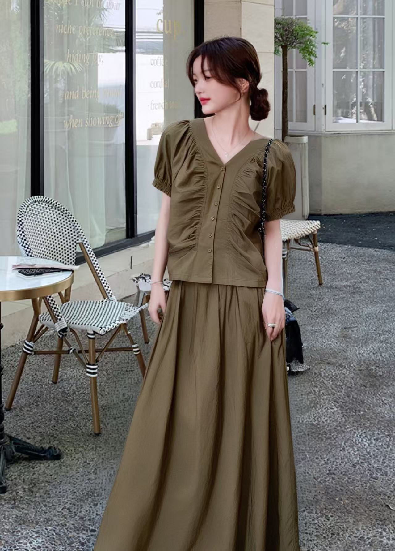七夕福利-NO退~{ 套装 }复古气质V领上衣+半裙收褶气质显瘦卡其套装-喜出