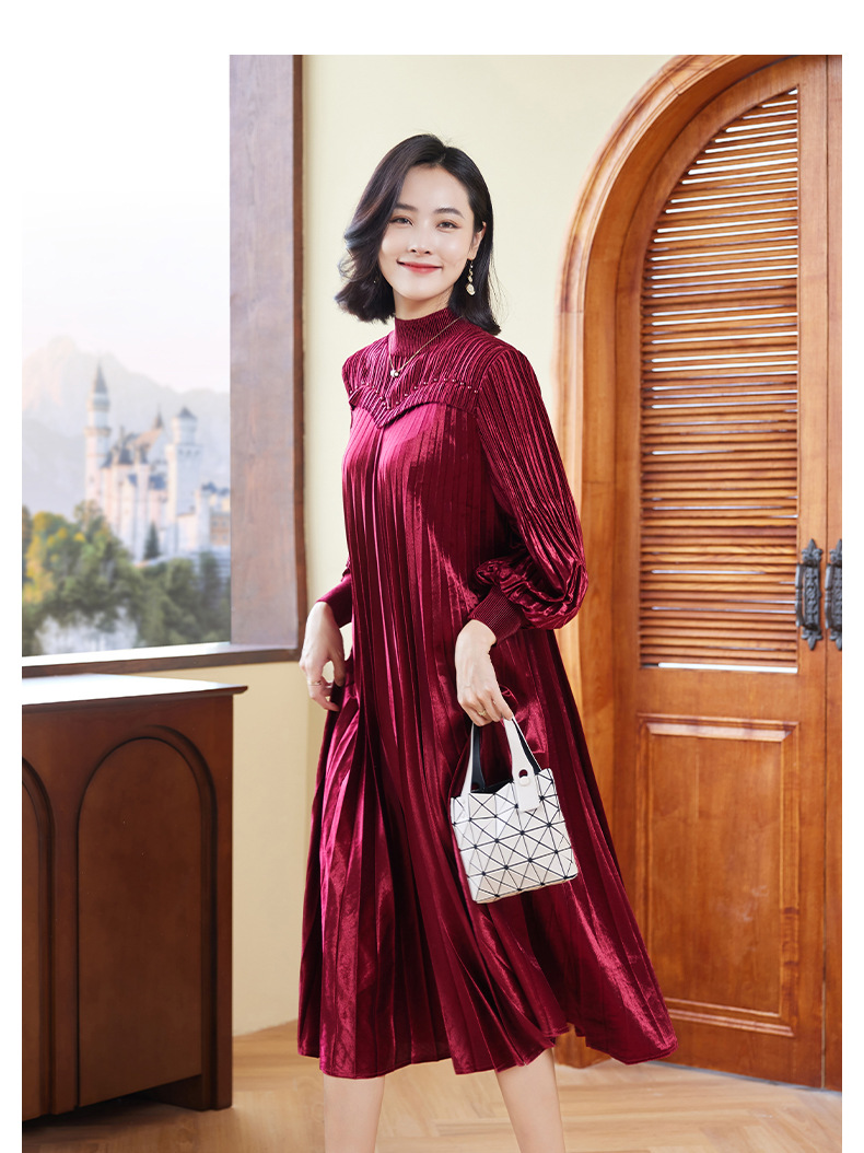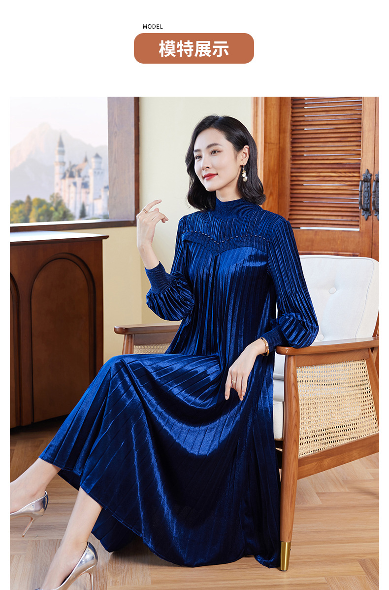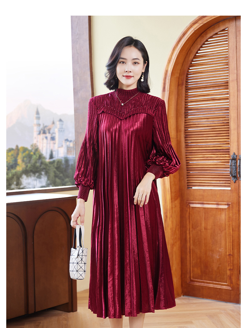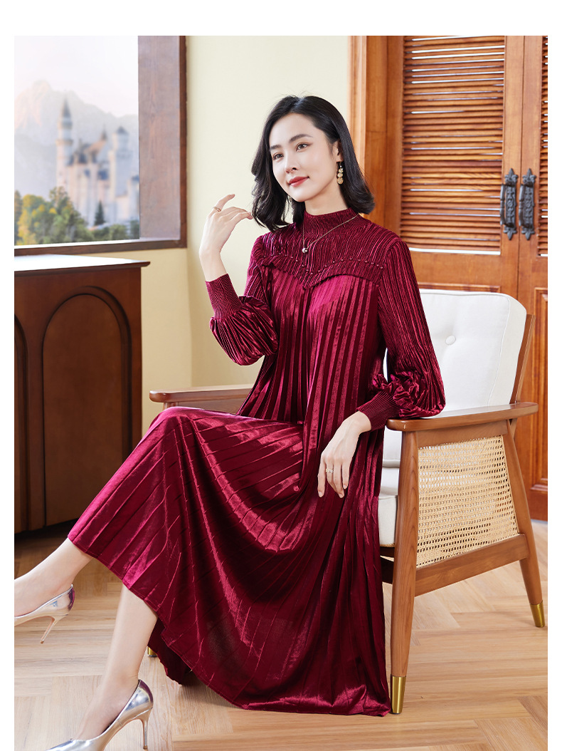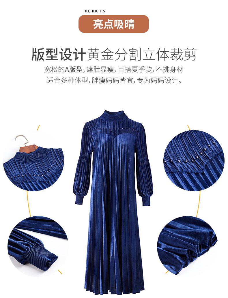 XSL S3346丝绒连衣裙妈妈秋冬装百褶裙