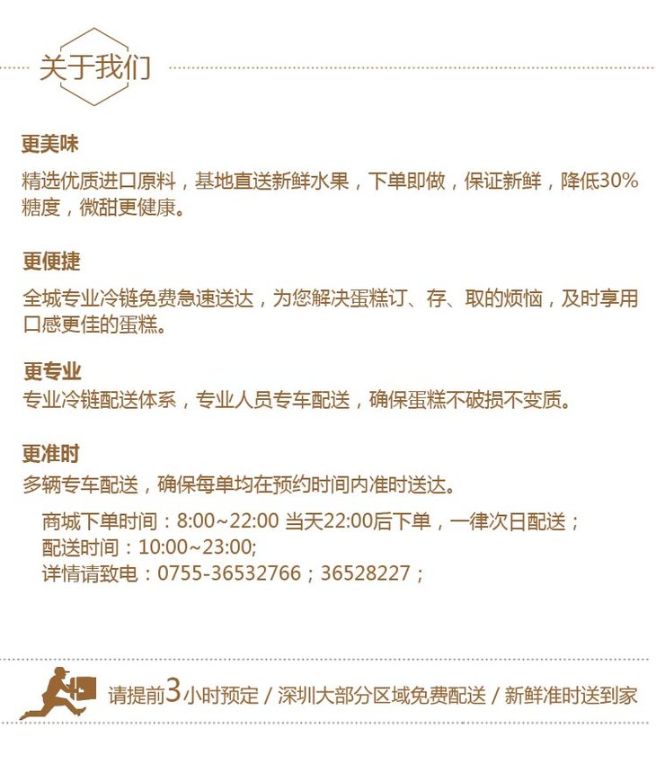 提拉米苏是一家专业O2O蛋糕连锁品牌,3小时专业冷链免费配送上门,让您轻松享用新鲜美味的蛋糕。公司始终秉承“安全,健康,美味”的宗旨,严格选取世界各地进口食材,致力于最优质的美食带给提拉米苏的家人们。