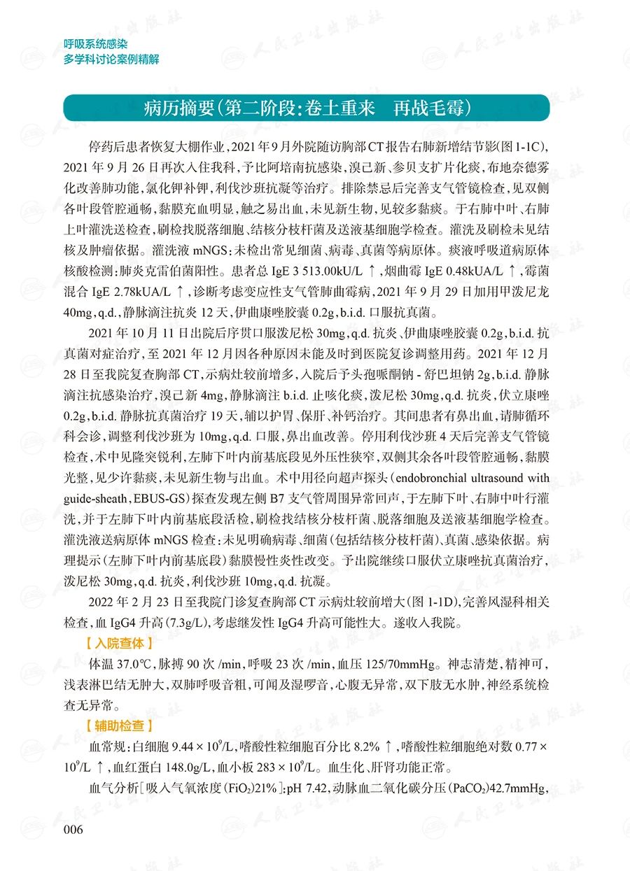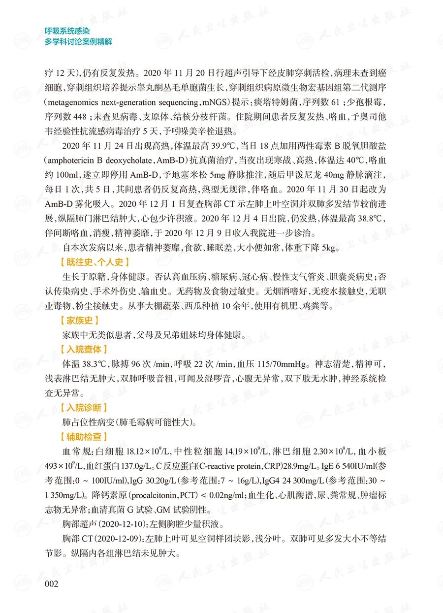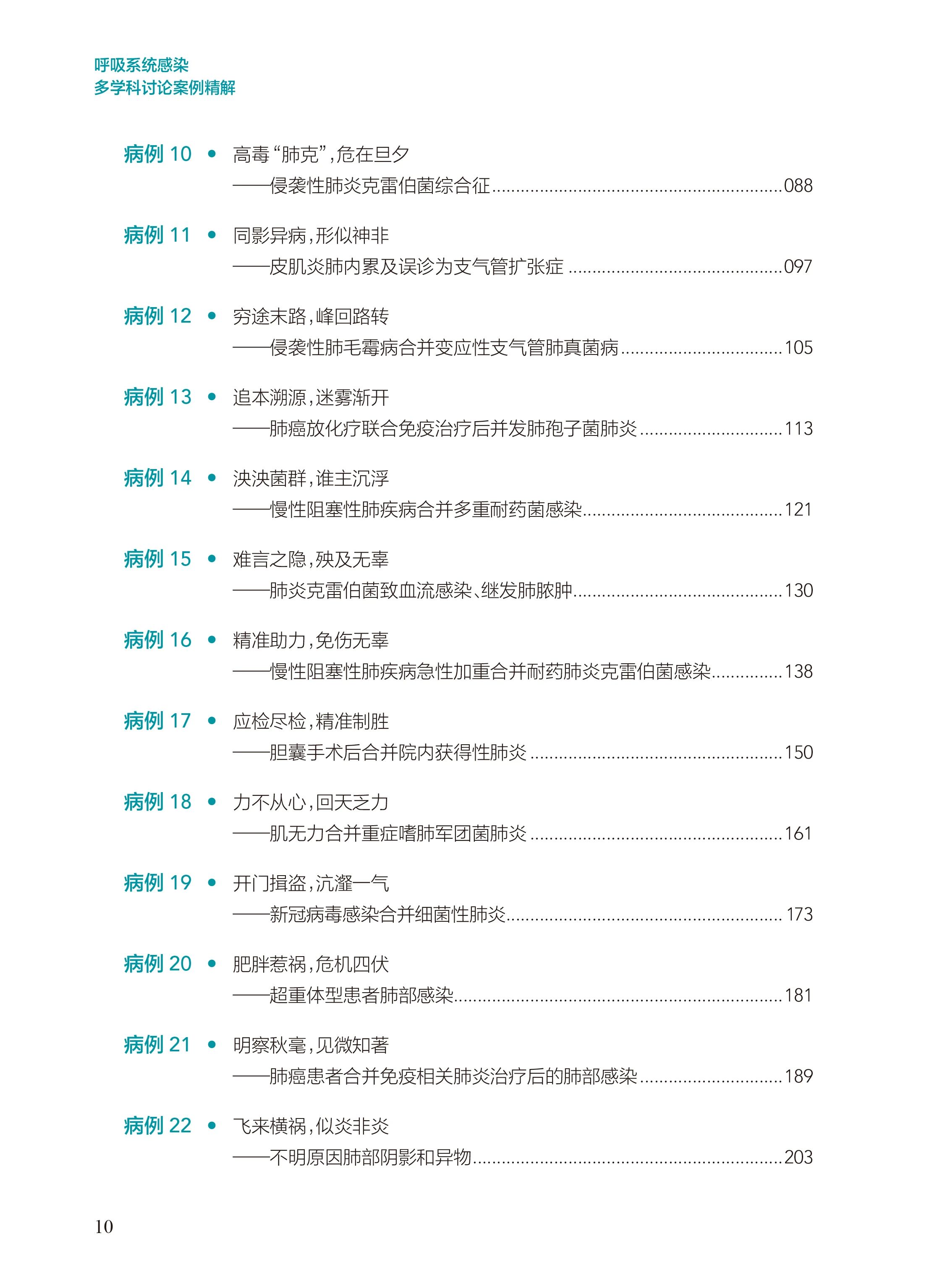 本书共包含22个经典肺部感染及疑似案例,如肺毛霉病、肺曲霉病、侵袭性肺炎克雷伯菌综合征、耐药菌肺部感染、院内获得性肺炎、嗜肺军团菌肺炎、超重患者肺部感染等,由经治医生执笔,将患者关键病史、症状演变、诊治决策的曲折过程及诊治难点逐一呈现,经由呼吸病学、影像学、病理学、感染病学、重症医学、临床药学等多学科资深专家深度评析,配以患者影像、病理图片及诊治流程图表,最后对每个病例的诊疗体会及经验教训等加以总结。