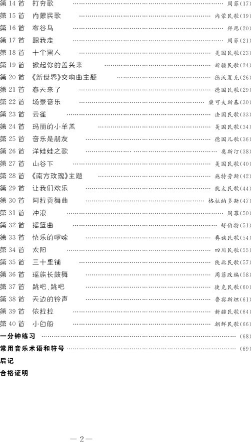 1. 识谱前的预备阶段学习教材——《跟我学15首》;2. 练习曲部分——小手练习曲100首;3. 乐曲部分——小手启蒙曲120首(上册)、小手启蒙曲120首(中册)、小手启蒙曲120首(下册);4. 针对性练习部分——小手五指特殊练。
