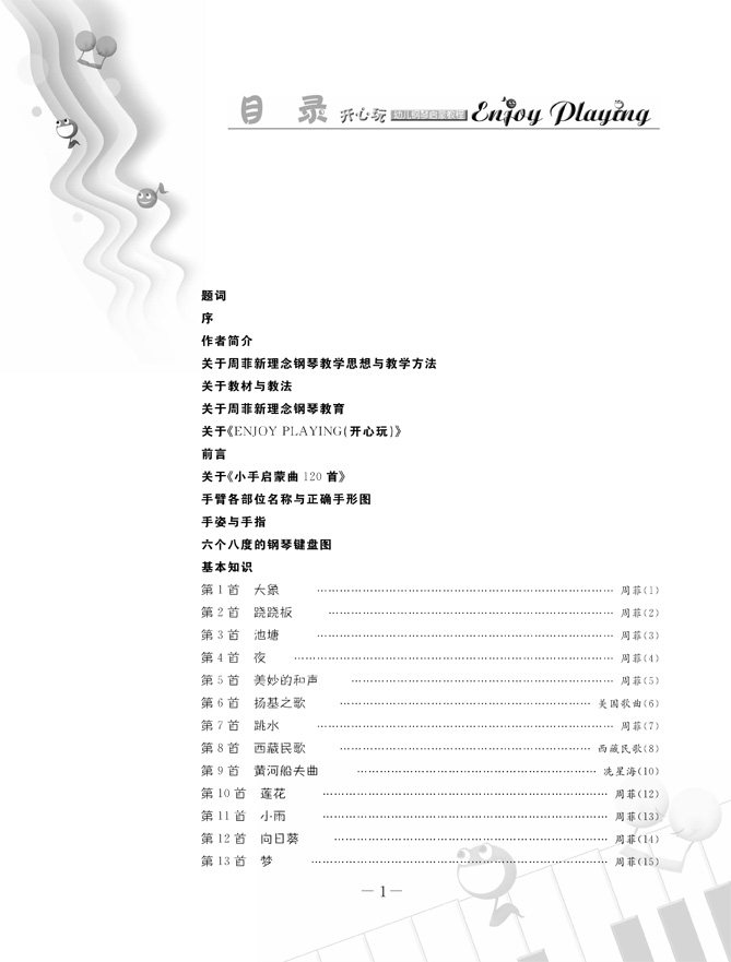 这套《ENJOYPLAYING(开心玩)》幼儿钢琴启蒙教程,是专为5岁以下的孩子弱小之手所作的比较完整系统的特殊教材。其目的在于,为弱小初学者提供一个较完整的、较系统的、目的明确的、针对性强的特殊教材。共六分册: