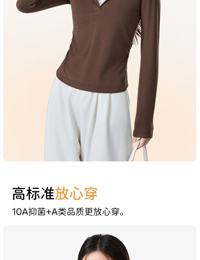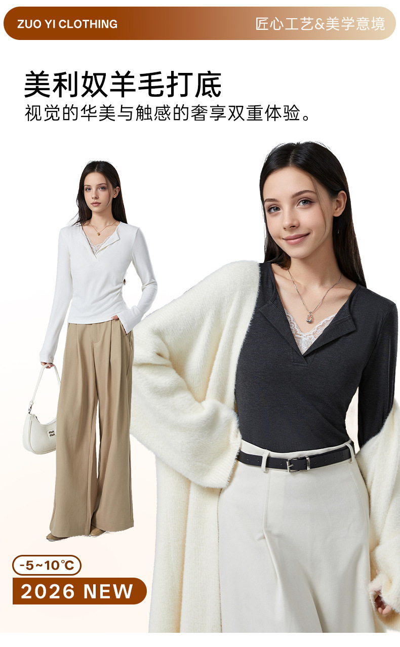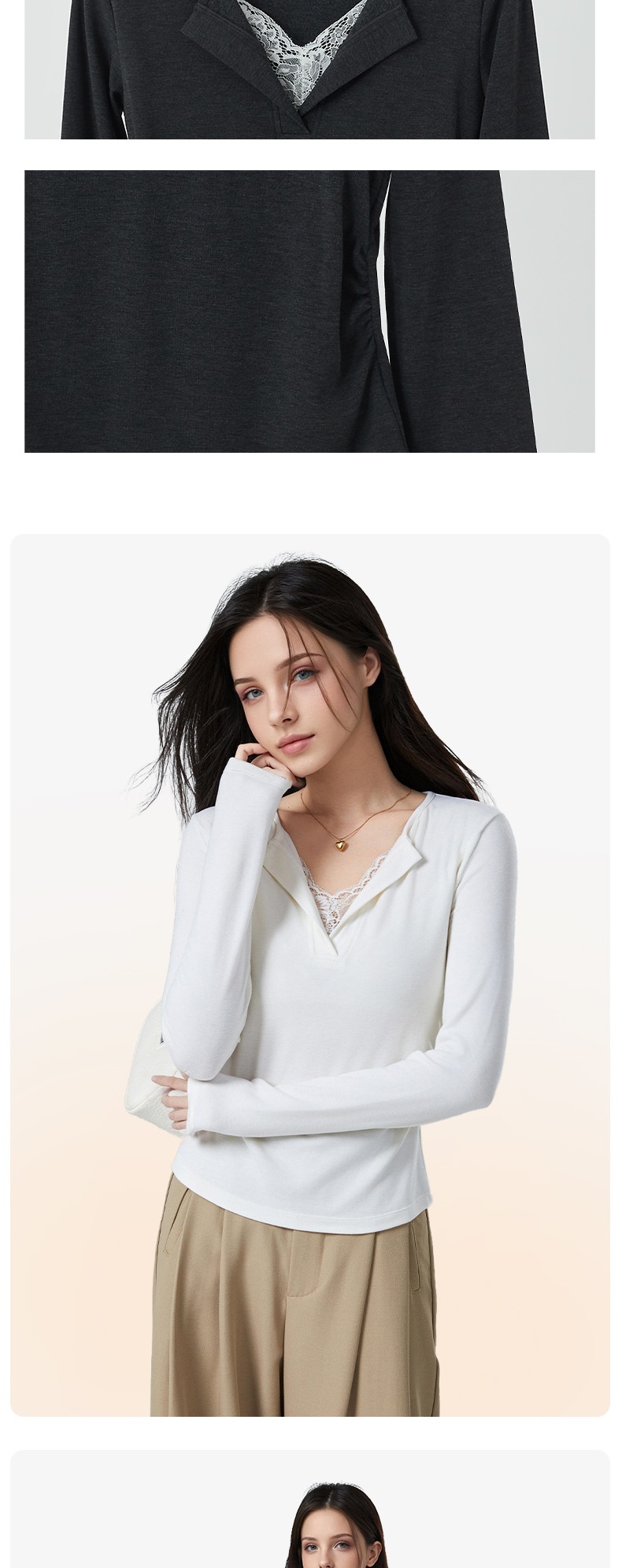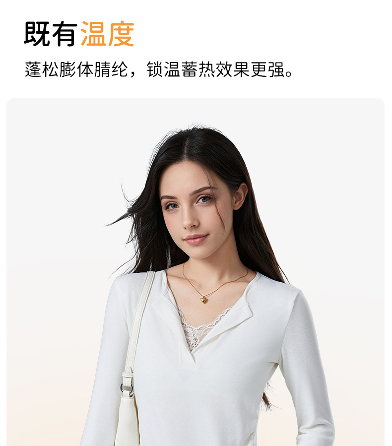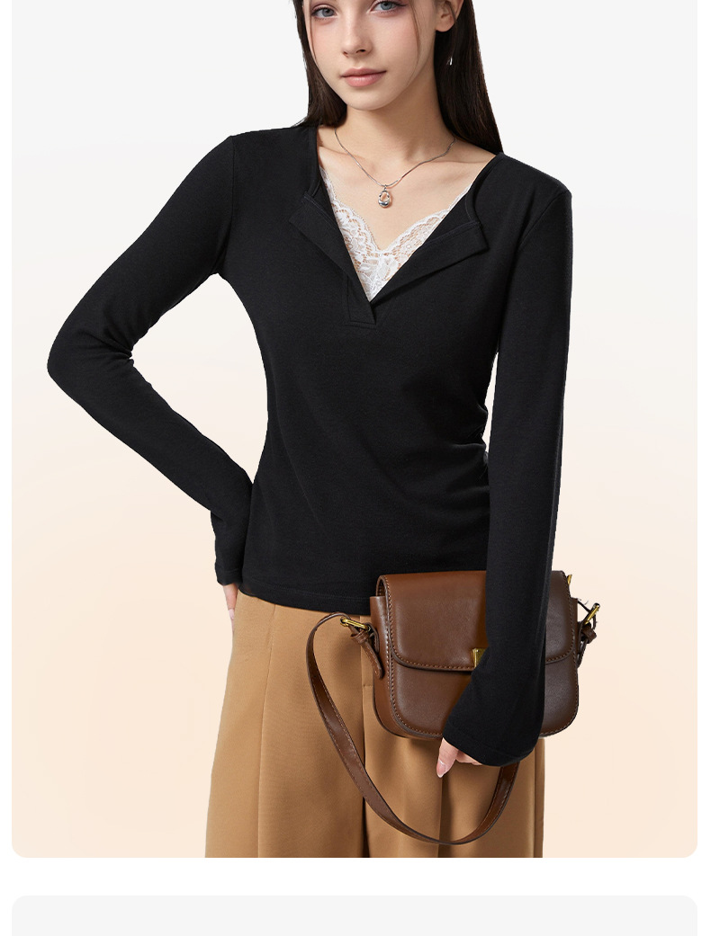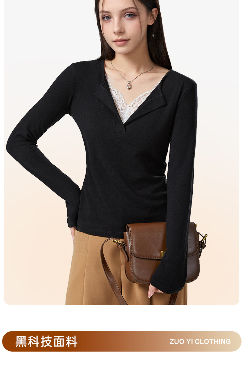 「自」全新升级【铂金会员146/天猫199/差价53】(12430)洛诗琳德绒开领蕾丝花边打底衫2025秋冬新款气质保暖上衣