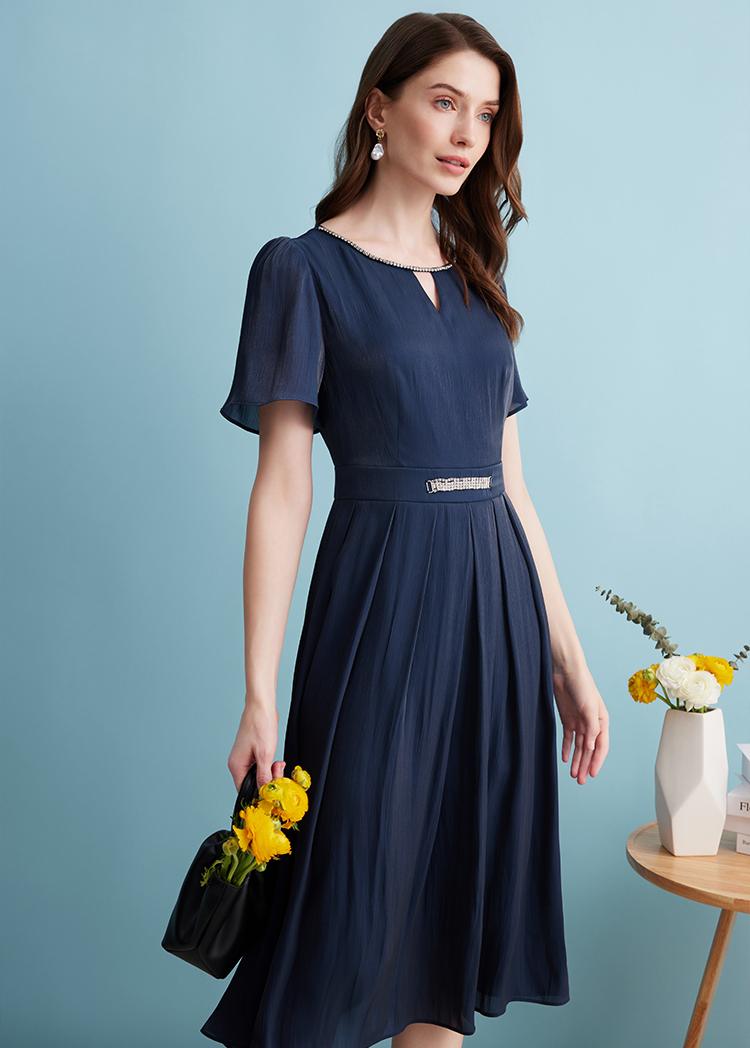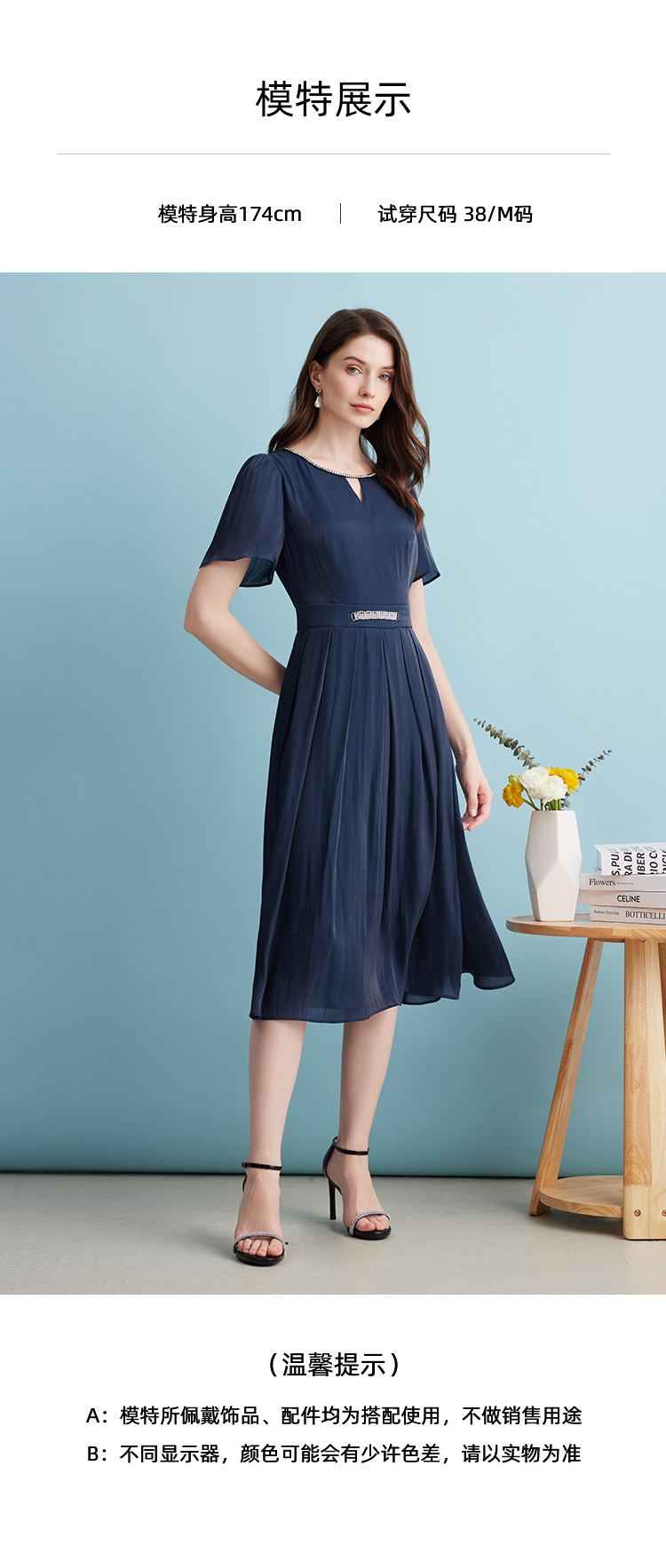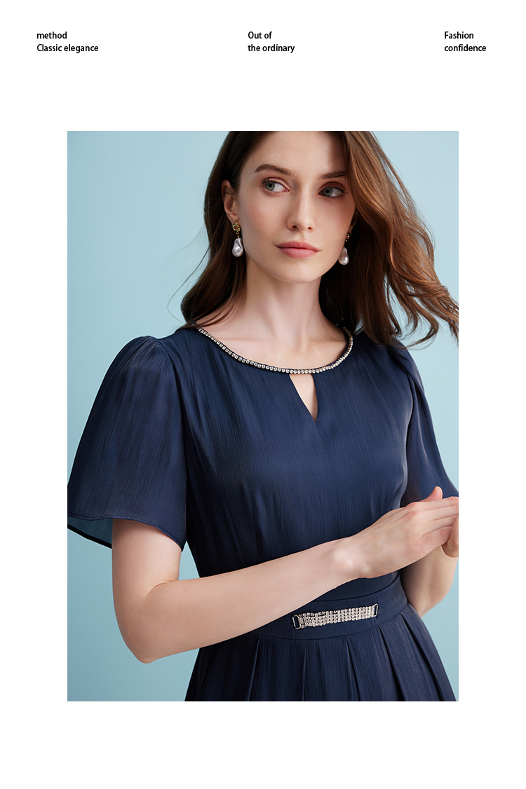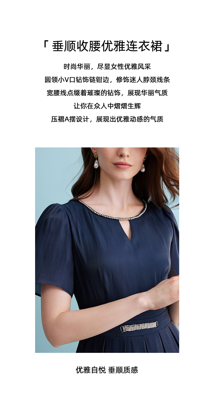 EITIE爱特爱夏季新款气质通勤镂空钉钻收腰压褶垂坠蓝色连衣裙B2407324