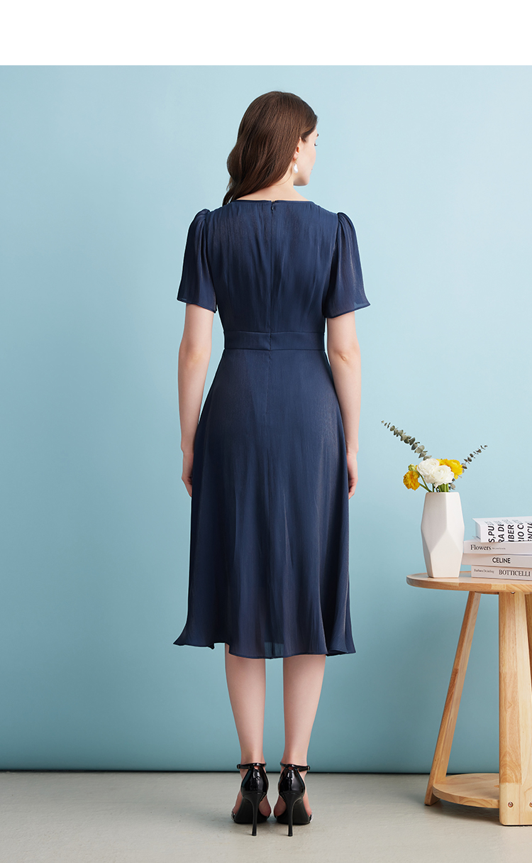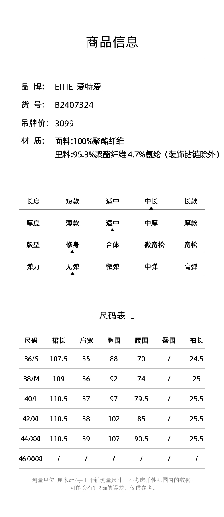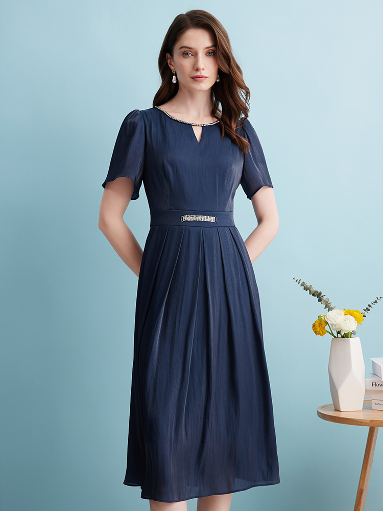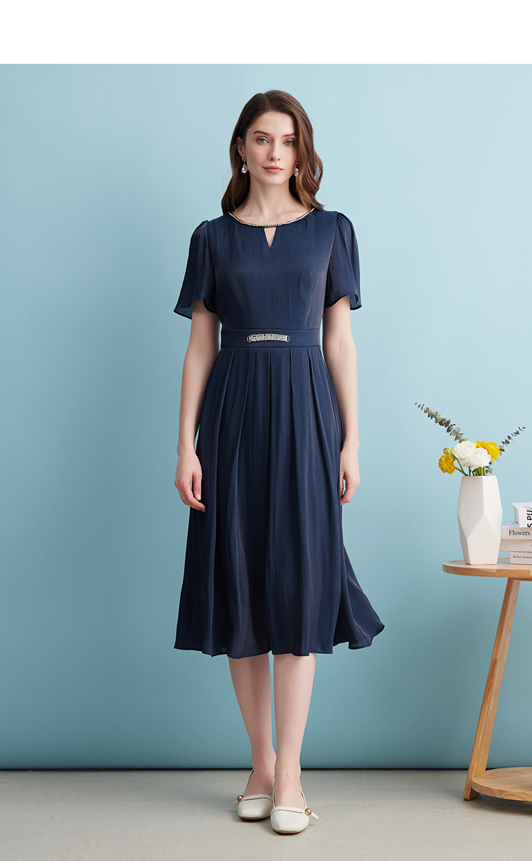 EITIE爱特爱夏季新款气质通勤镂空钉钻收腰压褶垂坠蓝色连衣裙B2407324