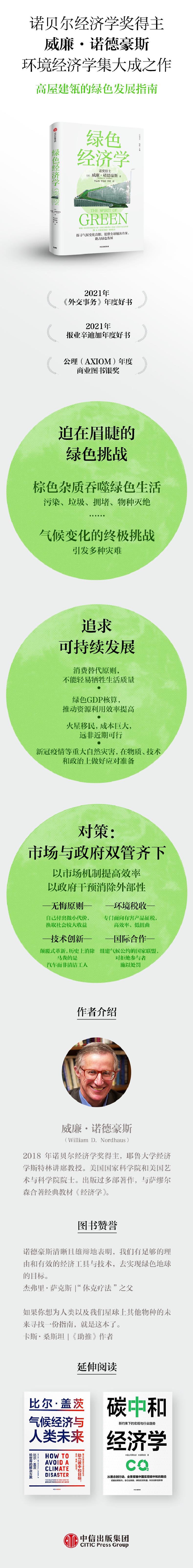威廉·诺德豪斯因对气候变化经济学的开创性贡献获得诺贝尔经济学奖。他清晰且雄辩地表明,我们有足够的理由和有效的经济工具与技术,去实现绿色地球的目标。他以过人的智慧和洞察力讨论了我们该如何构建良治社会,即一个促进发展并造福后代的社会。他展示了经济工具将助力我们实现全球绿色发展,且其中诸多工具都由他设计或改造。