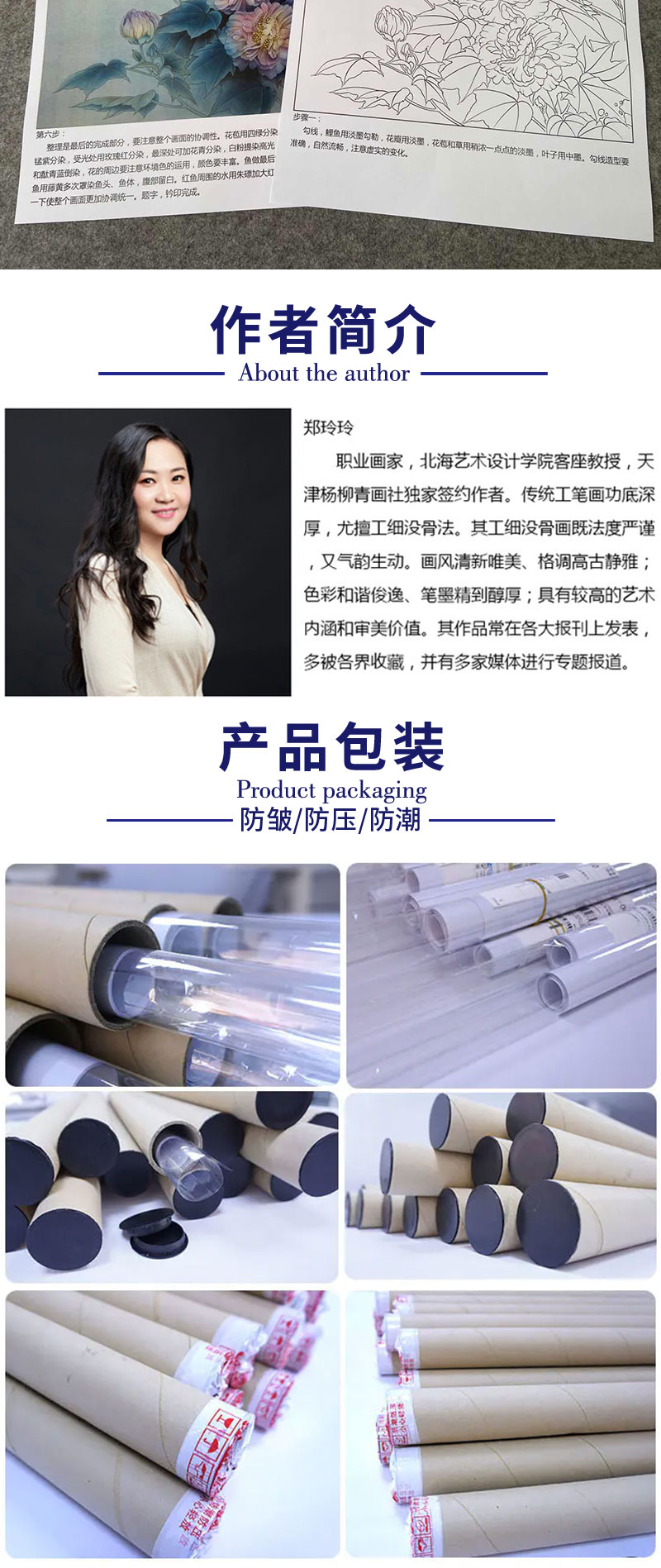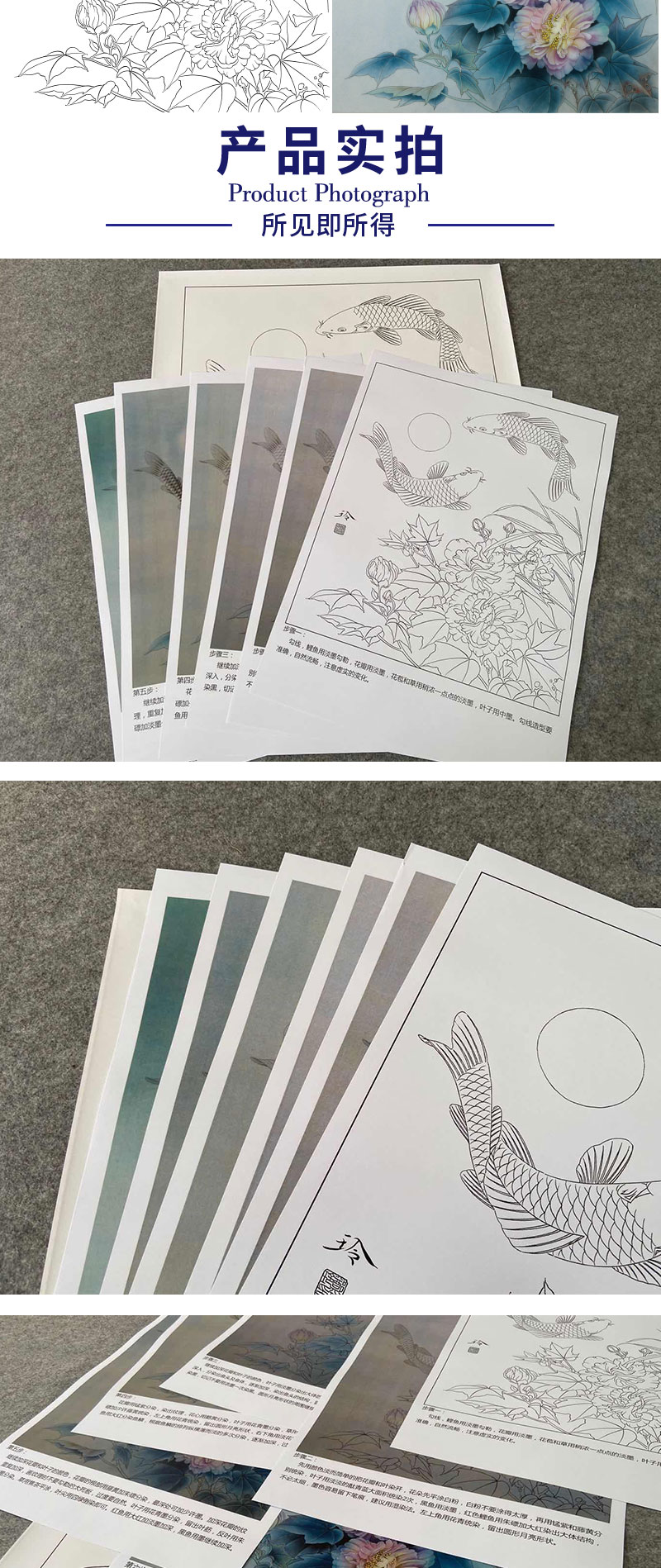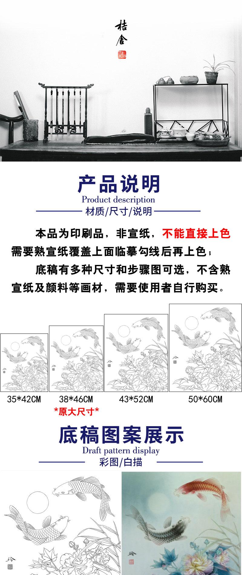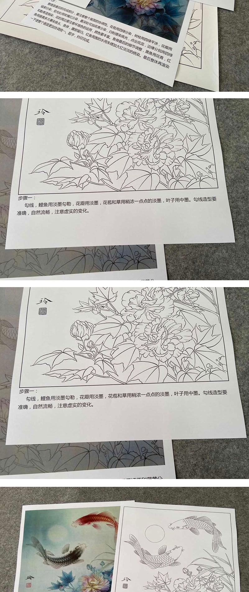 【有步骤、大彩图】郑玲玲工笔画白描底稿《月光如水》芙蓉鲤鱼初学者临摹花鸟线稿ZL38