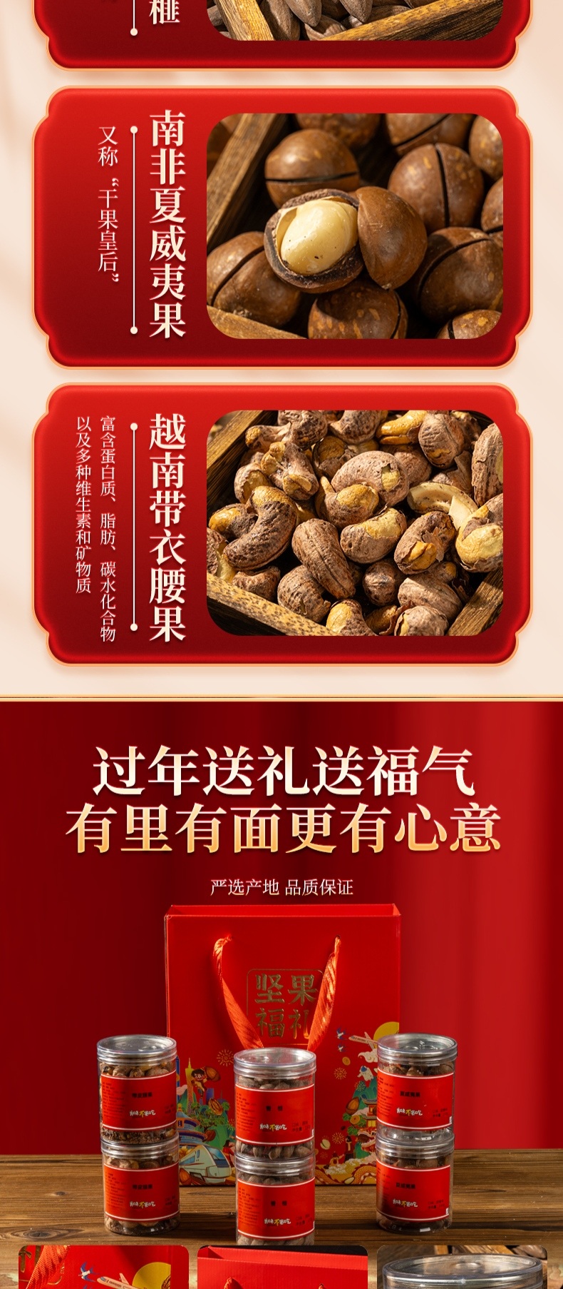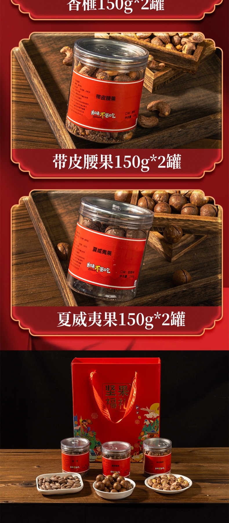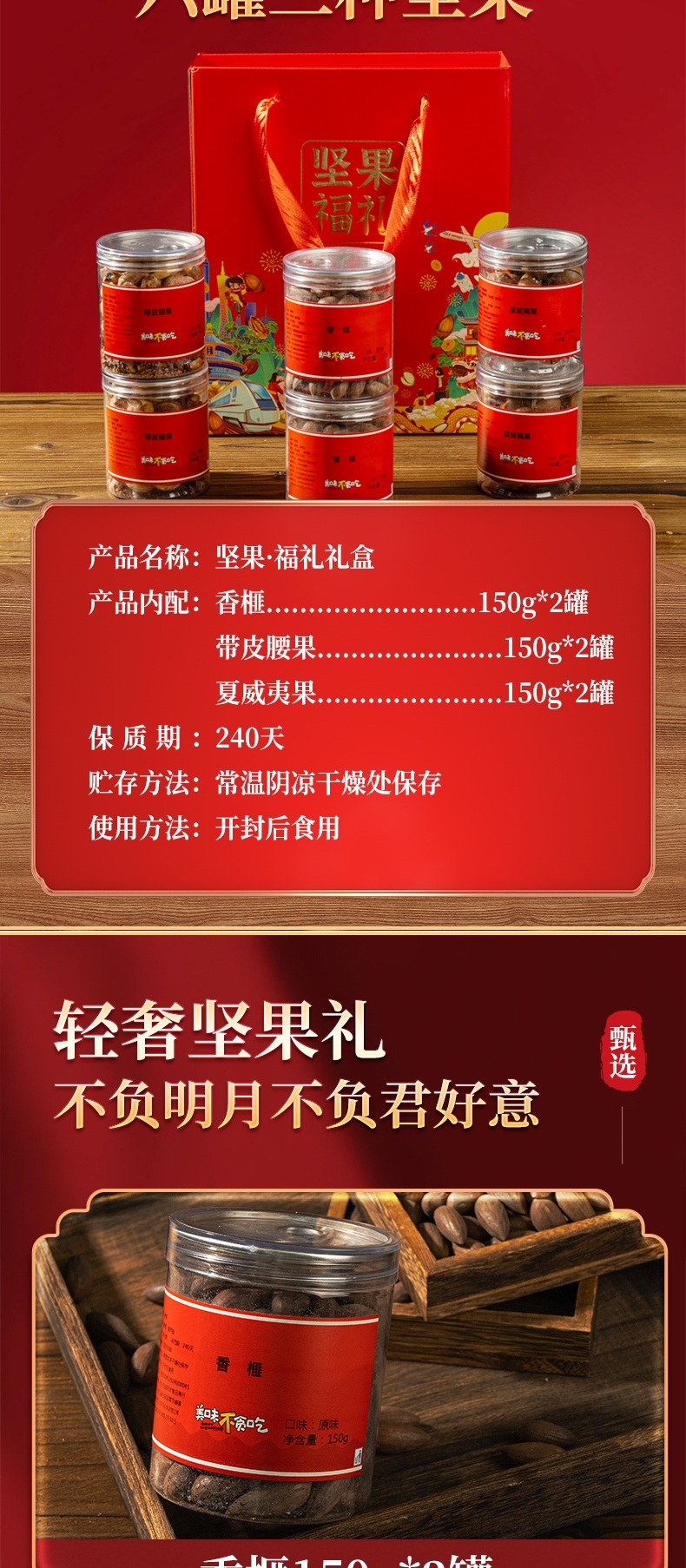 璟小棠 坚果【夏威夷果+腰果+香榧】中国红主题包装,真空密封罐装设计,采用当季鲜采,坚持手工筛选,剔除坏果,权威检测,安心保障