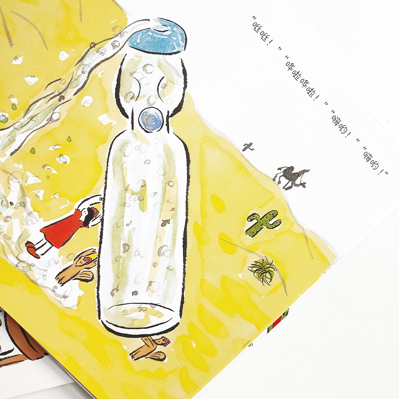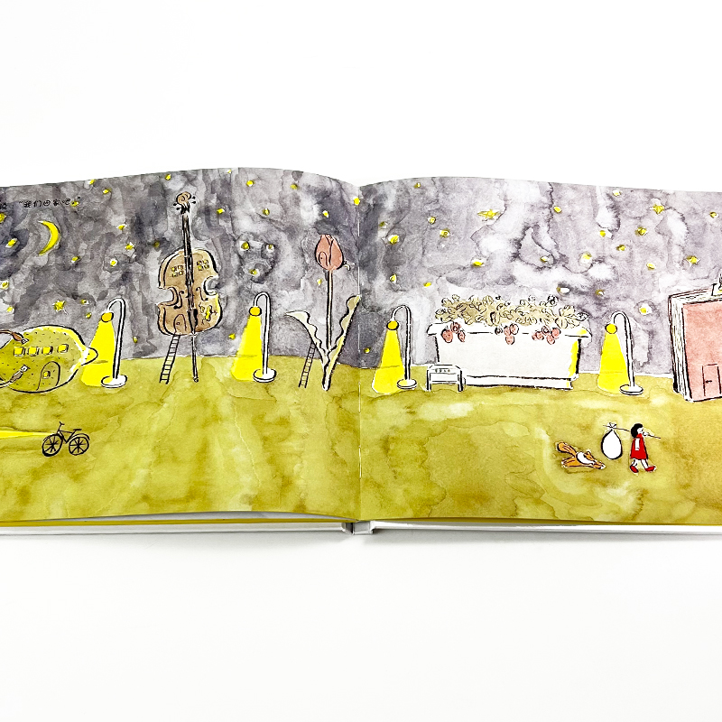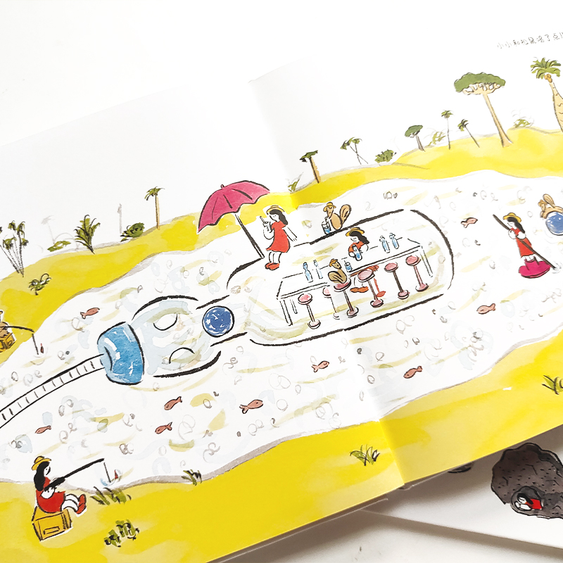 鬼头祈将日本的传统绘画艺术加以创新,用温暖明亮的黄色作为基色调,随意稚拙的线条勾勒造型,让作品散发出可爱又搞怪的气息。她还采用连动叙事的创作手法,在同一页画面中画出不同位置和形态的角色来表现其行动轨迹,让读者对画面所展现的情节有更加直观的理解。