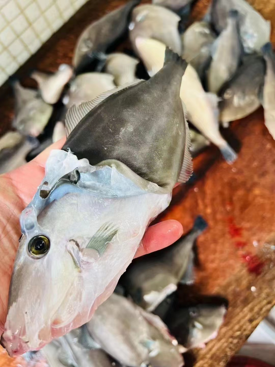 扒皮鱼除了那根凸起于鱼背的硬骨外,最特别的是身上那张粗糙如砂纸的鱼皮,必须把皮扒掉才能烹煮,所以就叫"扒皮鱼"
