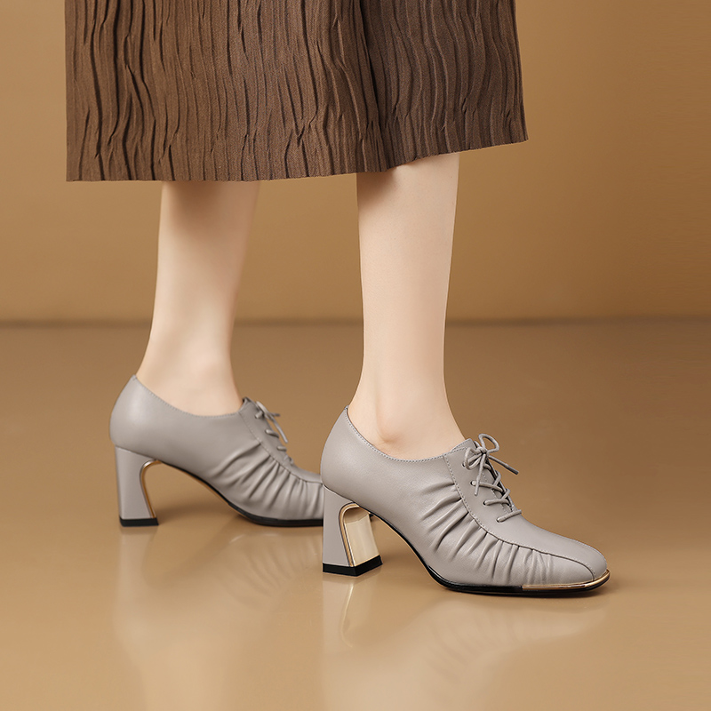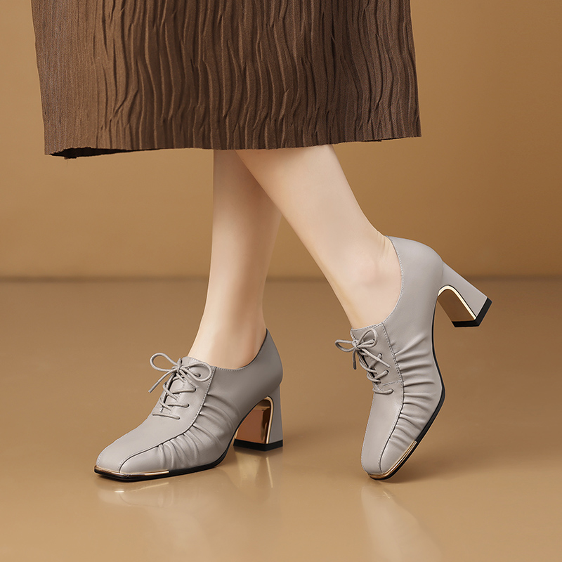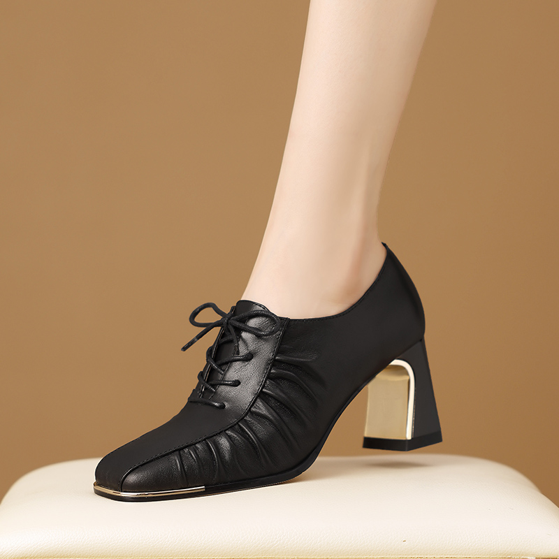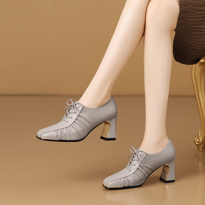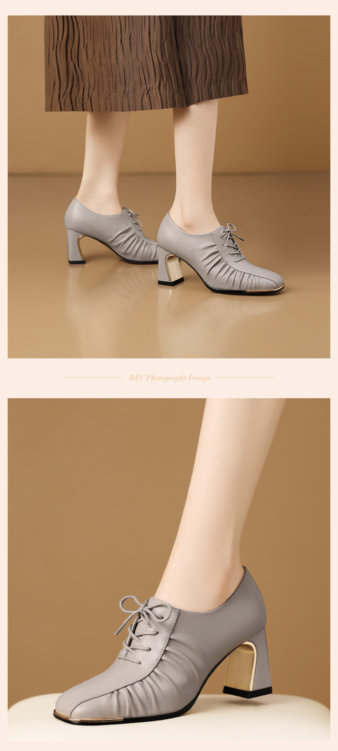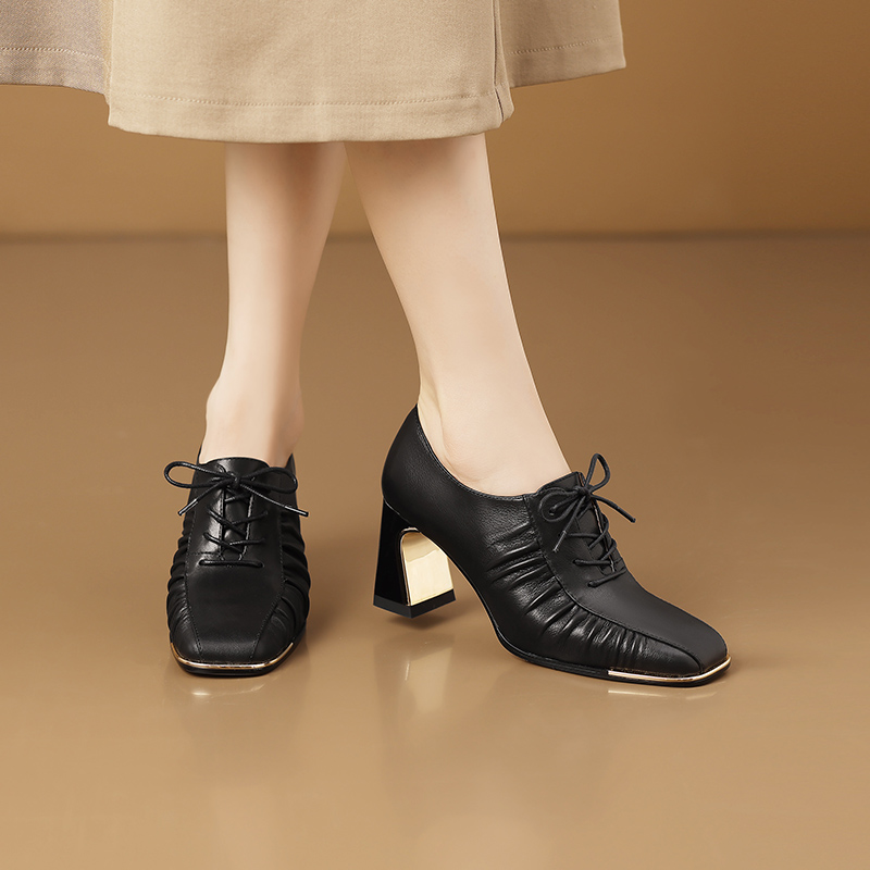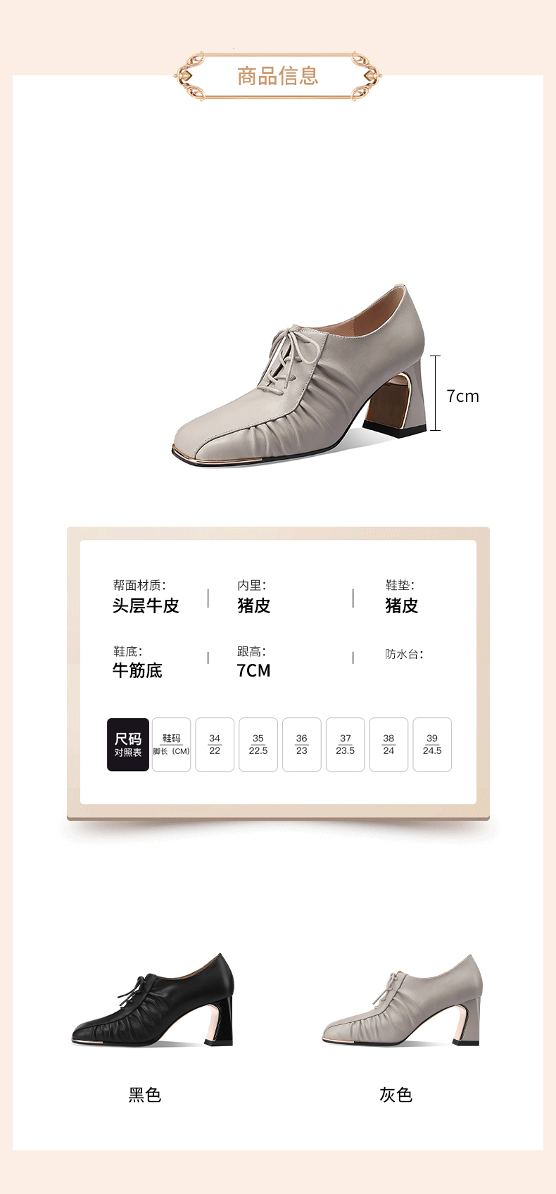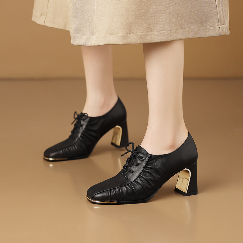 【预售5天】复古英伦系带真皮粗跟深口单鞋女春秋新款方头高跟鞋女HY&H3726