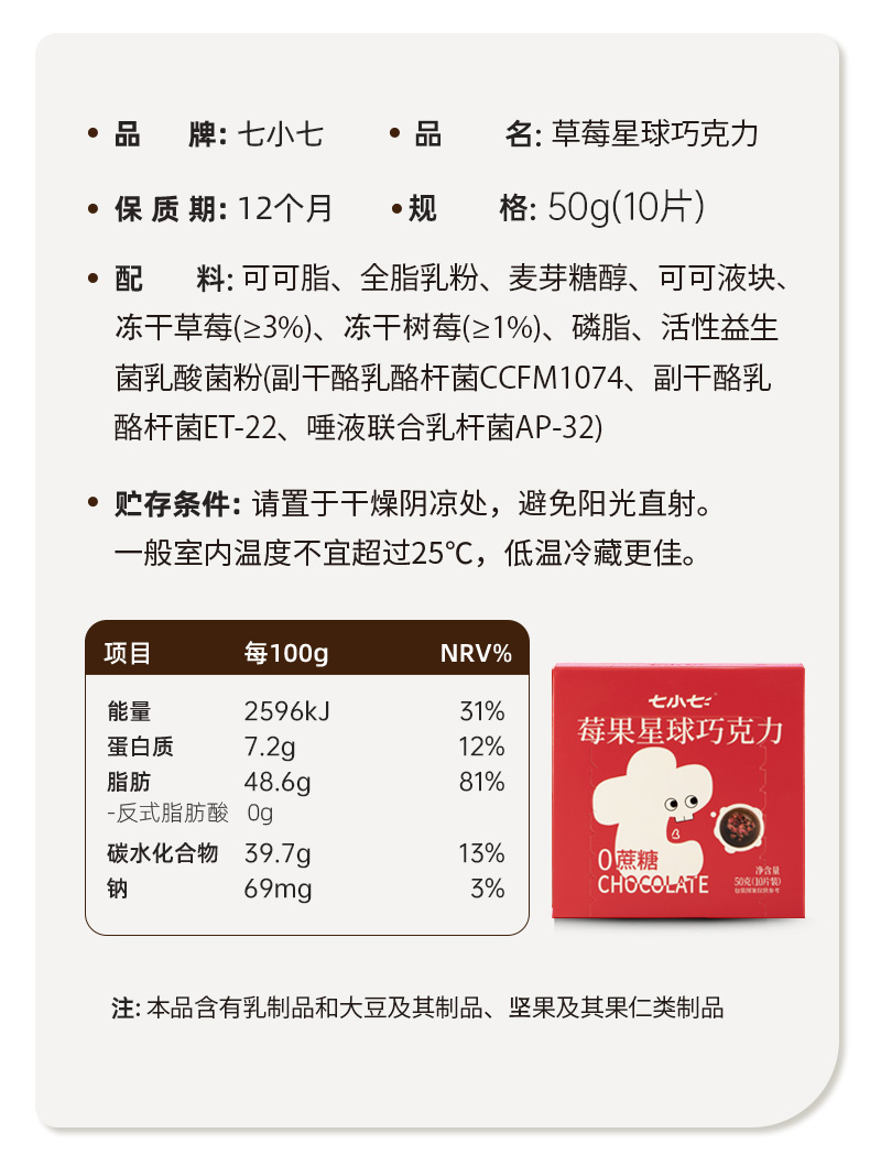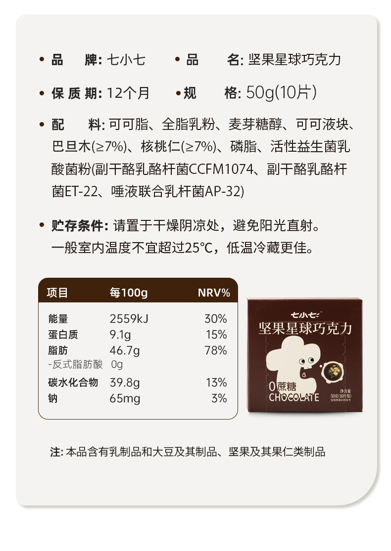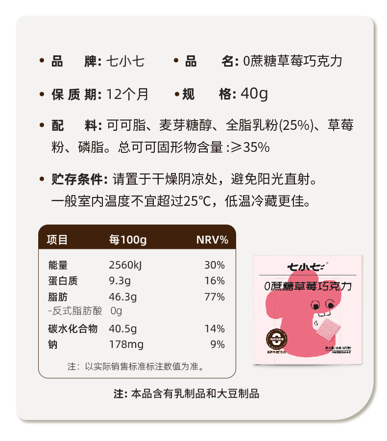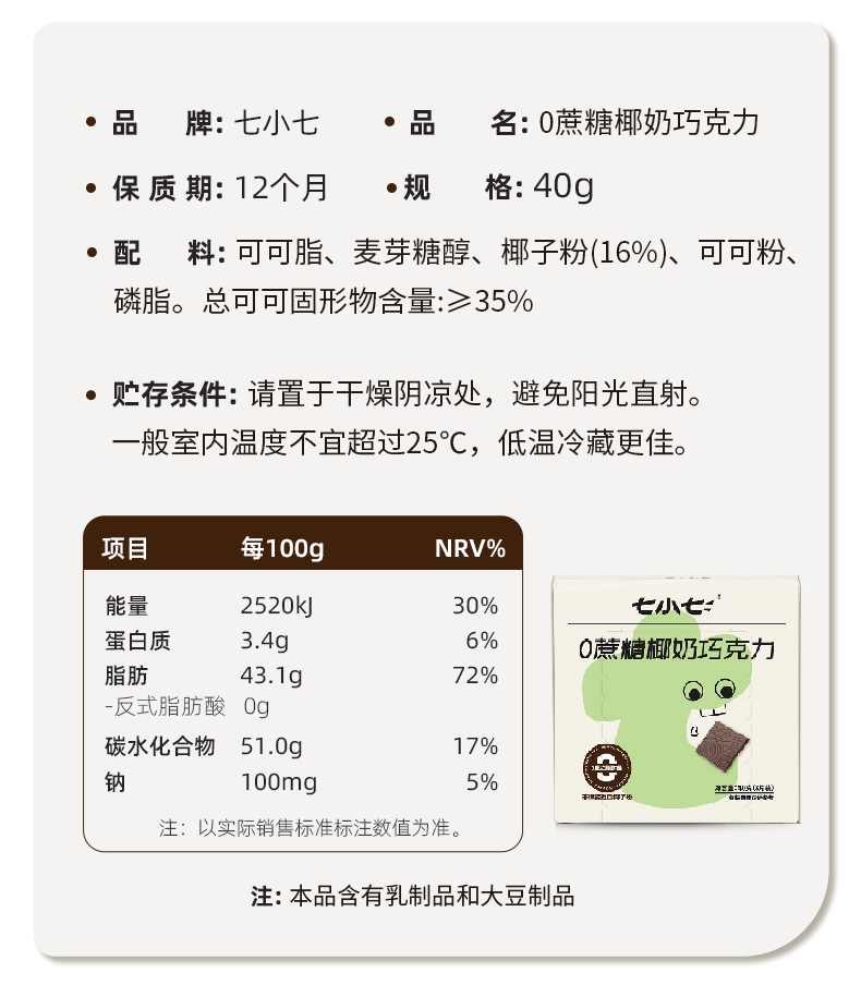【下单方式见详情页】七小七无蔗糖巧克力纯可可脂健康解馋零食牛奶草莓椰奶组合装40g盒 商品图0
