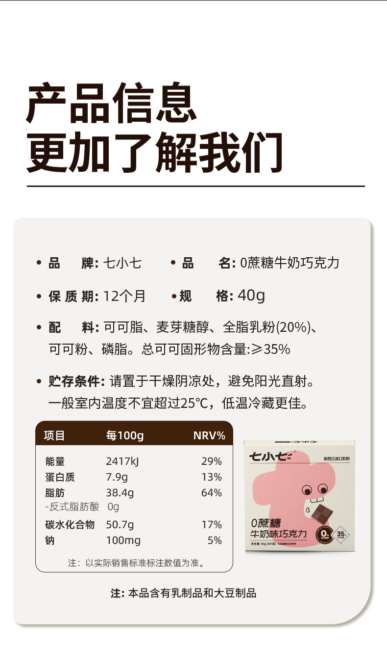 【下单方式见详情页】七小七无蔗糖巧克力纯可可脂健康解馋零食牛奶草莓椰奶组合装40g盒 商品缩略图0