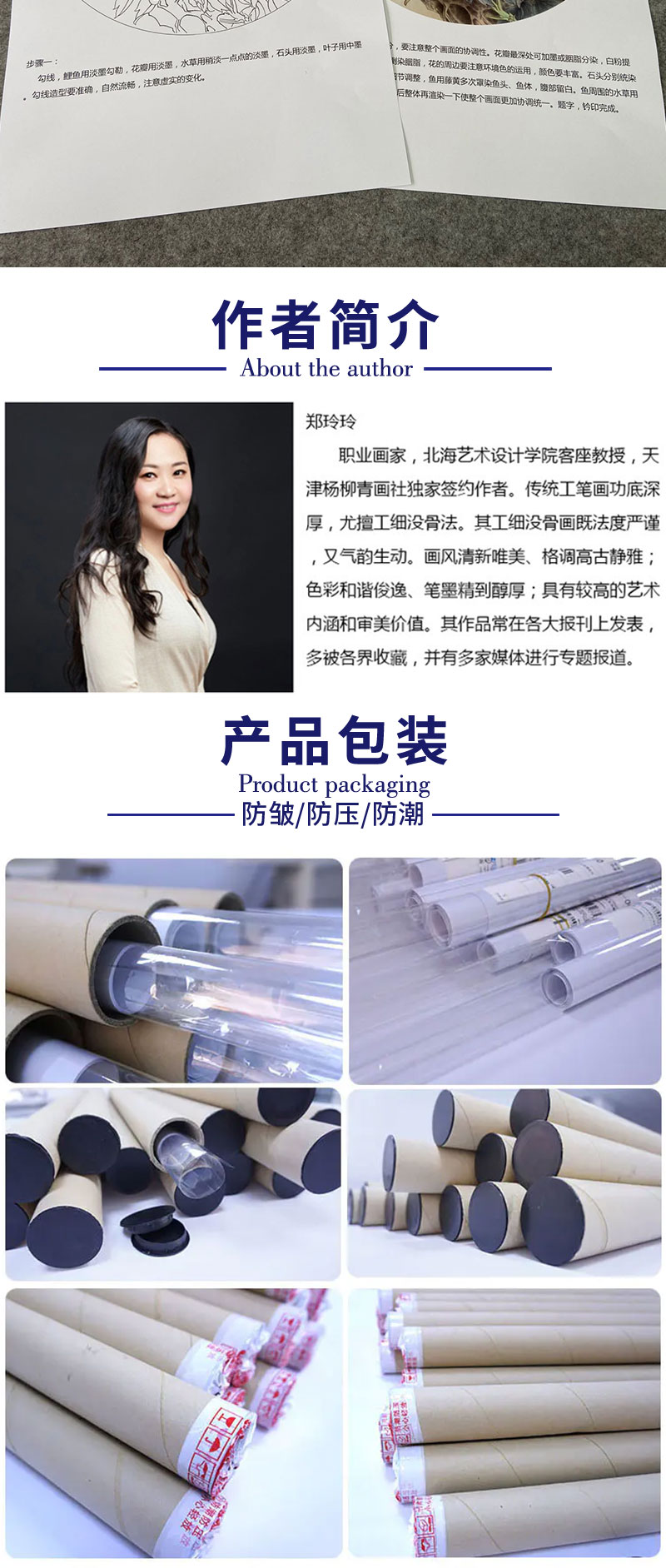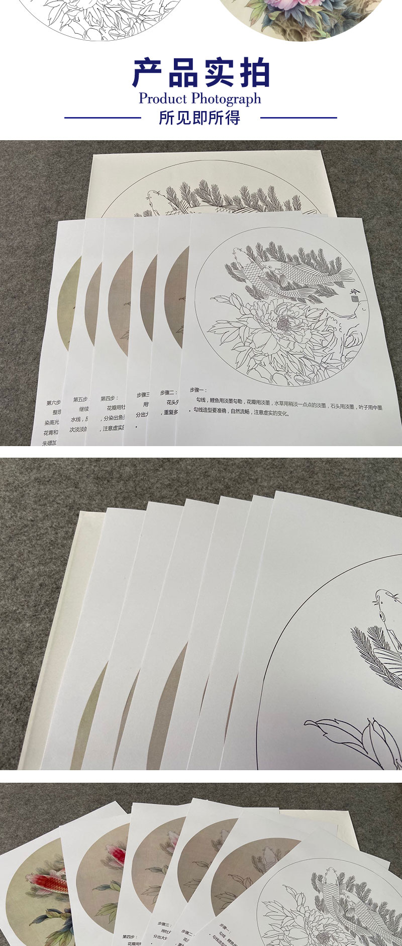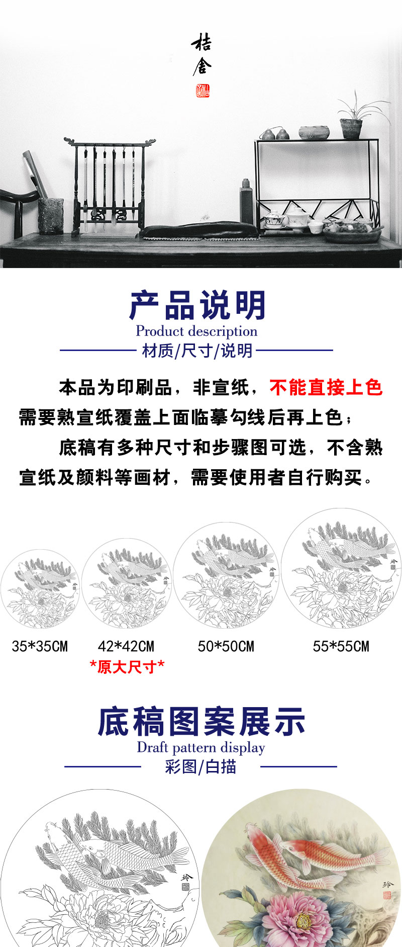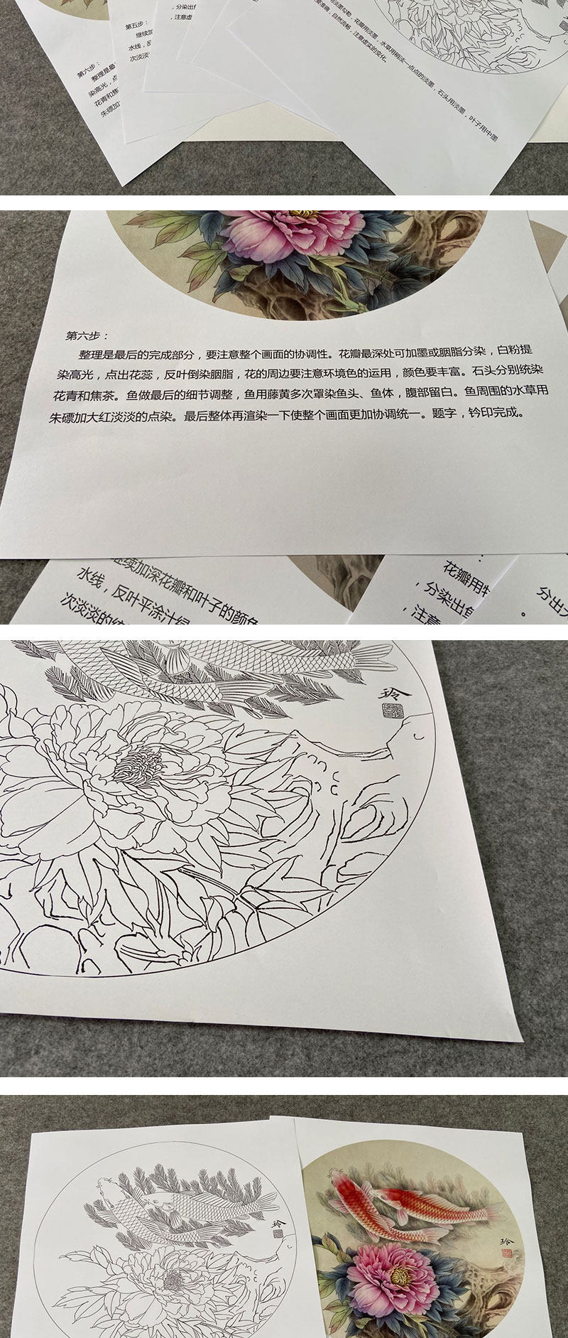【有步骤、大彩图】郑玲玲工笔画白描稿圆形小品《相依相伴》牡丹鲤鱼初学者临摹花鸟线稿ZL27