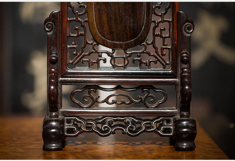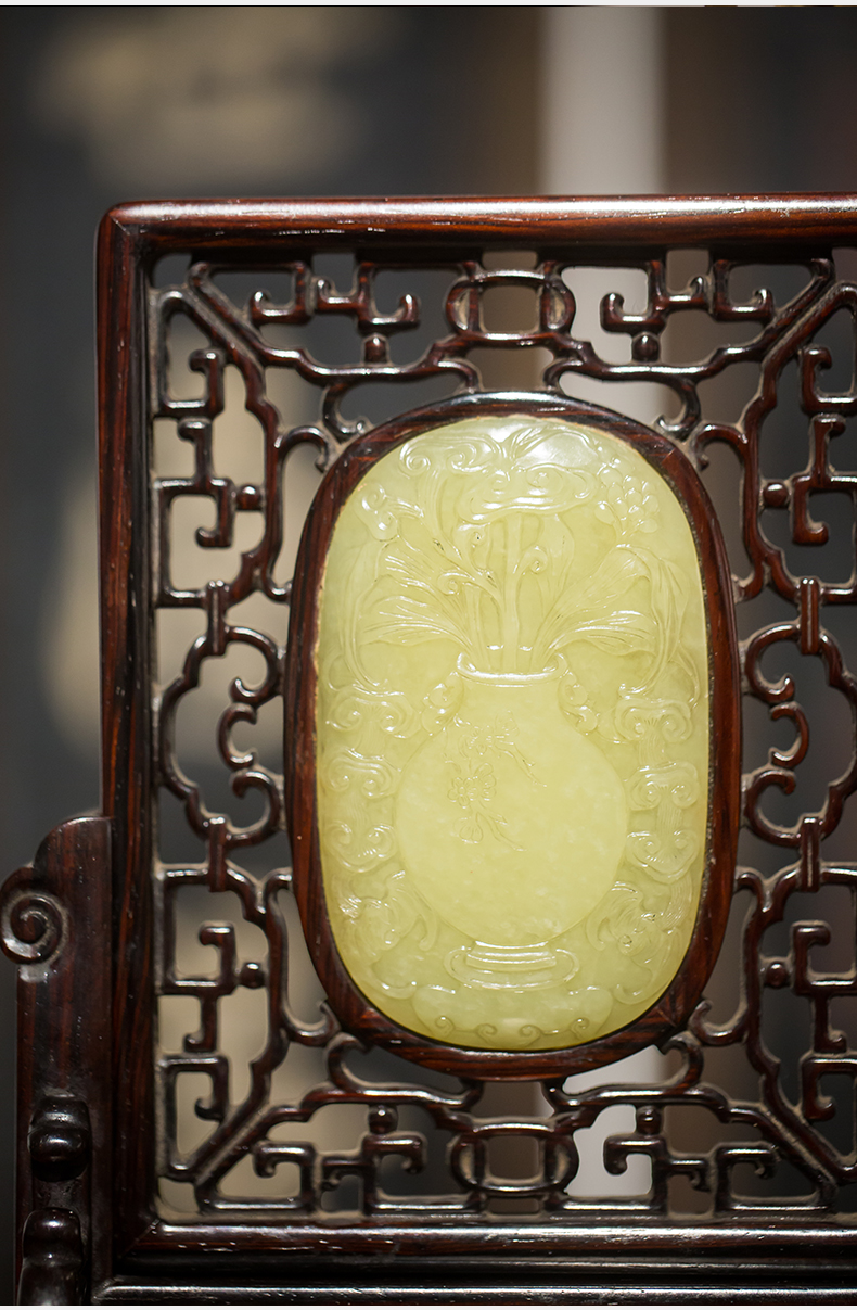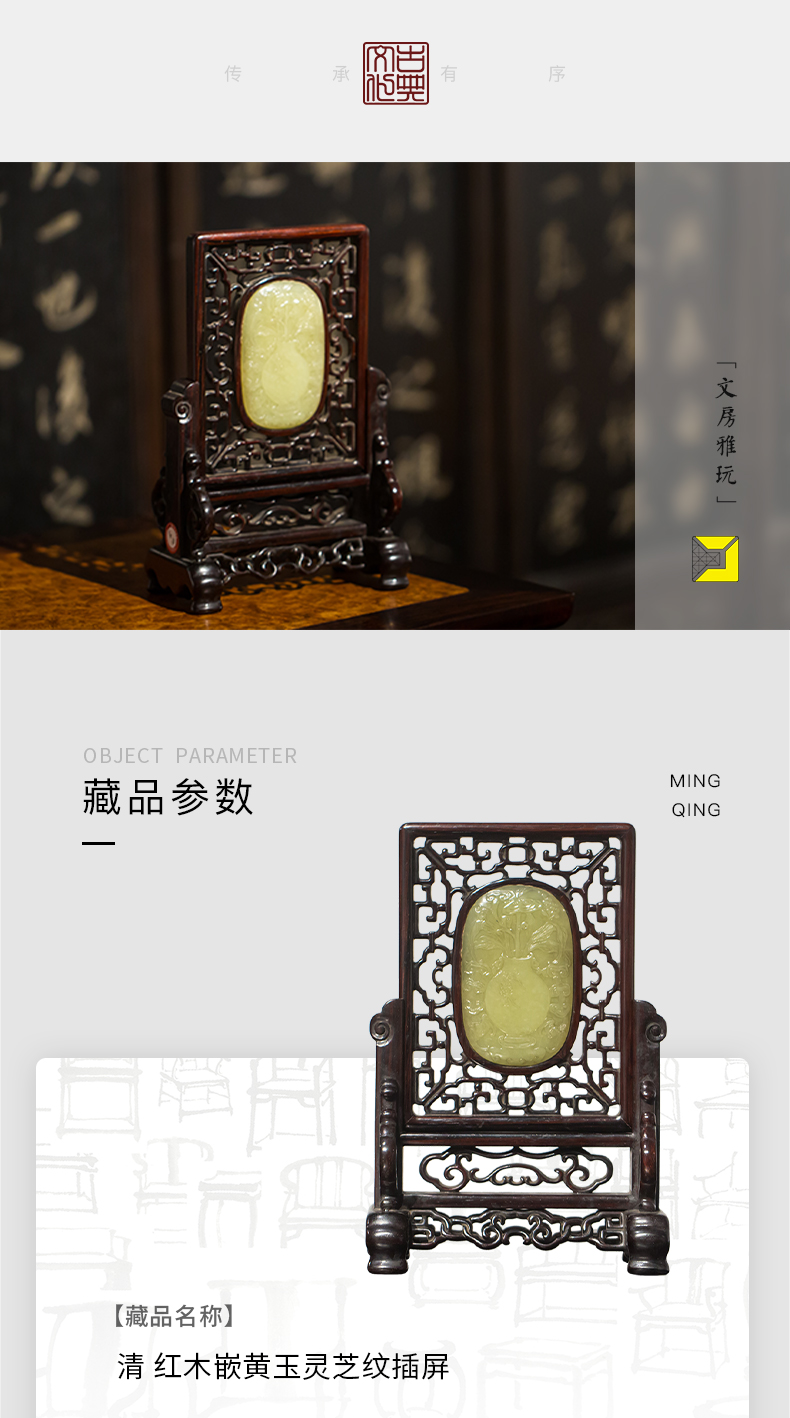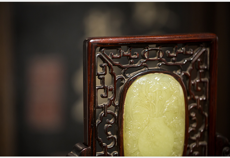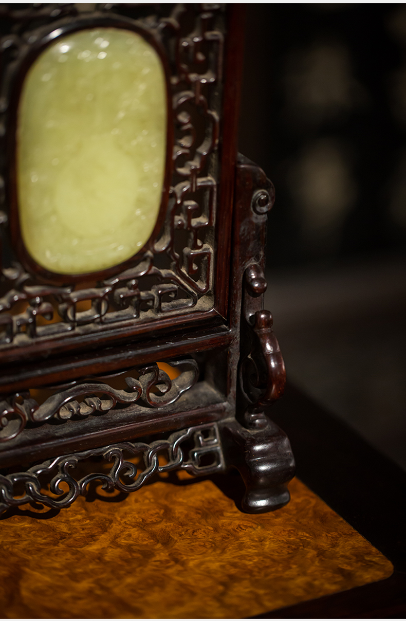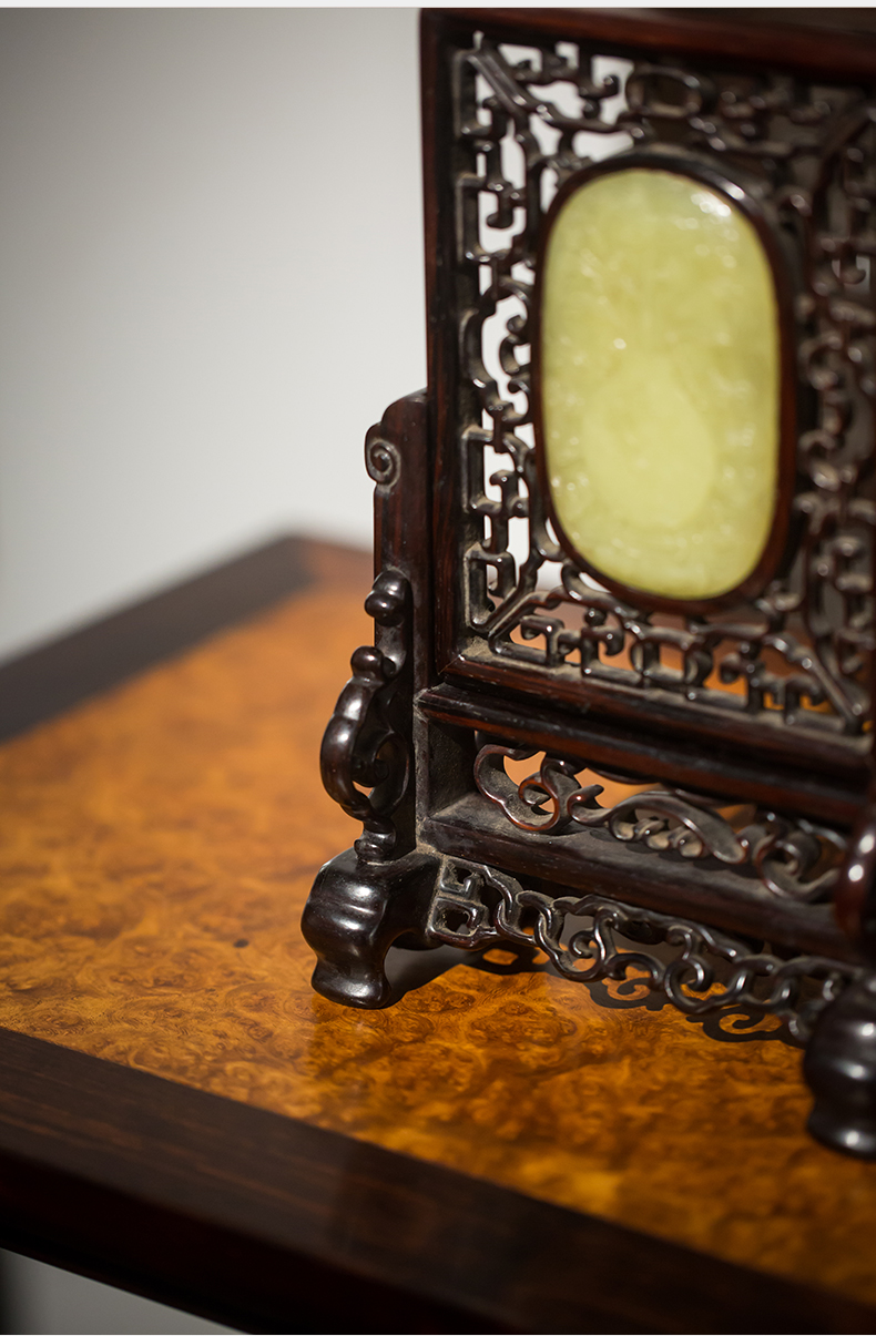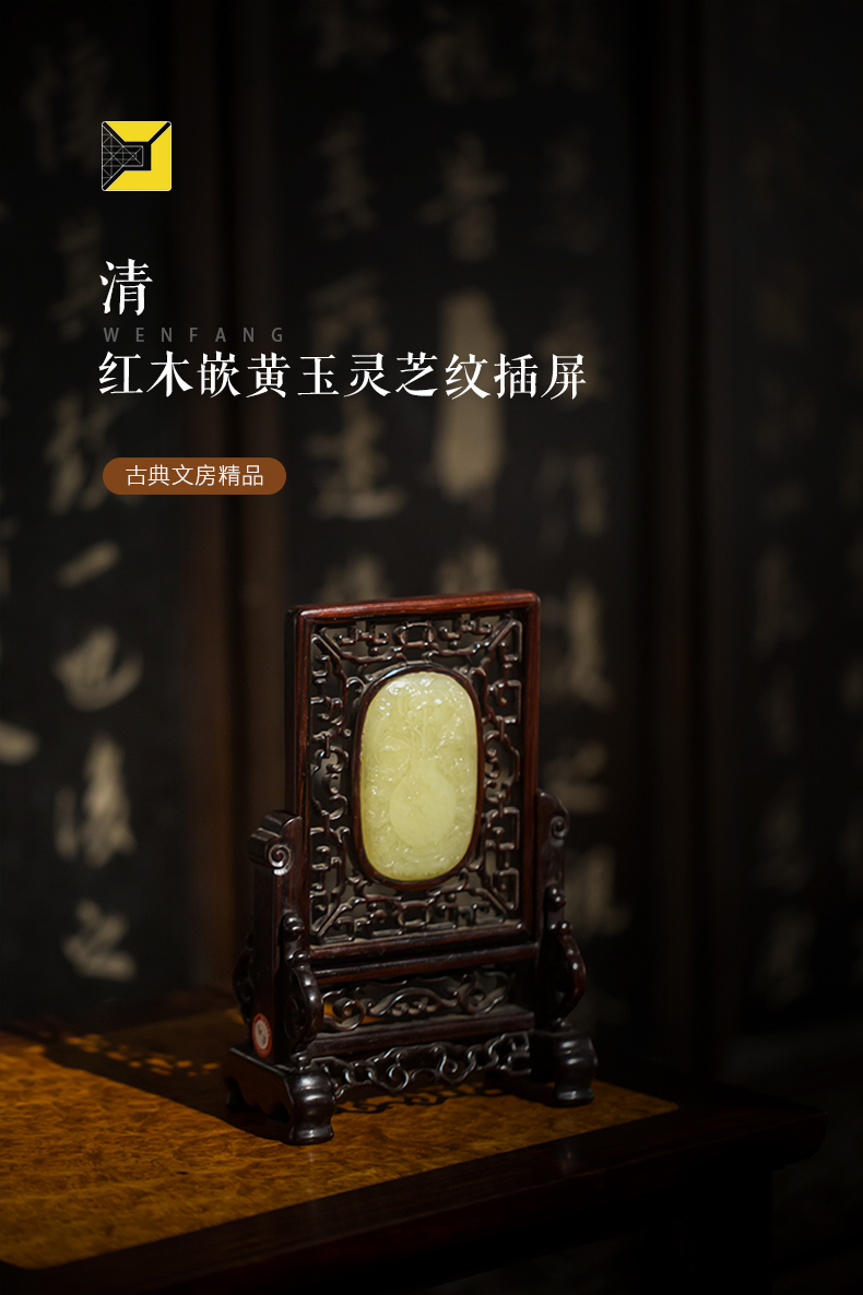 清代 红木嵌黄玉灵芝纹插屏