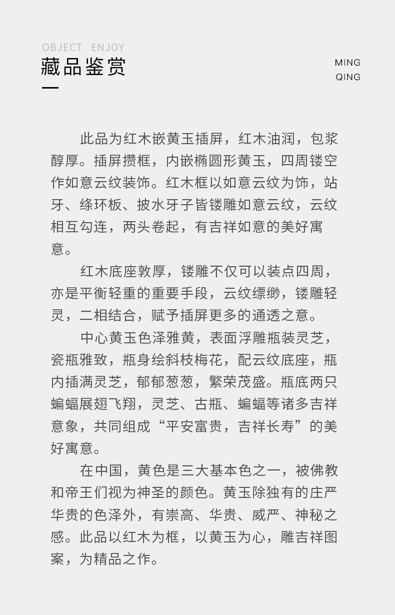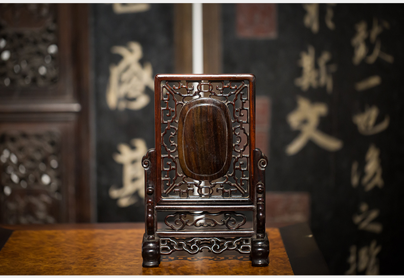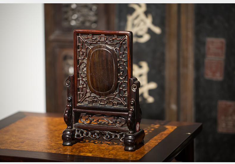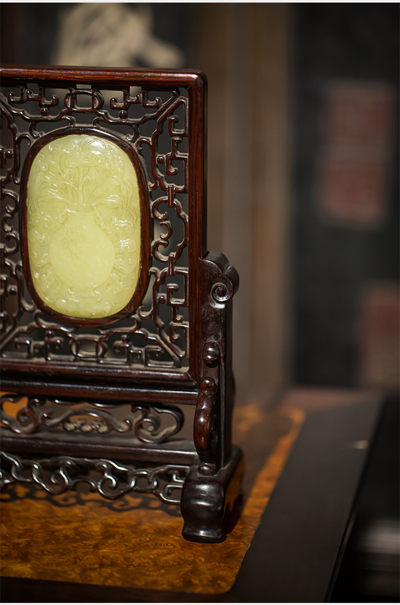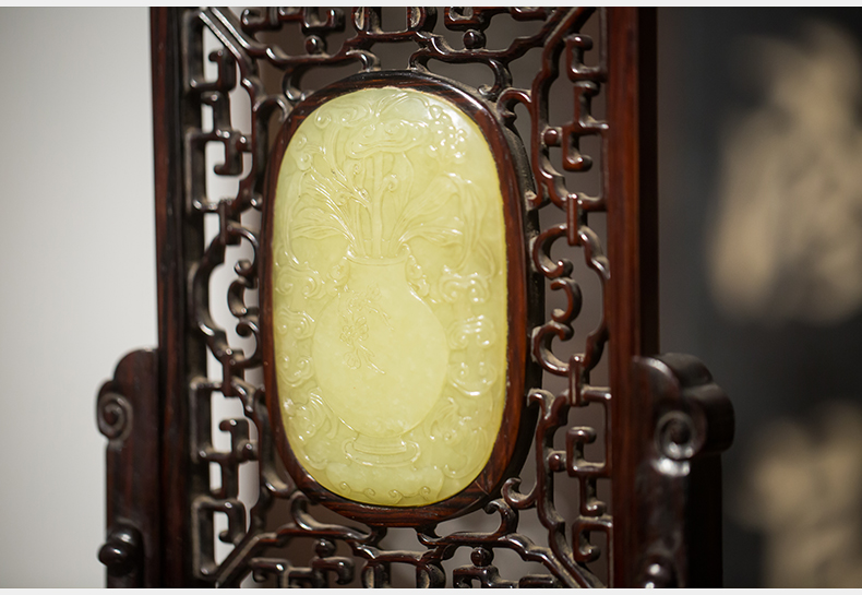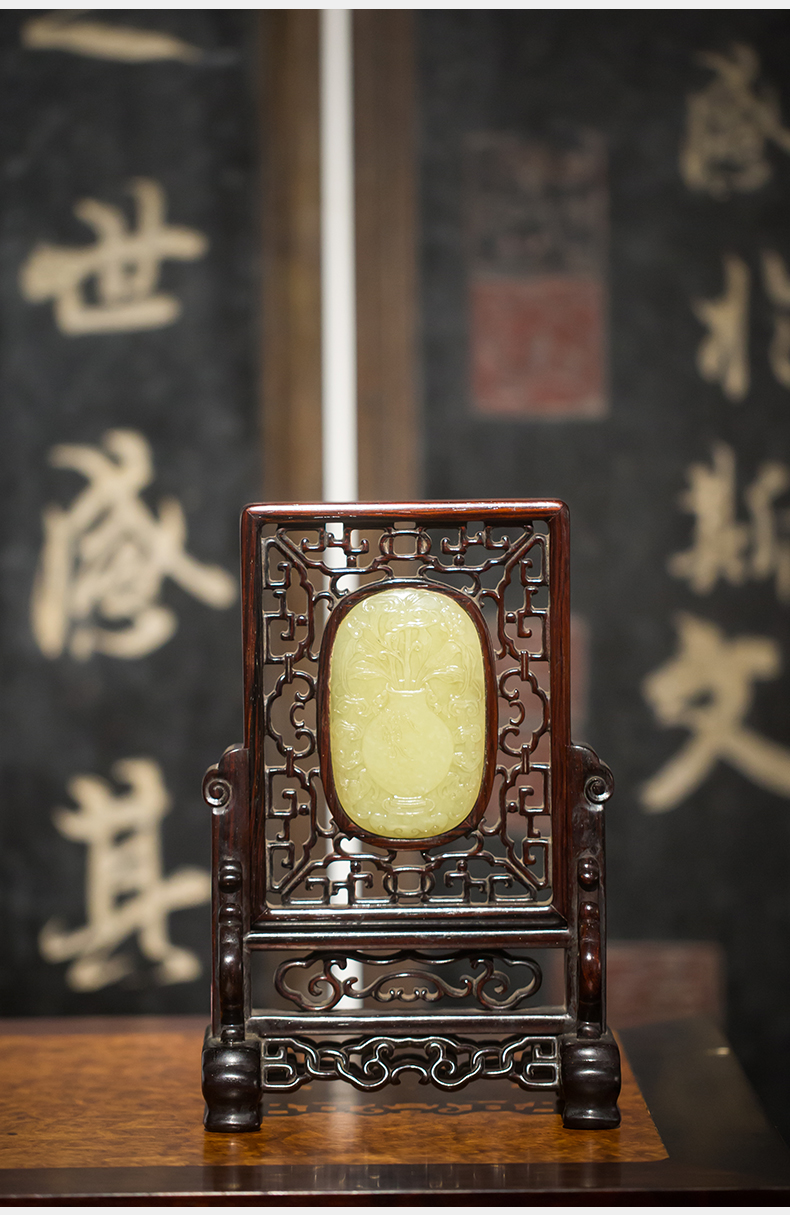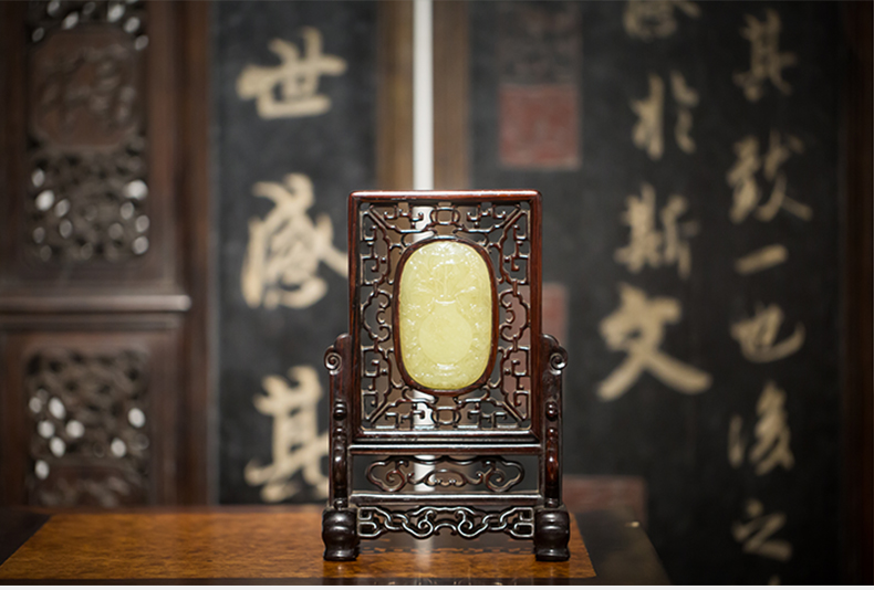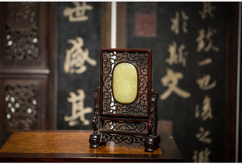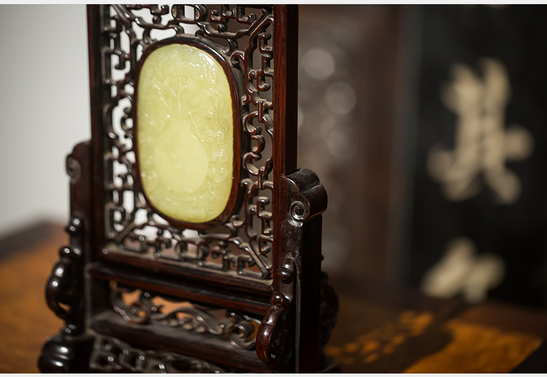 清代 红木嵌黄玉灵芝纹插屏