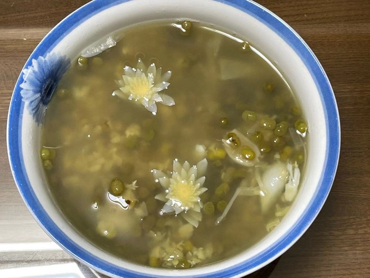 喜欢文艺范的,可以在做好的绿豆汤里。趁热加入自己做的甜酒酿。最后散入干桂花。喜欢冰着吃的,就冰镇后再散入干桂花。