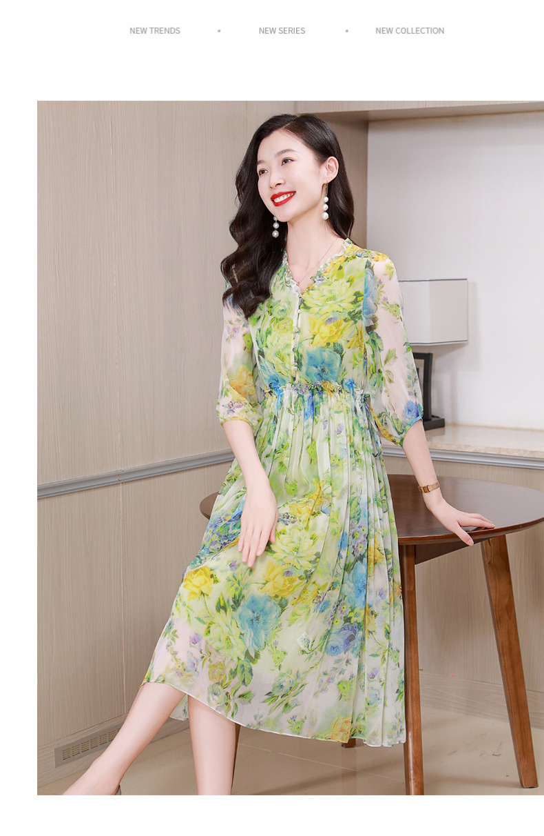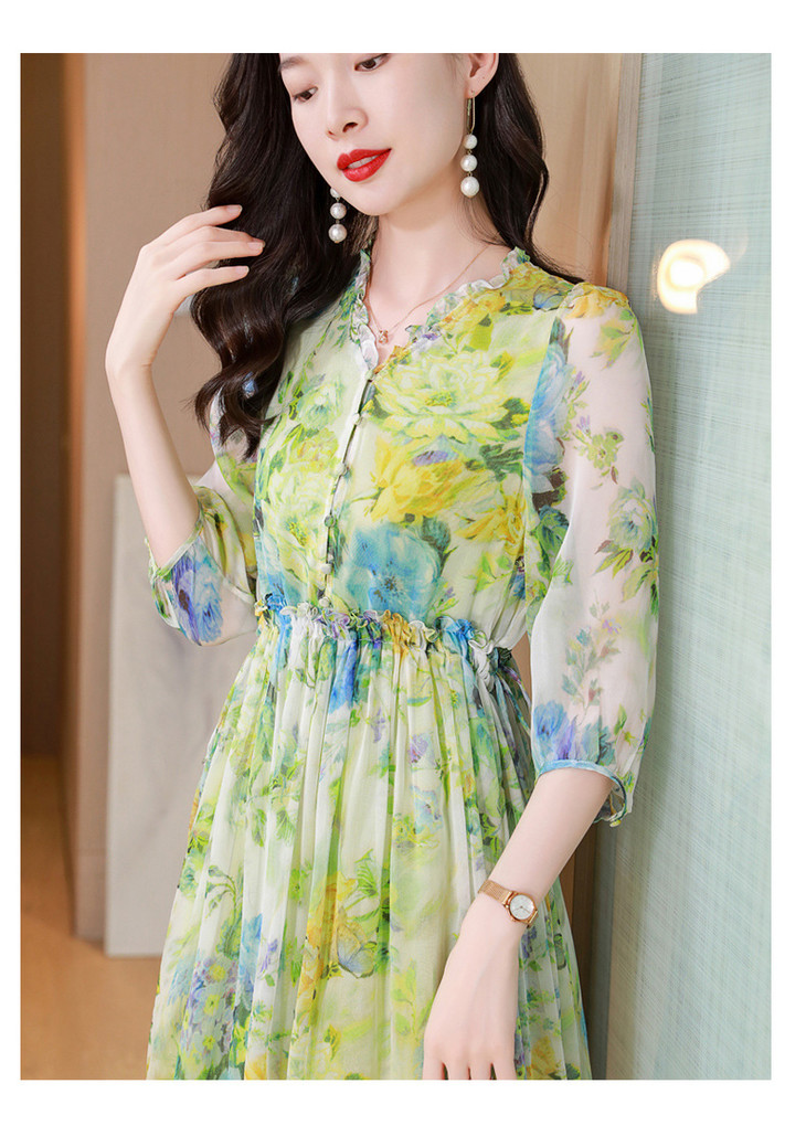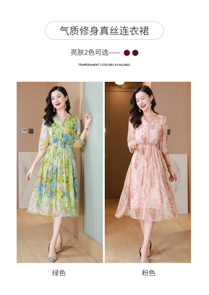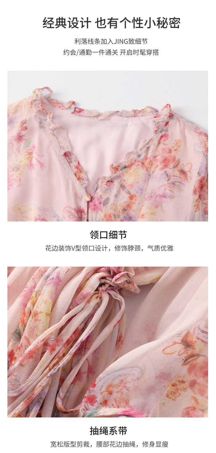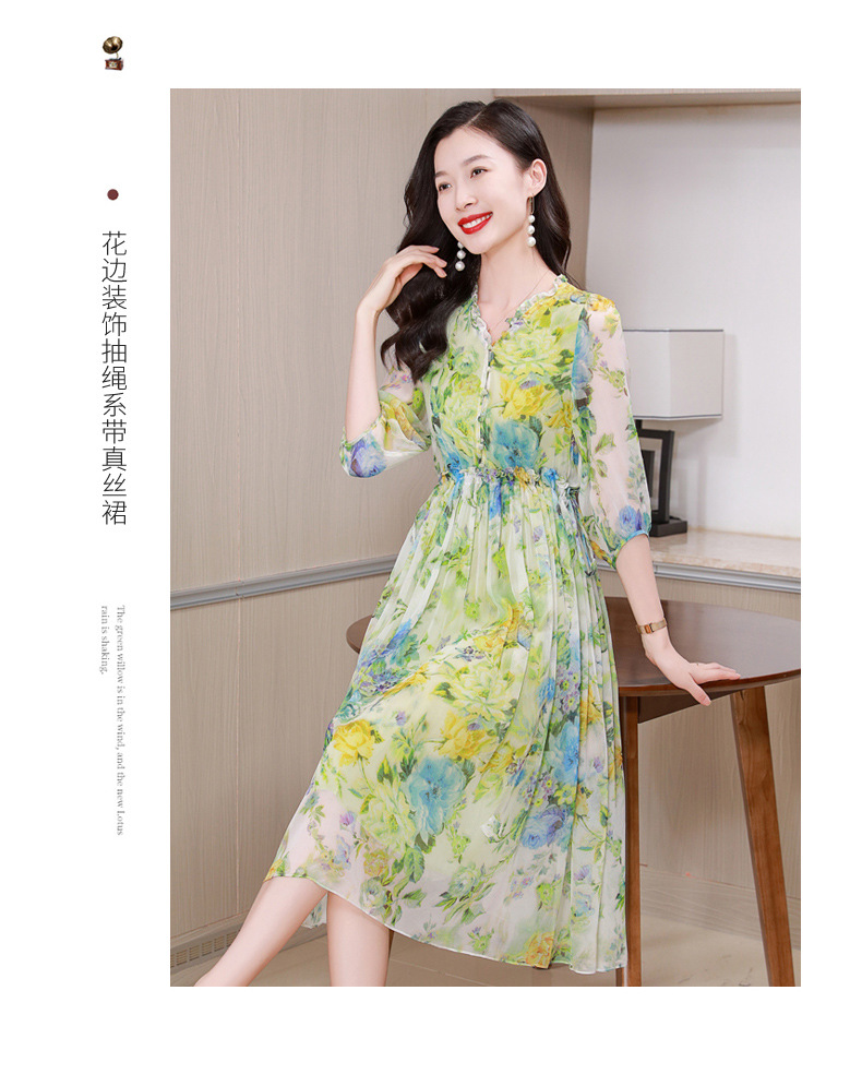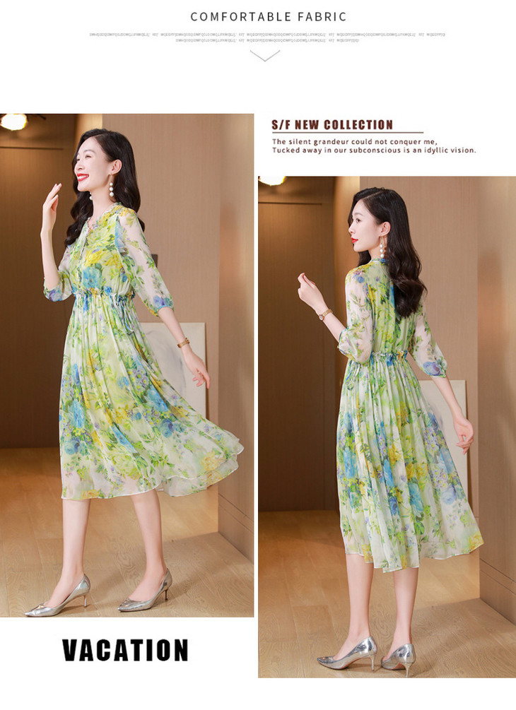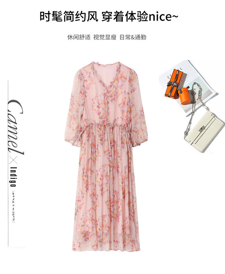 ASE重磅真丝2024夏季新款海边仙气风碎花调节腰九分袖V领真丝连衣裙