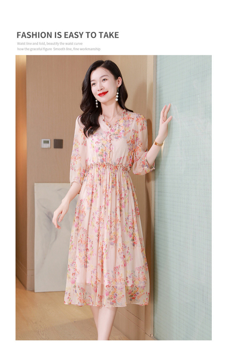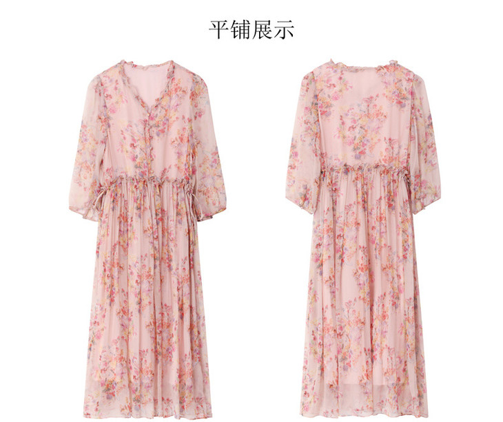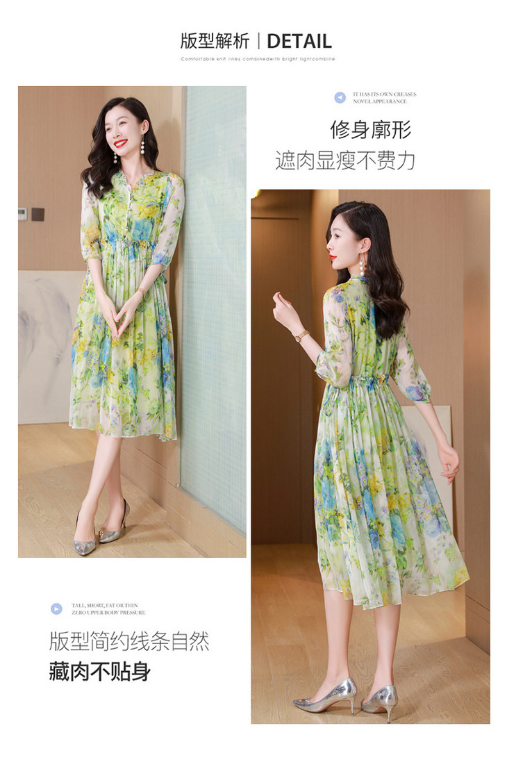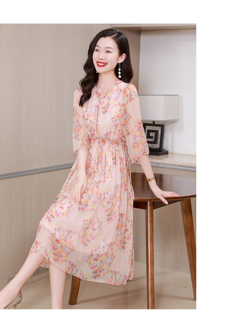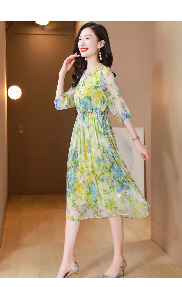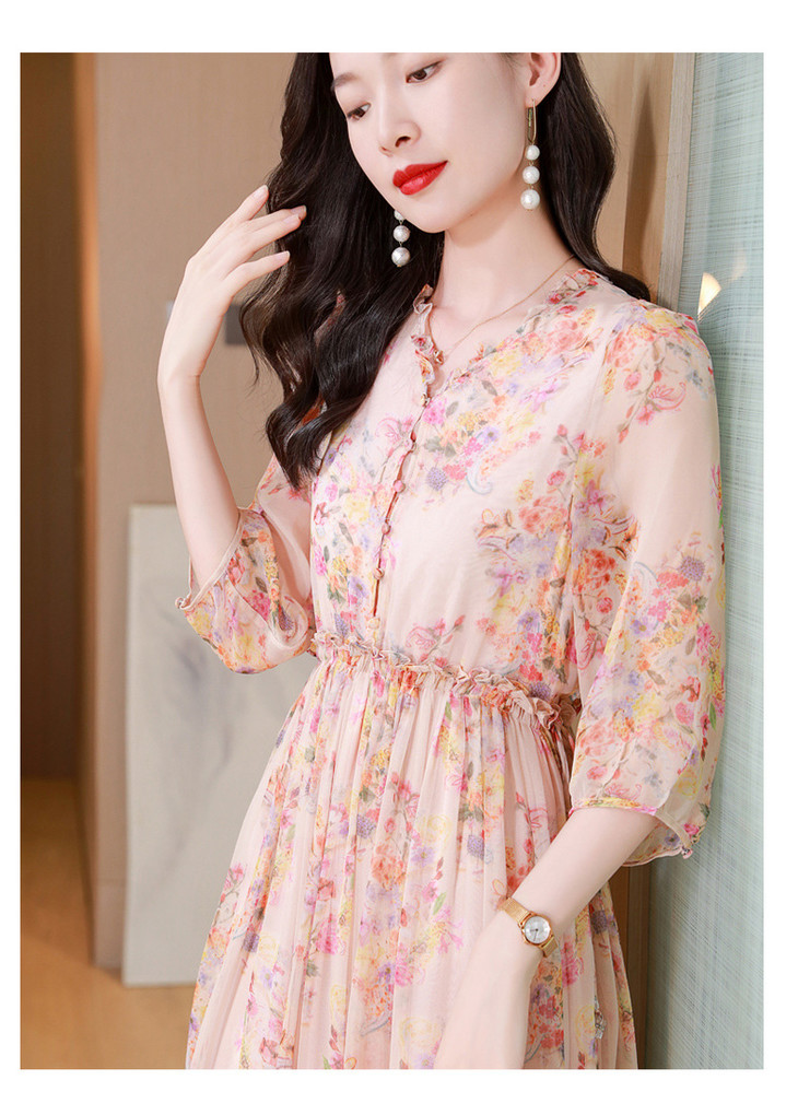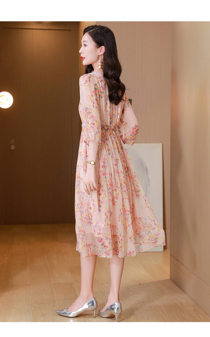 ASE重磅真丝2024夏季新款海边仙气风碎花调节腰九分袖V领真丝连衣裙