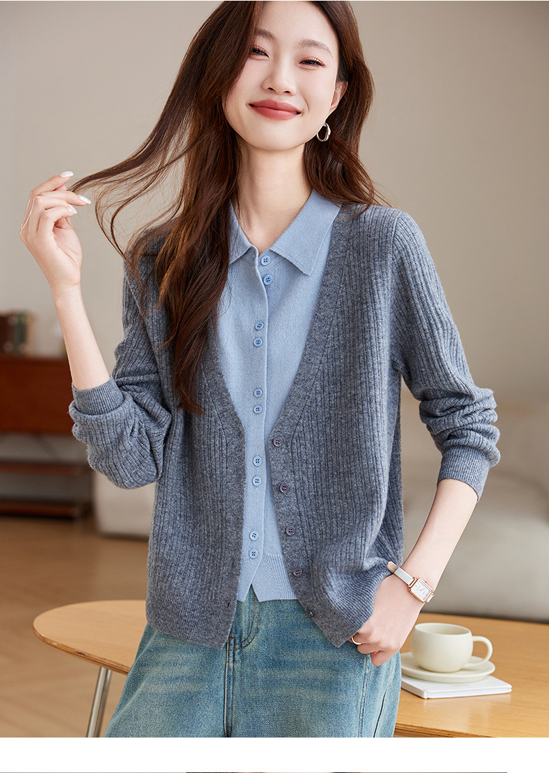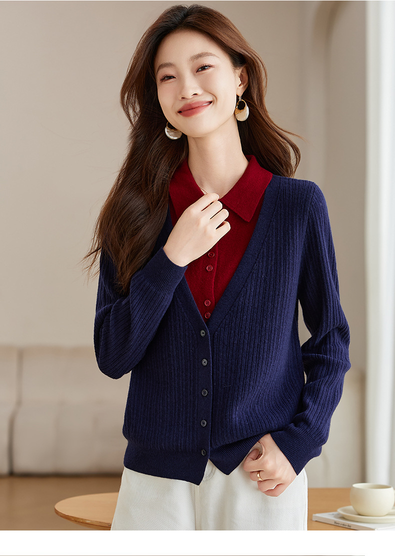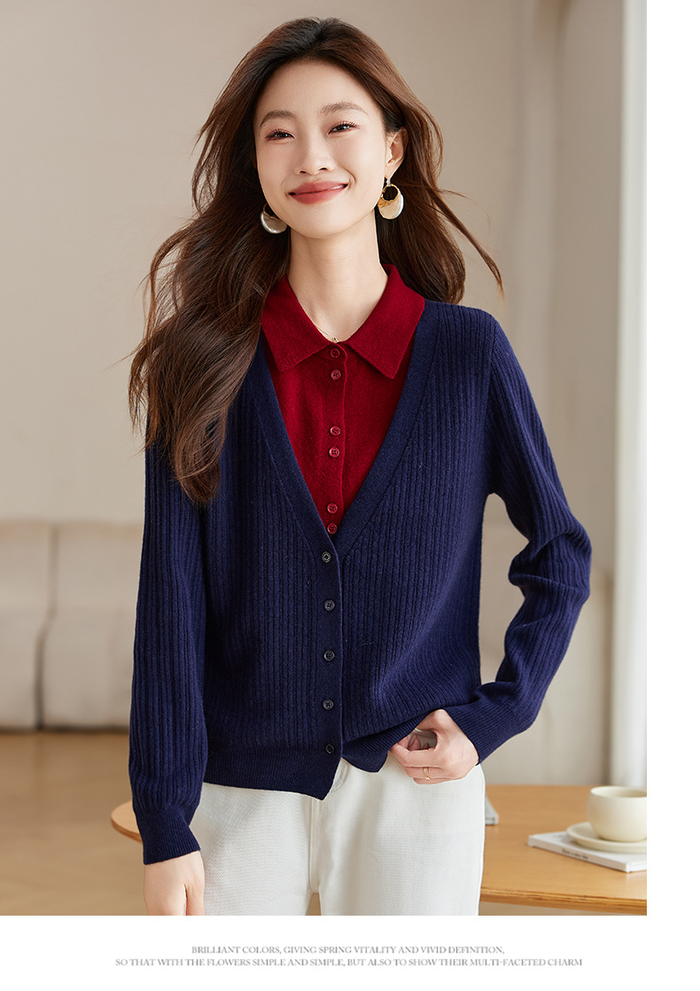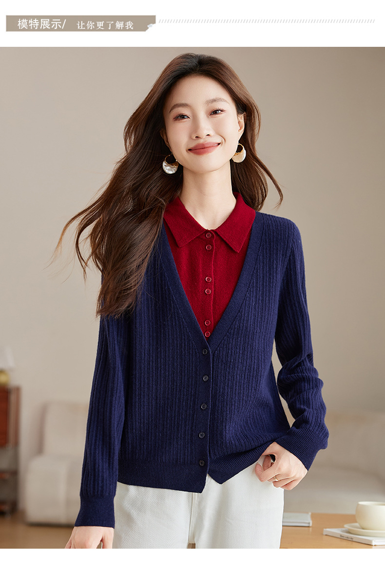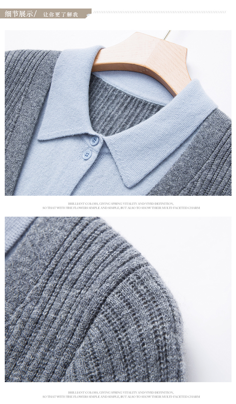 CC-J969假两件叠穿拼接衬衫领上衣纯羊毛针织开衫女春秋短款毛衣外套薄