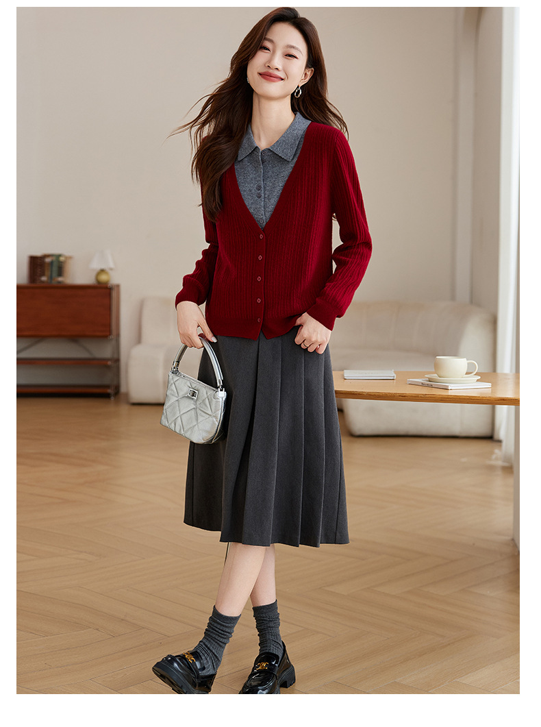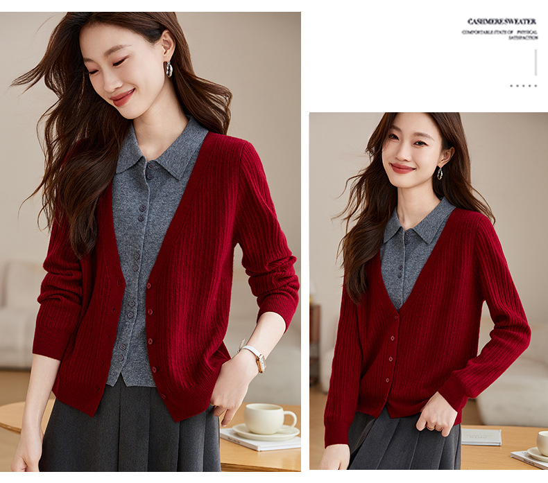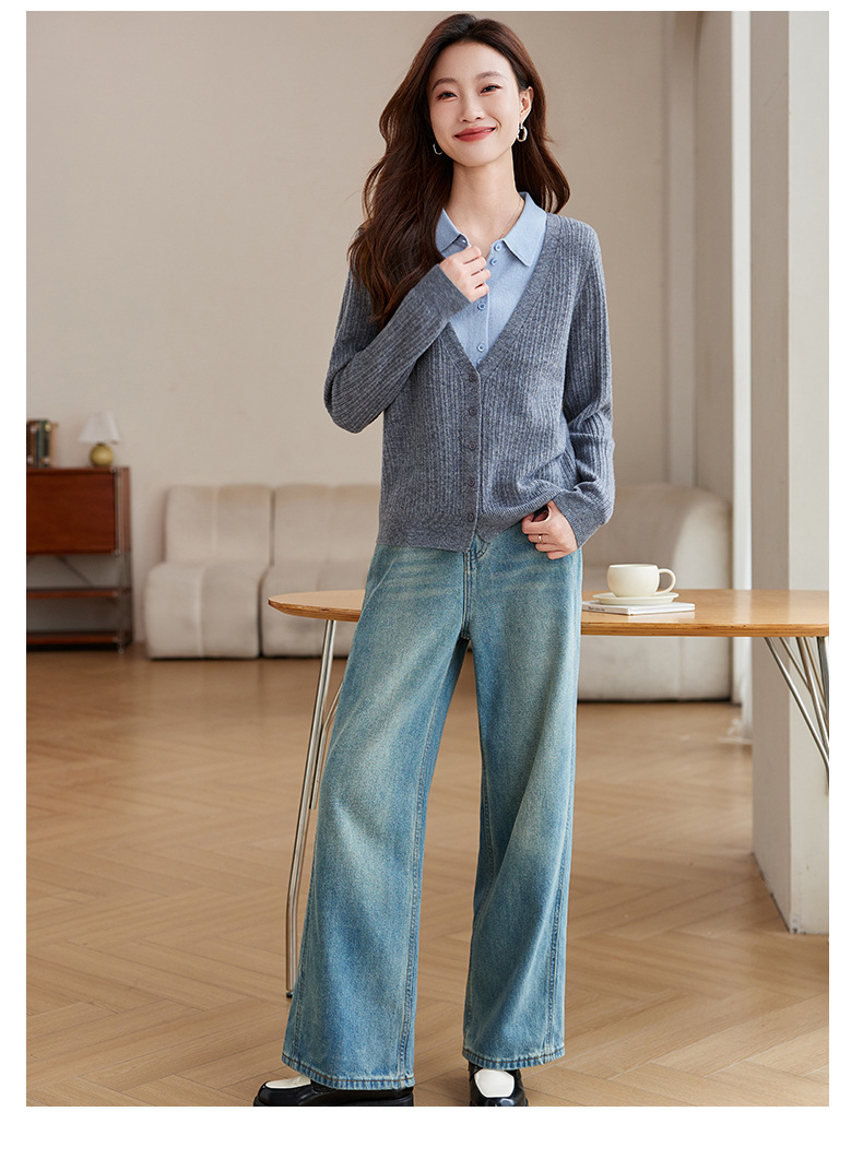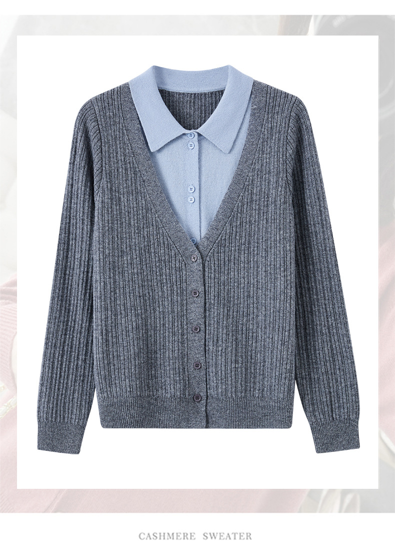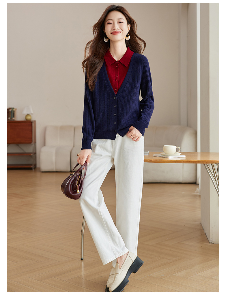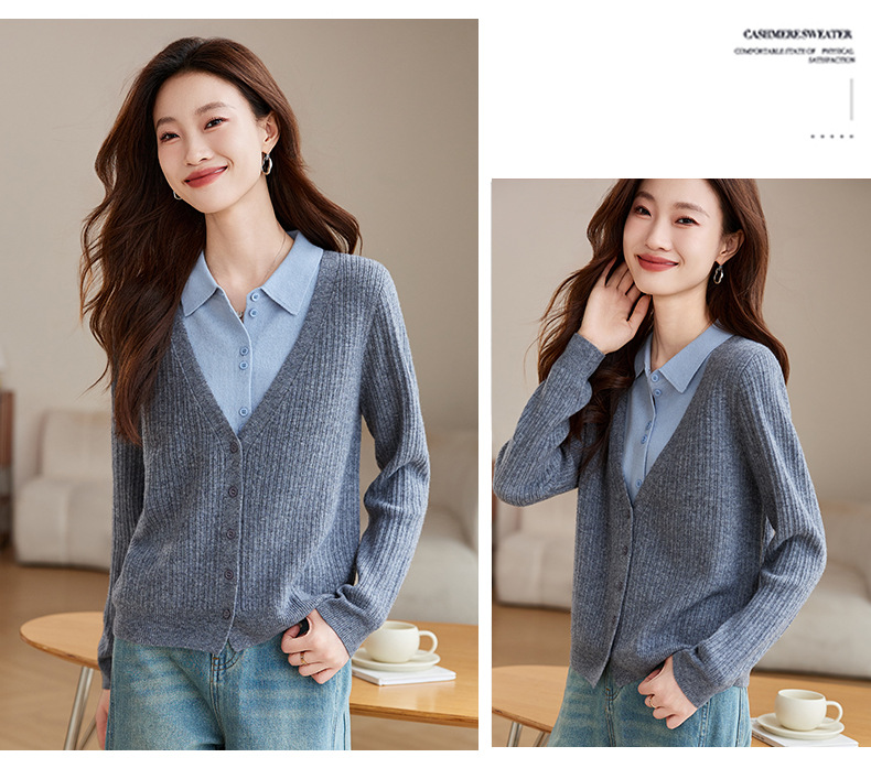 CC-J969假两件叠穿拼接衬衫领上衣纯羊毛针织开衫女春秋短款毛衣外套薄