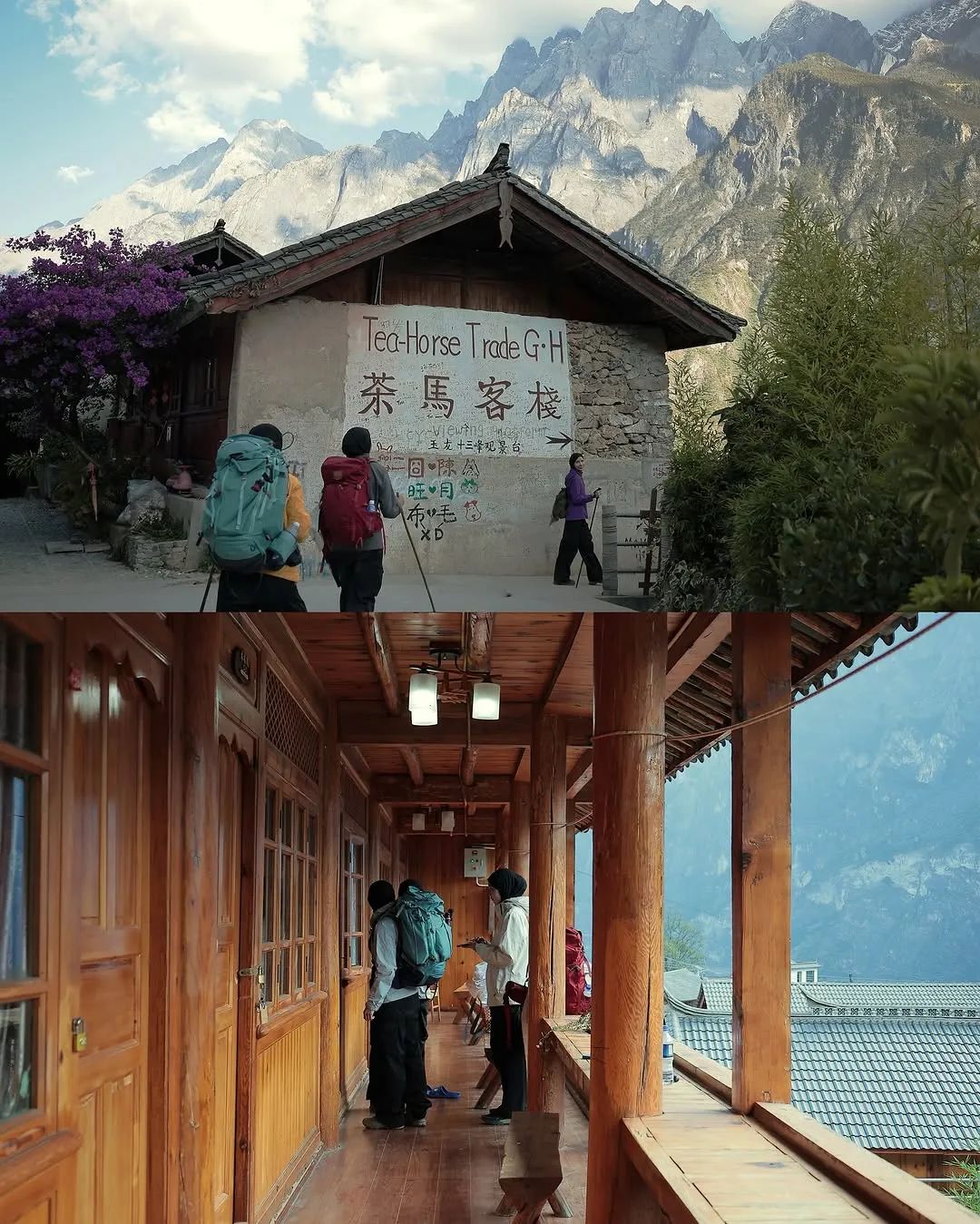 茶马客栈是滇藏茶马古道上曾经的一处驿站,对面就是玉龙雪山,也是网红客栈之一,里面有不少背包客,外国游客很多。