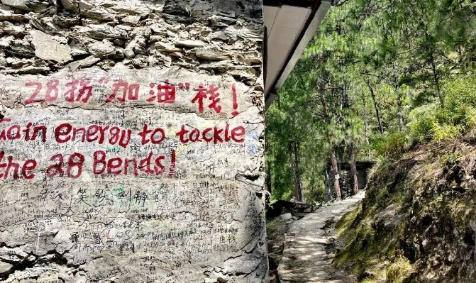 这里随处可见各国语言留下的路标,在欣赏高山峡谷的同时,可以悠闲的来一杯悬崖咖啡。之后出发茶马客栈,一直下到海拔2200米。