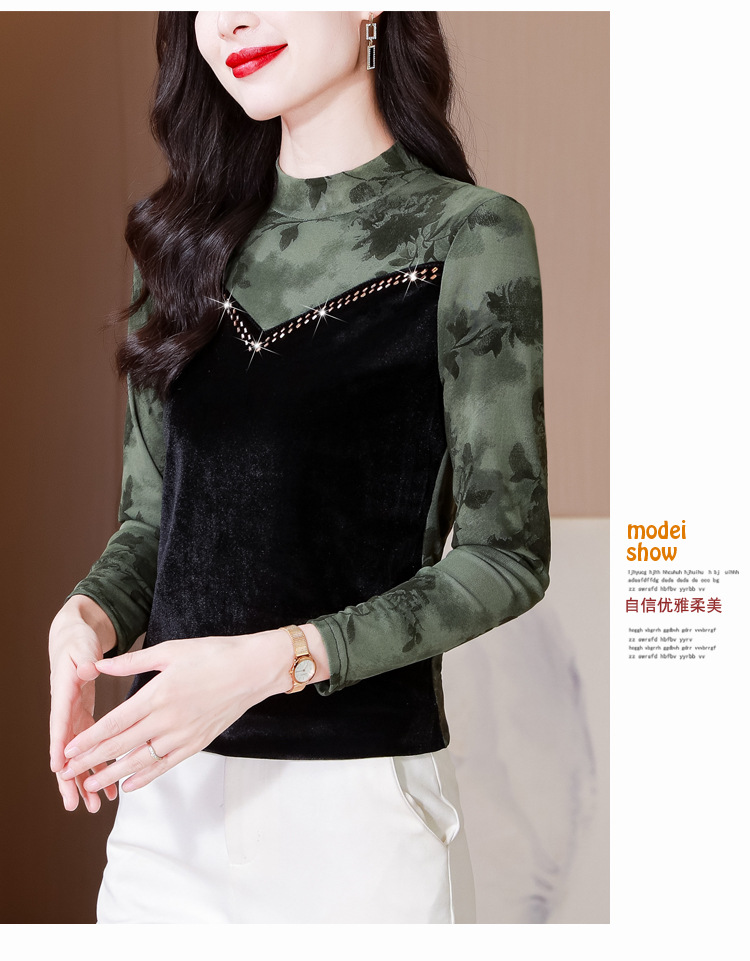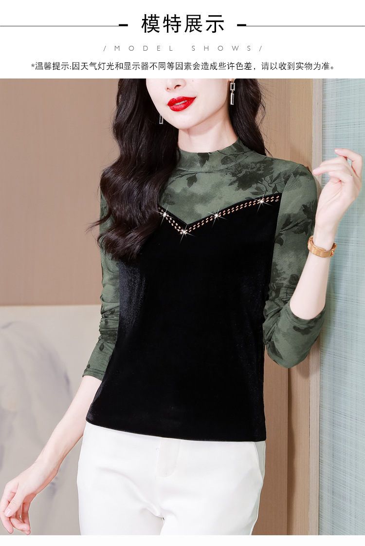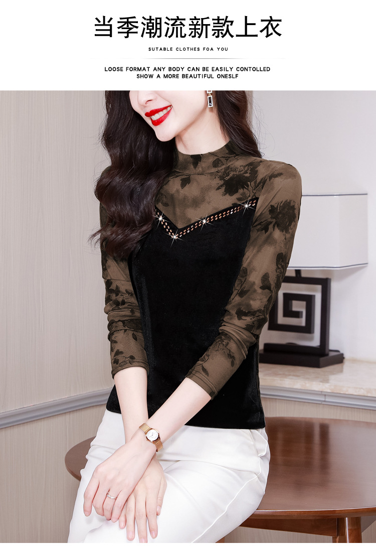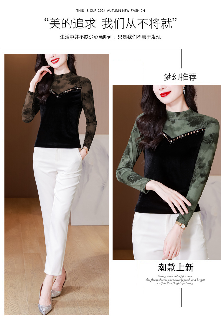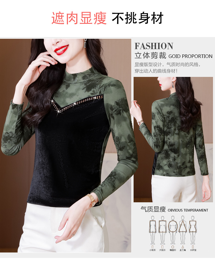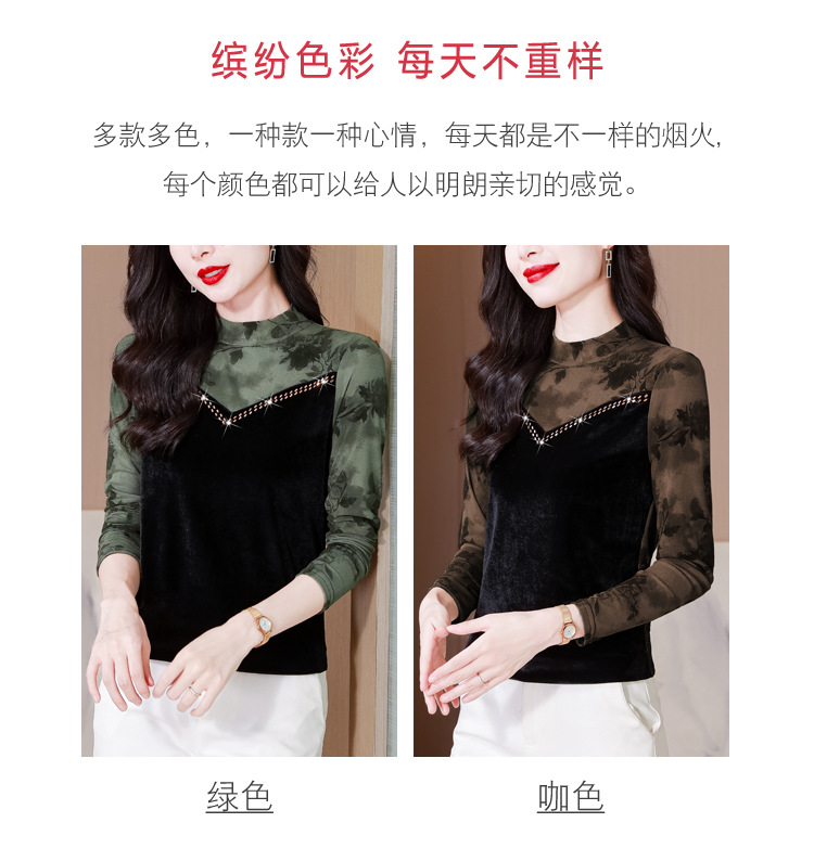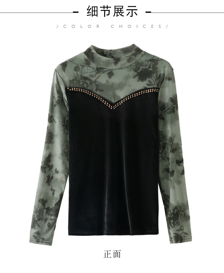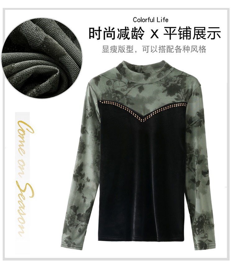 雀说印花水溶针织拼接丝绒打底衫新款时尚洋气半高领减龄上衣AL299