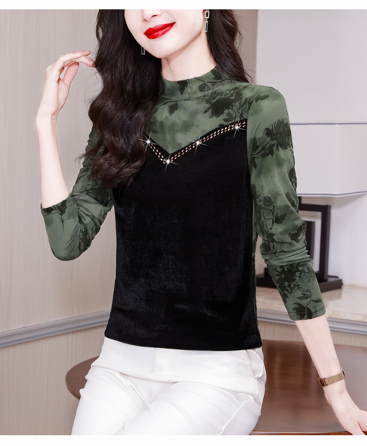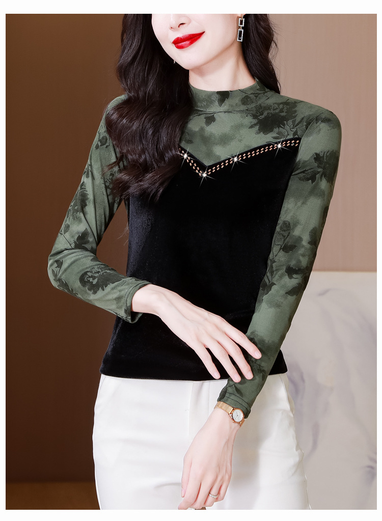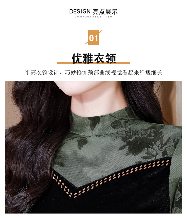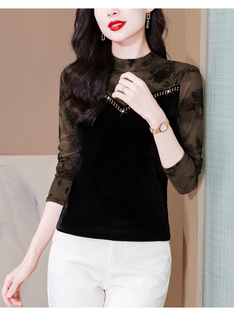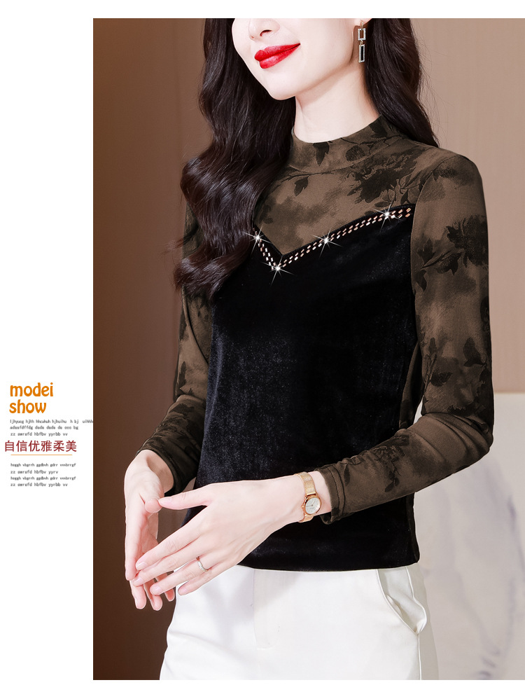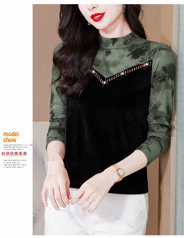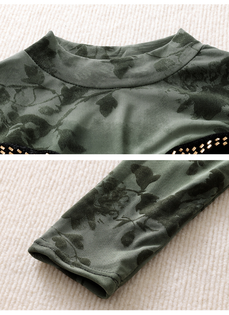 雀说印花水溶针织拼接丝绒打底衫新款时尚洋气半高领减龄上衣AL299