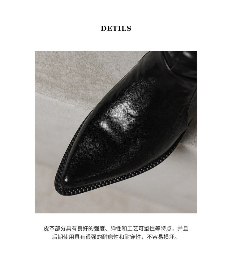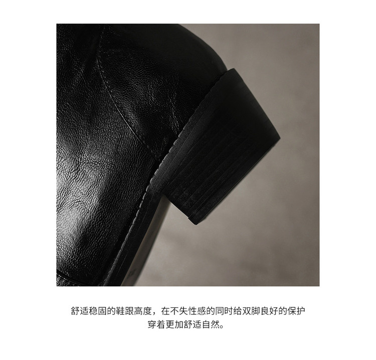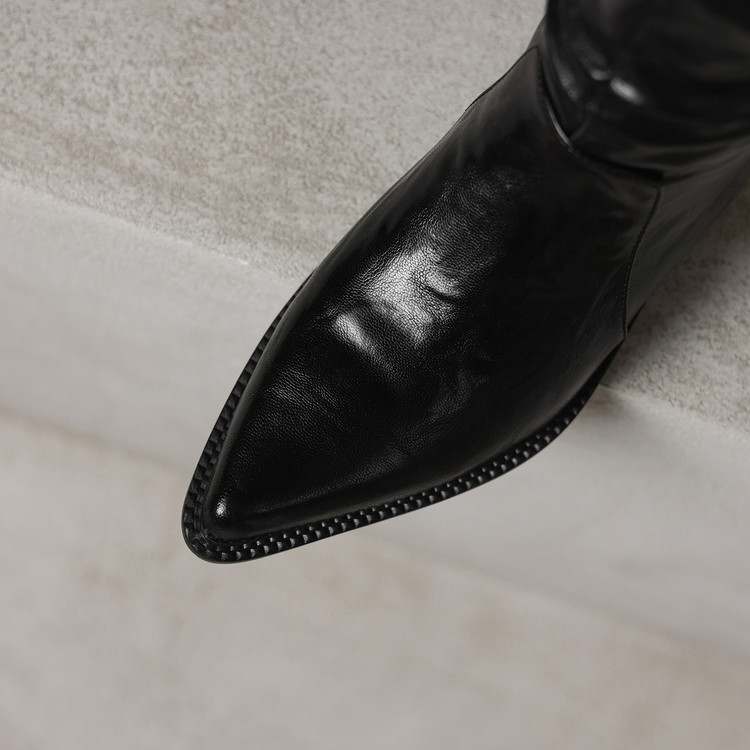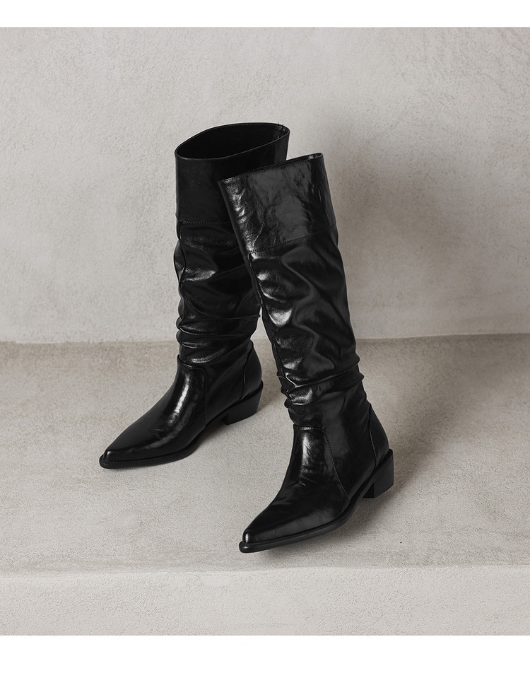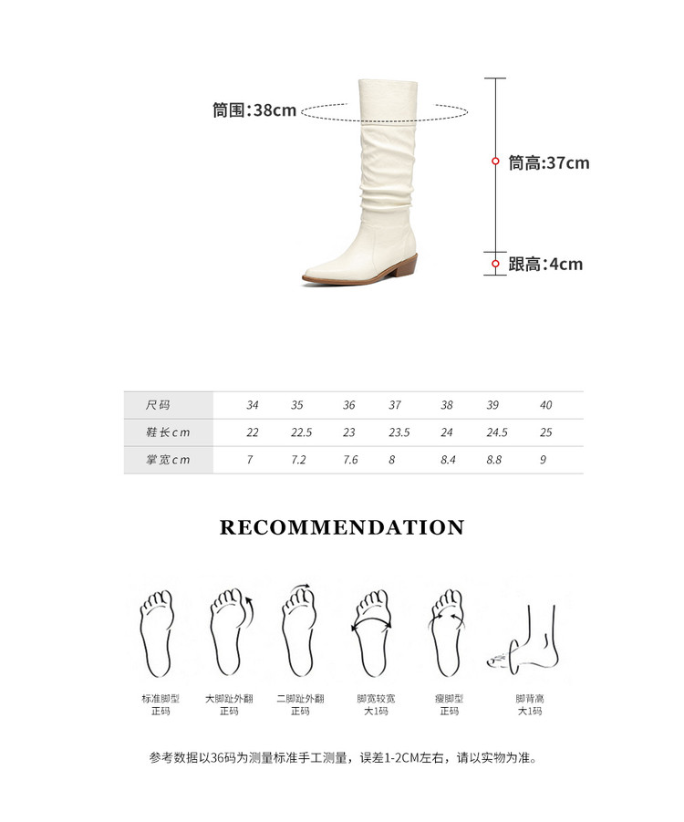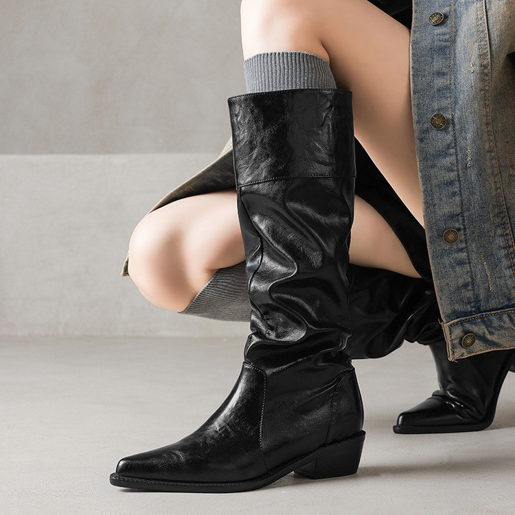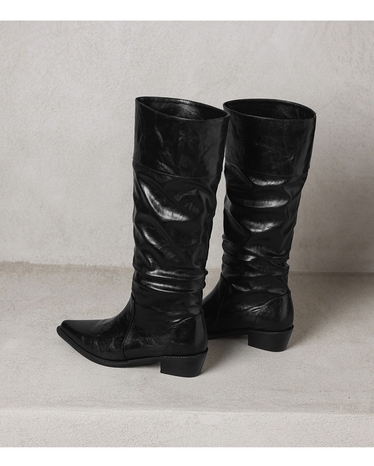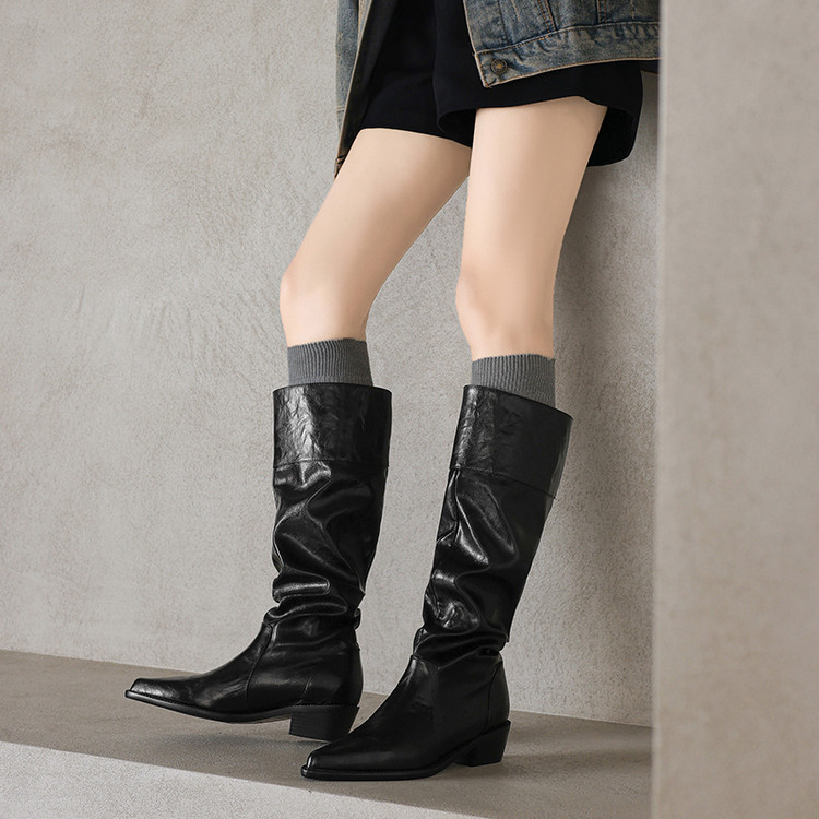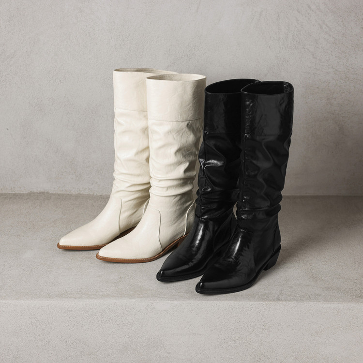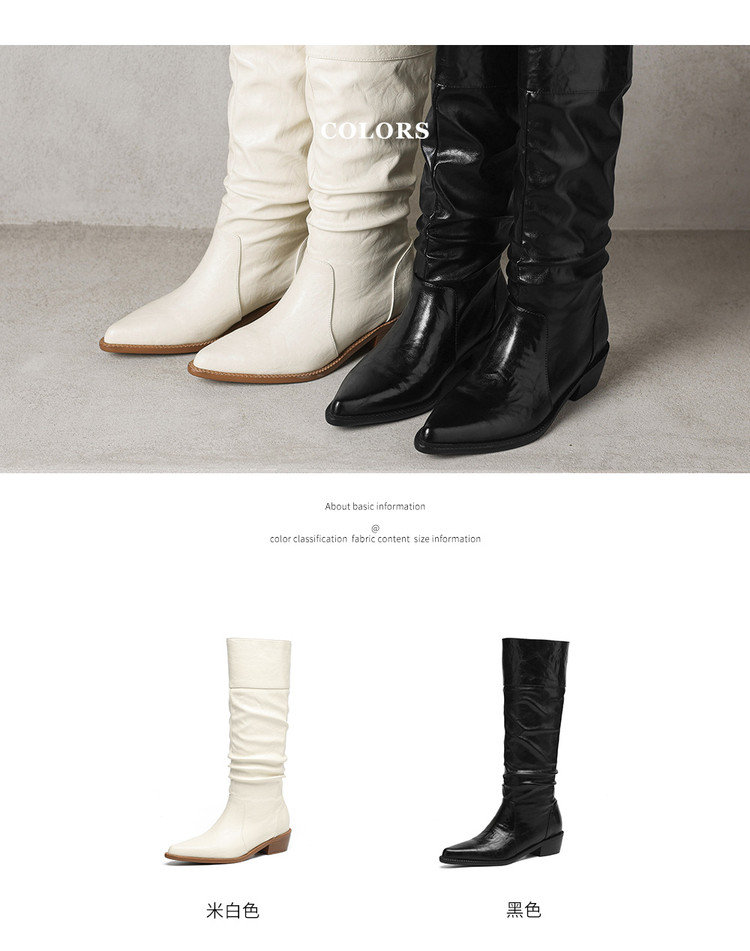 【预售7天】软糯好穿!全牛皮米白尖头粗跟大筒围皱皱高筒靴MNLS&D2563