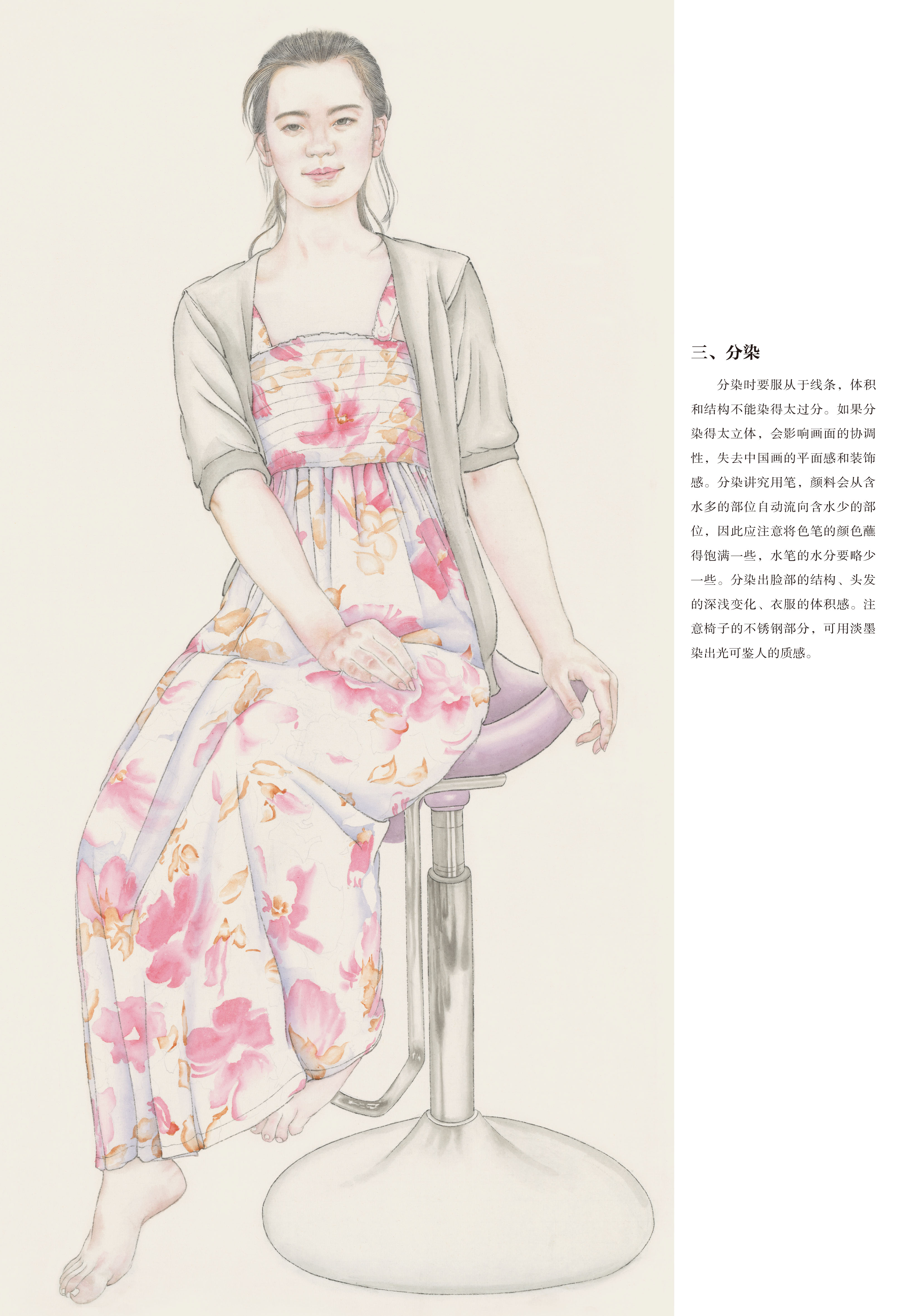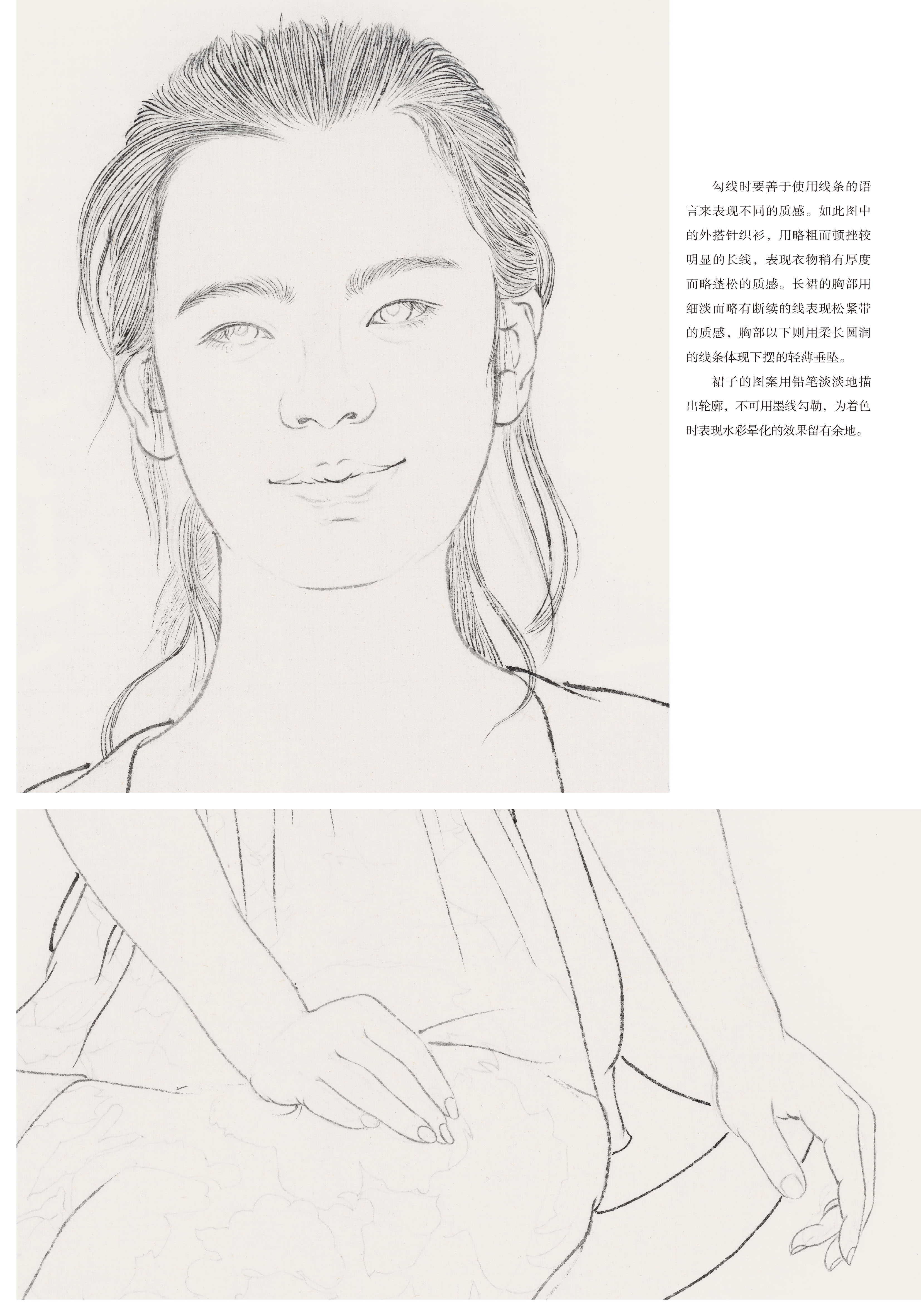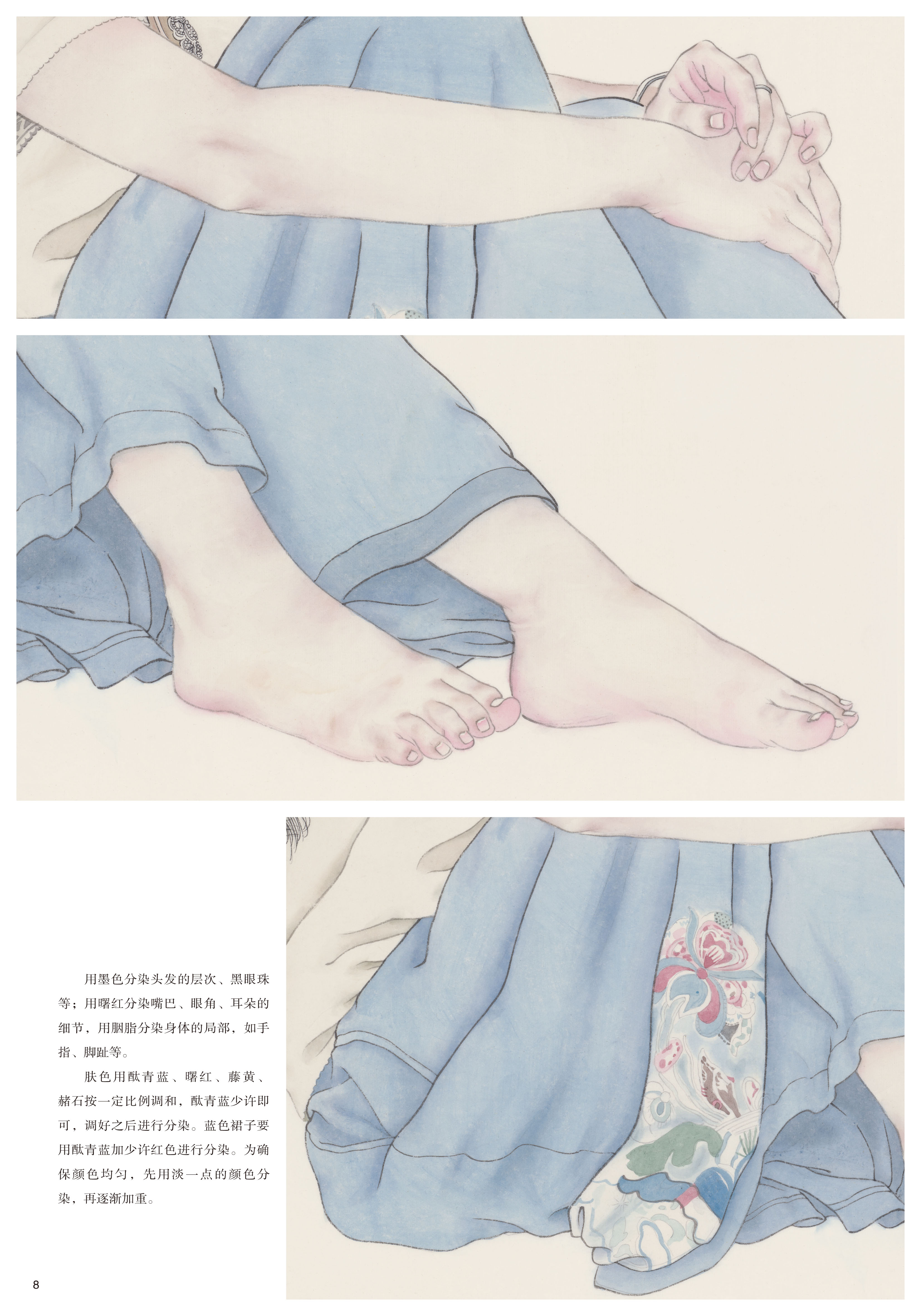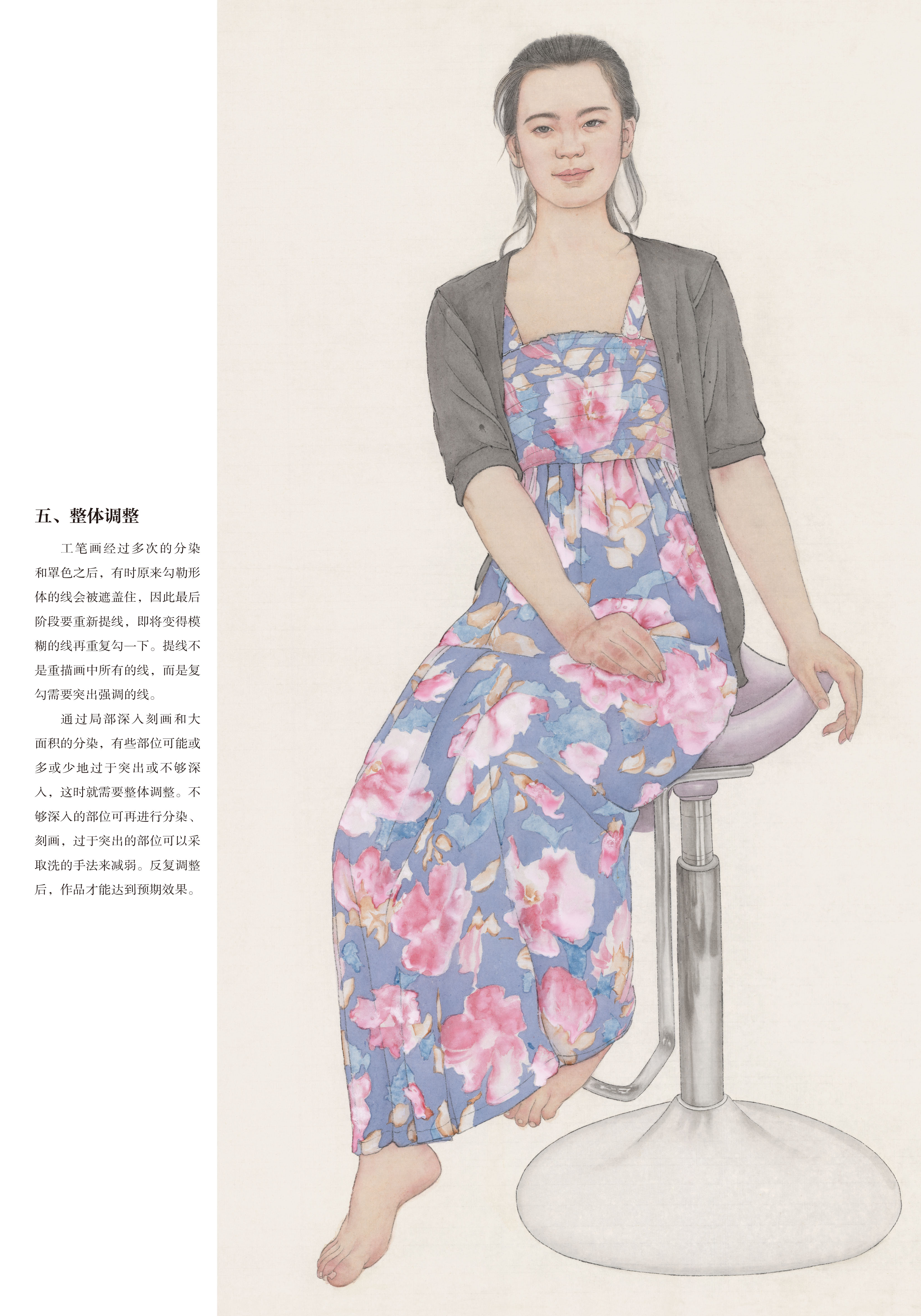 这套书是为学习工笔人物画的读者量身打造,贴合使用者的需求。无论是在校学生、业余爱好者还是老年大学学生,这套书都能适用。每册书包含两幅作品,经过精心搭配,或为青年搭配老年,或为女生搭配男生,在动态的搭配上也做了考量,一般为坐姿搭配站姿,人物的角度、朝向也有区别,这样可以使每位购书的读者根据自己练习的需要和审美喜好来选择。每幅作品分素描稿、线描、分染、罩染、整体调整五个步骤,均使用高清大图,印刷精美,纤毫毕现,无论是起稿、勾线,还是染色,都可以看到最精确的细节。实为学习工笔人物画的上佳范本。
