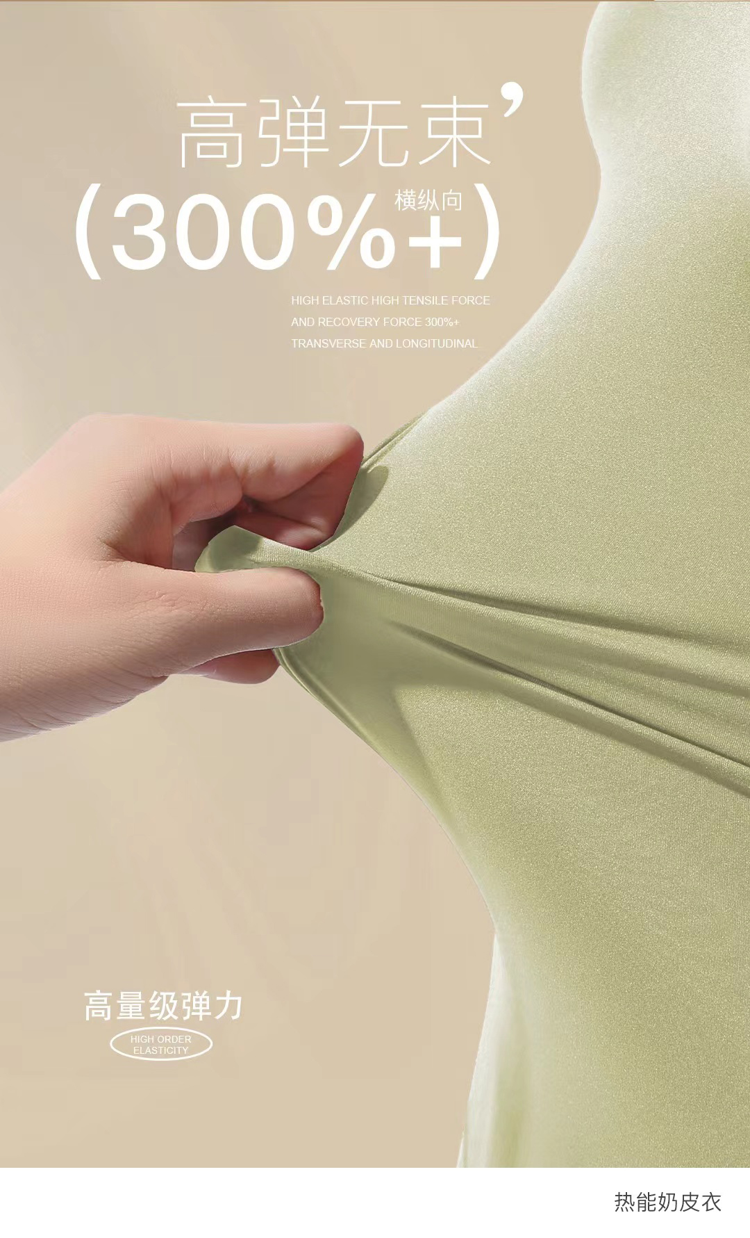 1.黑科技隐形热能奶皮衣、集四大核心功能一体的一款打底衣,暖(热量循环蓄热锁温)/润(添加胶原蛋白、为肌肤补充滋养),薄(厚度仅仅只有0.03mm.足够贴身)/弹(横纵向拉伸恢复力300%➕自由无束)